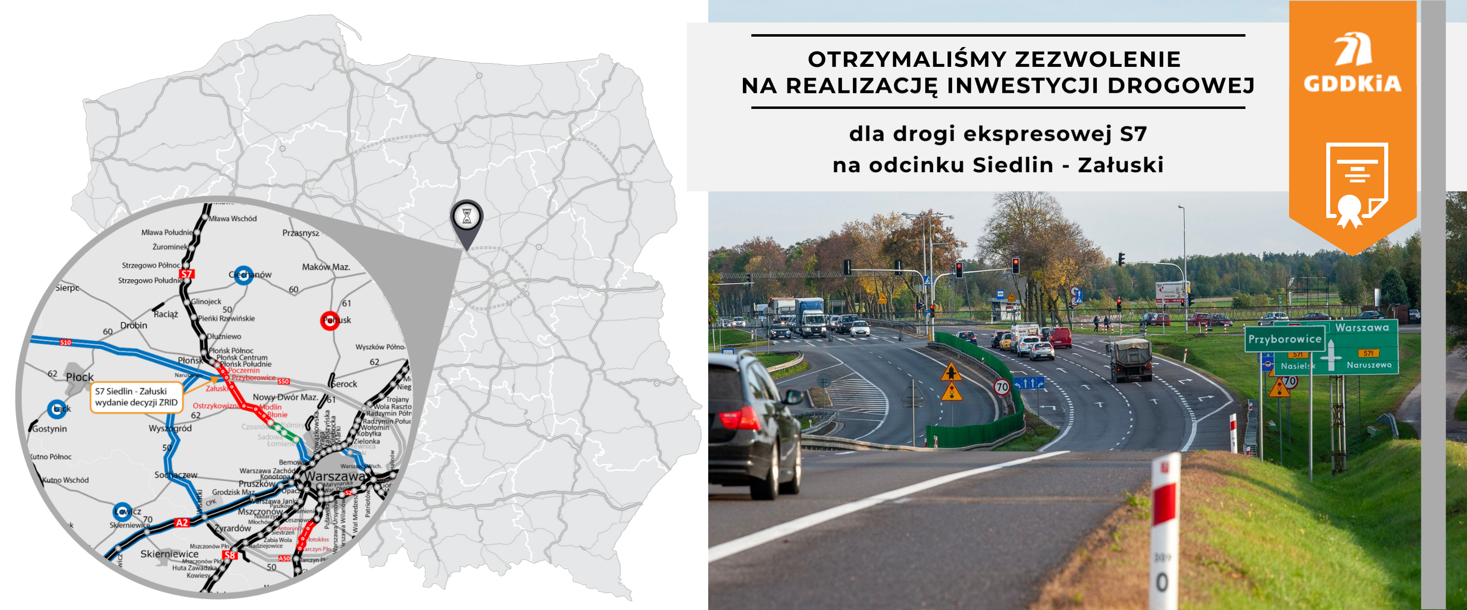Wojewoda Mazowiecki wydał decyzję o zezwoleniu na realizację inwestycji drogowej (ZRID) na ok. 13 km drogi ekspresowej S7 Siedlin - Załuski. Umożliwi to uruchomienie procedur odszkodowawczych za przejęte nieruchomości pod budowę drogi, a także rozpoczęcie pełnego frontu robót w terenie. Niezwłocznie przekażemy wykonawcy plac budowy. Na sąsiednich odcinkach już trwają roboty.
