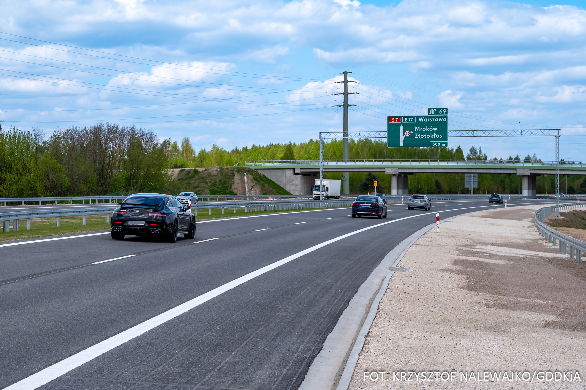 Udostępniliśmy do ruchu obie jezdnie w pełnym przekroju dwóch pasów na odcinku ponad 17-kilometrów trasy pomiędzy węzłami Lesznowola i Tarczyn Południe. Tym samym połączyliśmy funkcjonujące już odcinki S7 od strony Warszawy i Grójca, a dwujezdniową drogą dojedziemy do położonej blisko 230 km dalej granicy województw świętokrzyskiego i małopolskiego. Udostępniliśmy węzeł Złotokłos, a na sąsiednich odcinkach pełną funkcjonalność zyskały węzły Lesznowola oraz Tarczyn Południe. To pierwszy etap udostępniania trasy do ruchu i za sprawą trwających prac przy dwóch kolejnych węzłach (Antoninów i Tarczyn Północ), drogach serwisowych i lokalnych, a także w najbliższym sąsiedztwie trasy głównej obowiązuje ograniczenie prędkości do 80 km/h.