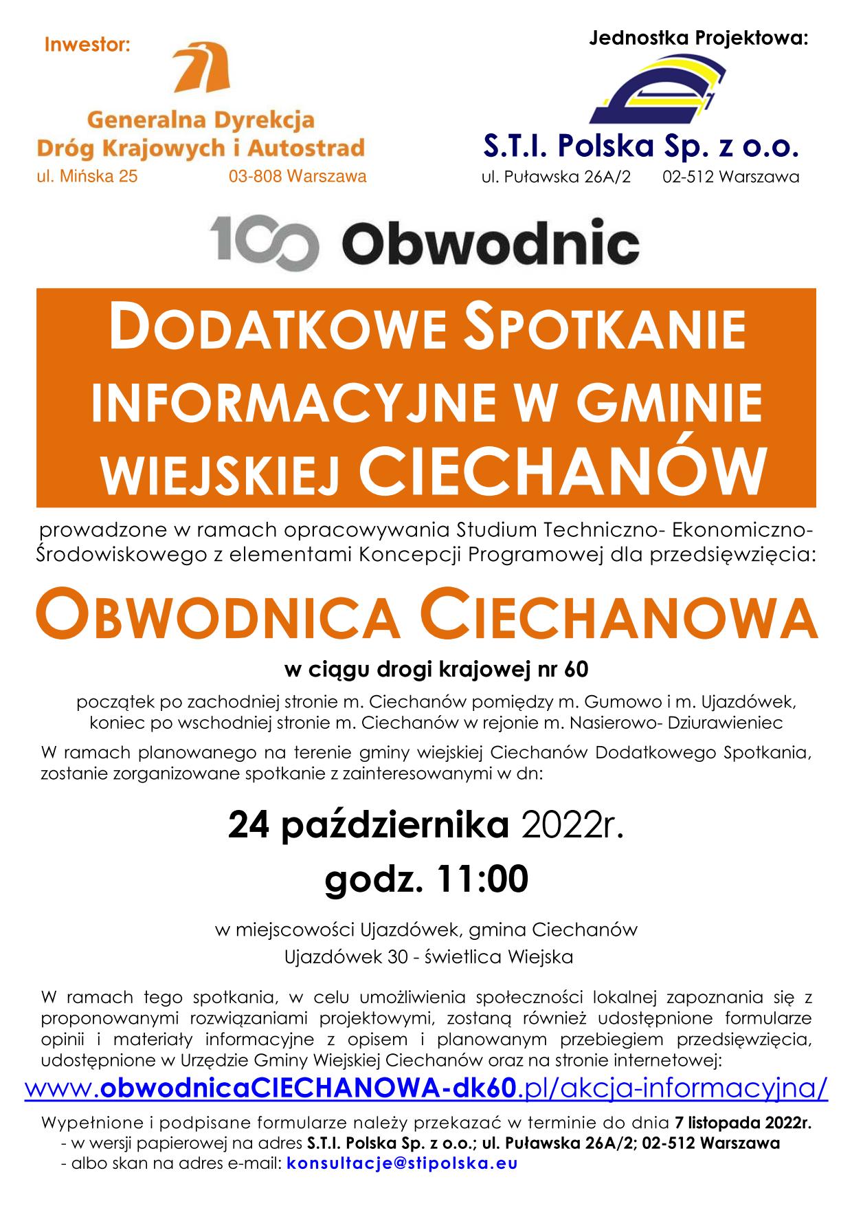 W poniedziałek, 24 października 2022 r. o godz. 11.00 w świetlicy wiejskiej Ujazdówek 30 (gm. Ciechanów) odbędzie się dodatkowe spotkanie informacyjne prowadzone w ramach Studium techniczno-ekonomiczno-środowiskowego z elementami koncepcji programowej wraz z materiałami do uzyskania decyzji o środowiskowych uwarunkowaniach dla obwodnicy Ciechanowa w ciągu drogi krajowej nr 60.