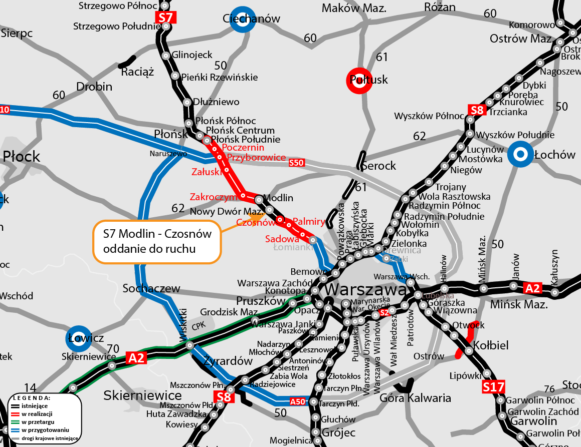 Dziś popołudniu udostępnimy kierowcom jeden z trzech realizowanych fragmentów drogi ekspresowej S7 pomiędzy Płońskiem a Czosnowem. Chodzi o odcinek od Czosnowa do Modlina o długości 9,7 km. Tym samym kierowcy będą mieli do dyspozycji 285 km drogi ekspresowej między Gdańskiem a Warszawą - od węzła Gdańsk Południe do węzła Płońsk Południe oraz odcinek Modlin - Czosnów.