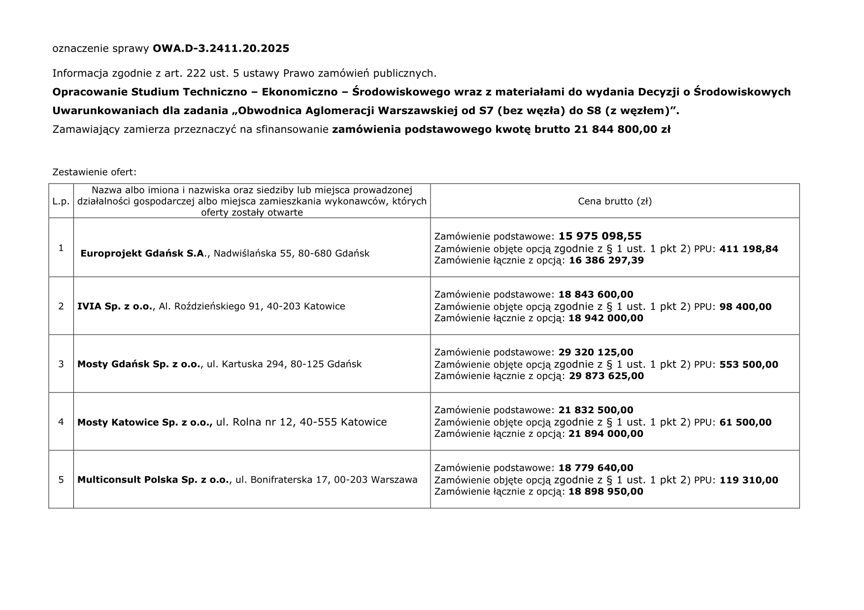 - Konsorcjum firm: Promost Consulting (lider), DOHWA Polska ENG - 16 430 340,00 zł,