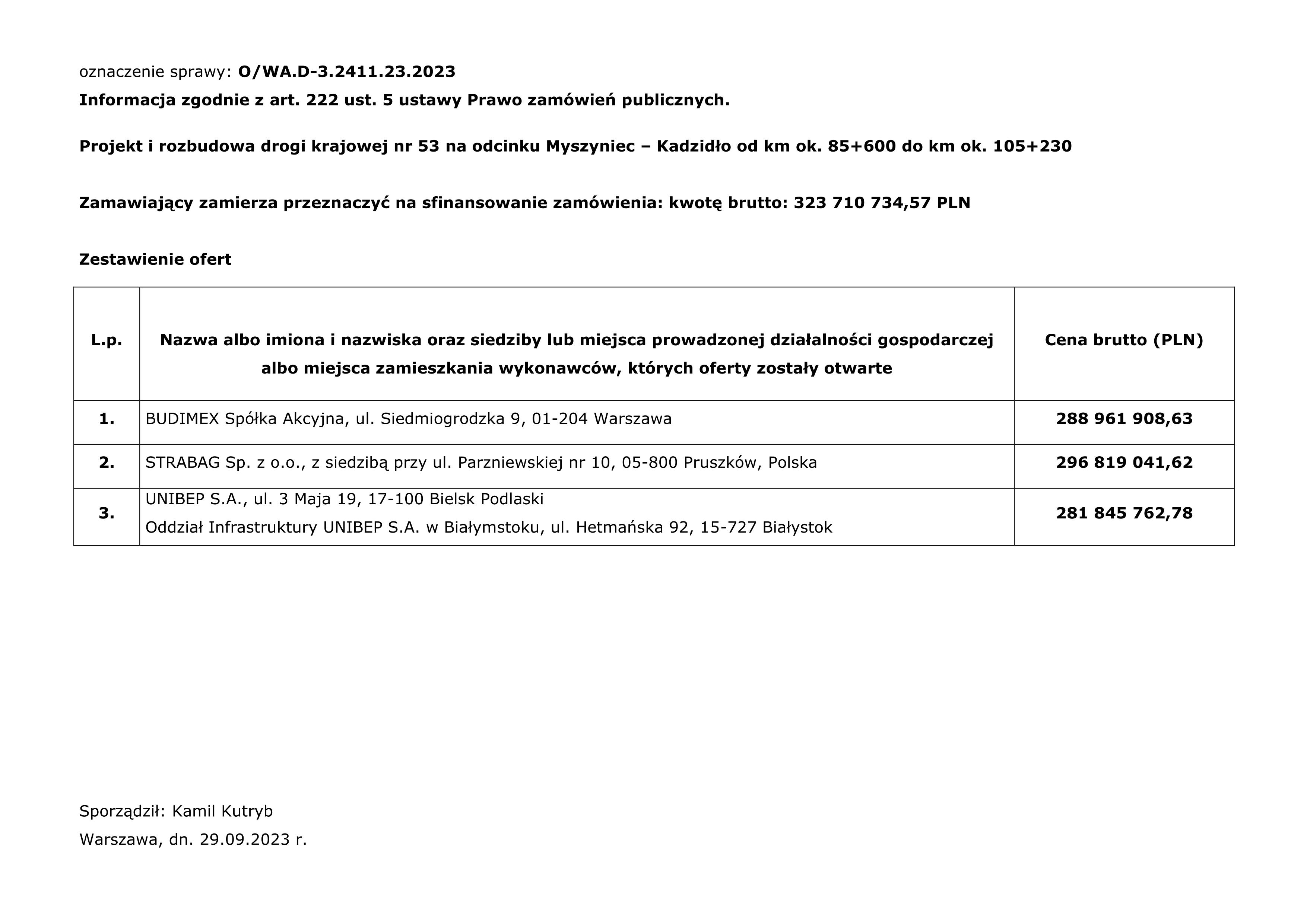 Trzech wykonawców złożyło oferty na rozbudowę DK53 na odcinku Myszyniec – Kadzidło. Złożone oferty opiewają na kwoty od ok. 282 mln zł do ok. 297 mln zł. Budżet GDDKiA wynosi 323 710 734,57 zł.