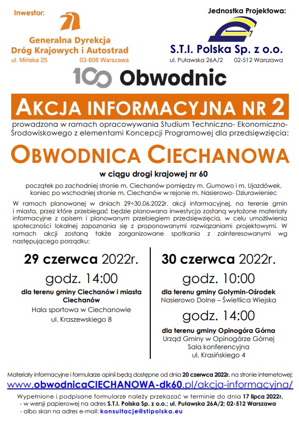 Od 20 czerwca br. udostępnione będą na stronie internetowej: https://obwodnicaciechanowa-dk60.pl/akcja-informacyjna materiały informacyjne wraz z formularzem opinii.