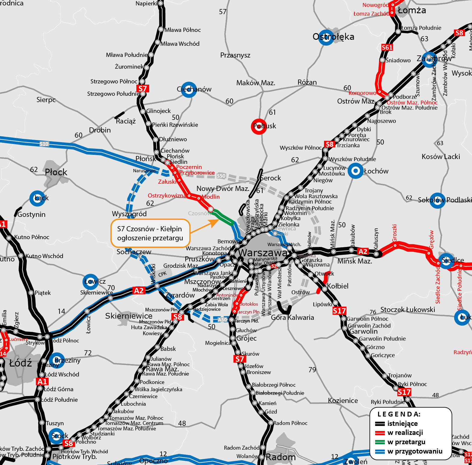 Dla odcinka S7 Kiełpin - Warszawa przygotowujemy dokumentację niezbędną do ogłoszenia przetargu na wykonanie projektu budowlanego wraz z uzyskaniem decyzji ZRID. Przypomnijmy, że w listopadzie 2021 r. Generalny Dyrektor Ochrony Środowiska rozpatrzył odwołania od decyzji środowiskowej dla budowy tego odcinka według wariantu II. Oznacza to, że ostateczna decyzja środowiskowa dała nam zielone światło do pozyskania finansowania na realizację inwestycji. Planujemy w I połowie br. ogłosić przetarg na wykonanie projektu budowlanego oraz uzyskanie niezbędnych decyzji.