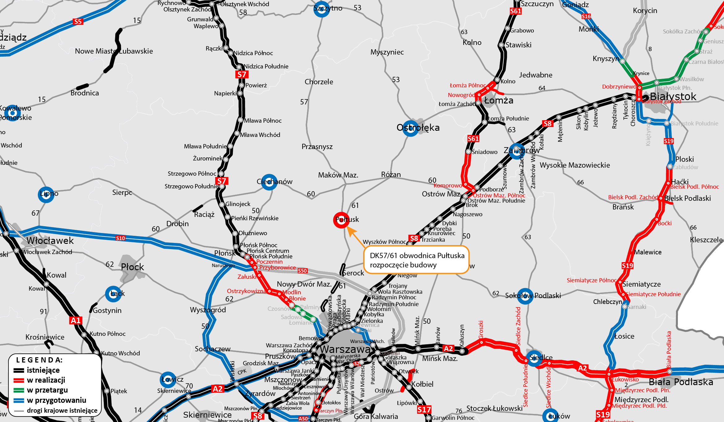 Inwestycja poprawi również warunki i bezpieczeństwo przejazdu dla ruchu dalekobieżnego i regionalnego. DK57 i DK61 stanowią popularne trasy dojazdu mieszkańców stolicy i Mazowsza na Warmię i Mazury. Przypomnijmy, że sukcesywnie przebudowujemy DK61 pomiędzy Warszawą a Pułtuskiem. W realizacji jest odcinek Legionowo – Zegrze.