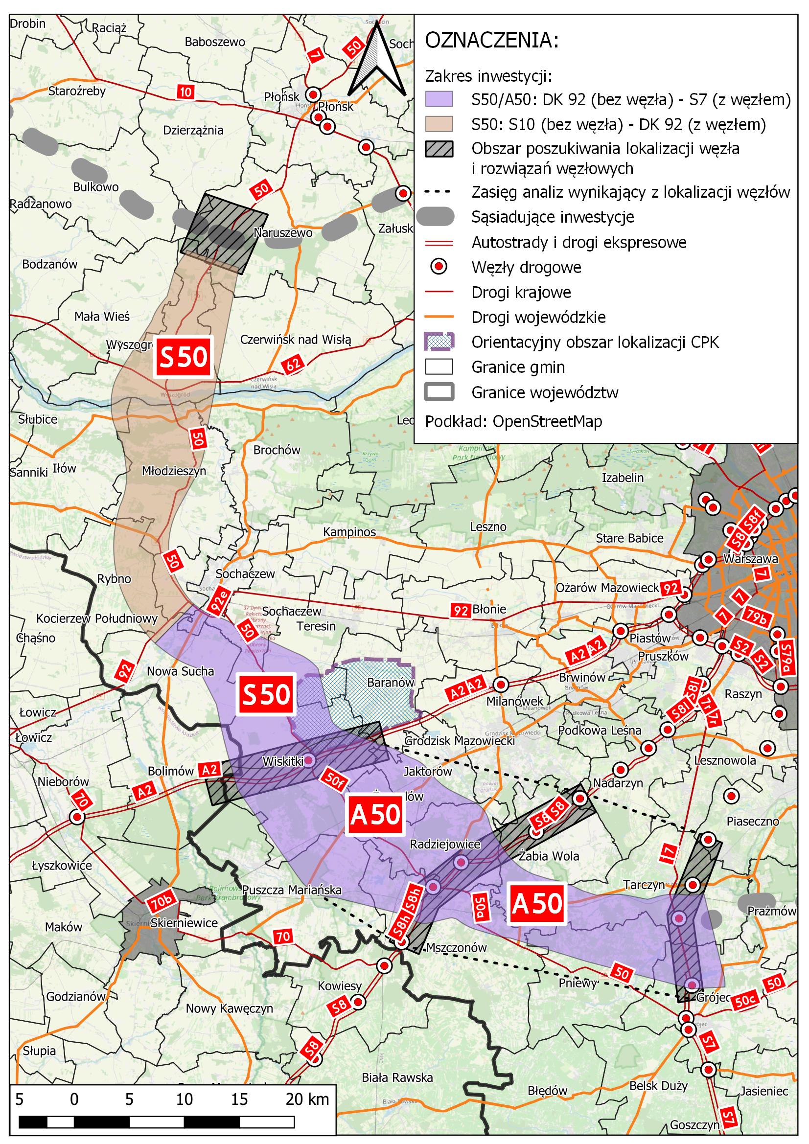 Wykonawca Studium techniczno-ekonomiczno-środowiskowego wraz z materiałami niezbędnymi do uzyskania DŚU dla części OAW między jej północnym połączeniem z S10 i południowym z S7 przeanalizuje obszar wskazany na mapie. Zaproponuje w nim możliwe warianty przebiegu drogi.
