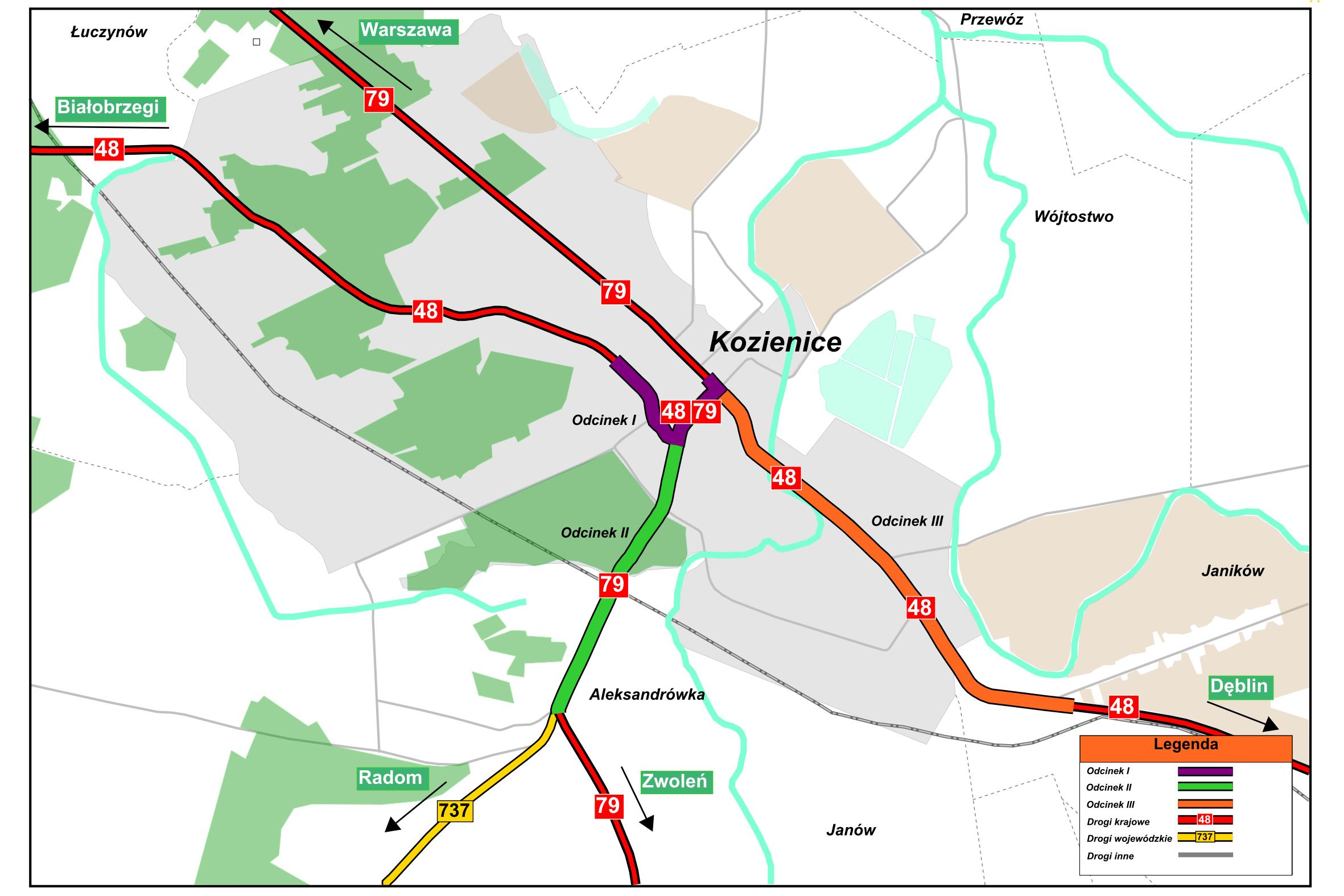Rozbudowa DK79 oraz DK48 na przejściu przez m. Kozienice podzielona została na trzy odcinki: