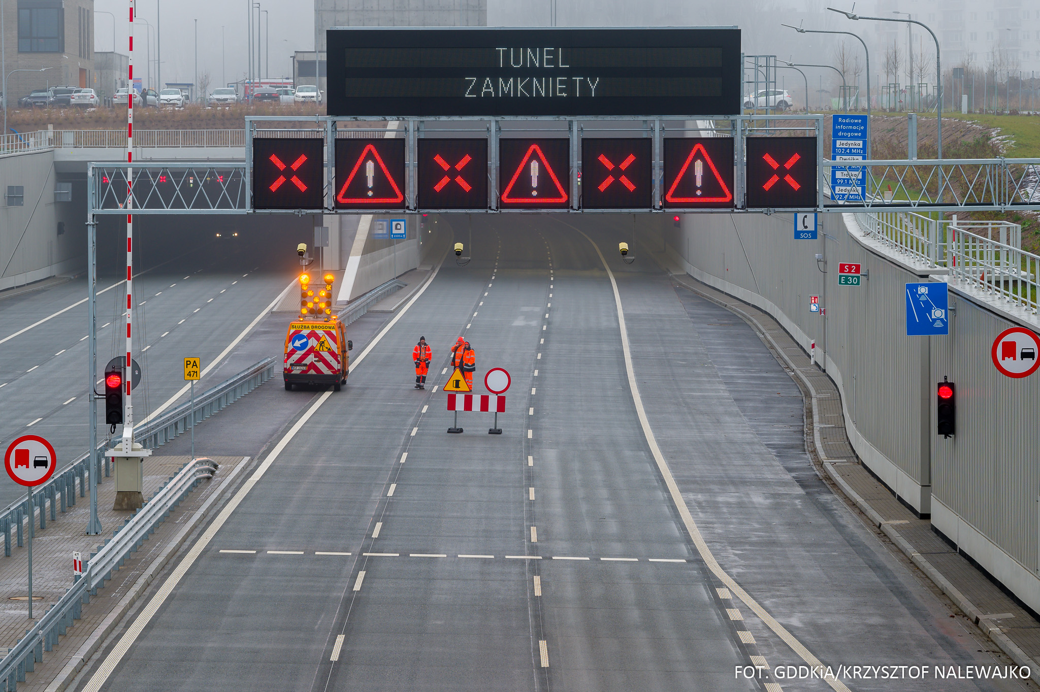 Na znakach zmiennej treści przed wjazdem do tunelu mogą pojawić się ostrzeżenia o warunkach atmosferycznych, o zatorze w tunelu, a jeśli cały tunel zostanie zablokowany, kierowcy zobaczą na nich informację o objazdach. Te ostatnie informacje pojawią się nie tylko w najbliższym sąsiedztwie tunelu, ale również kilkadziesiąt kilometrów wcześniej, na A2, S8, S7, S17, DK79 i DK92, przed skrzyżowaniami z DK50.