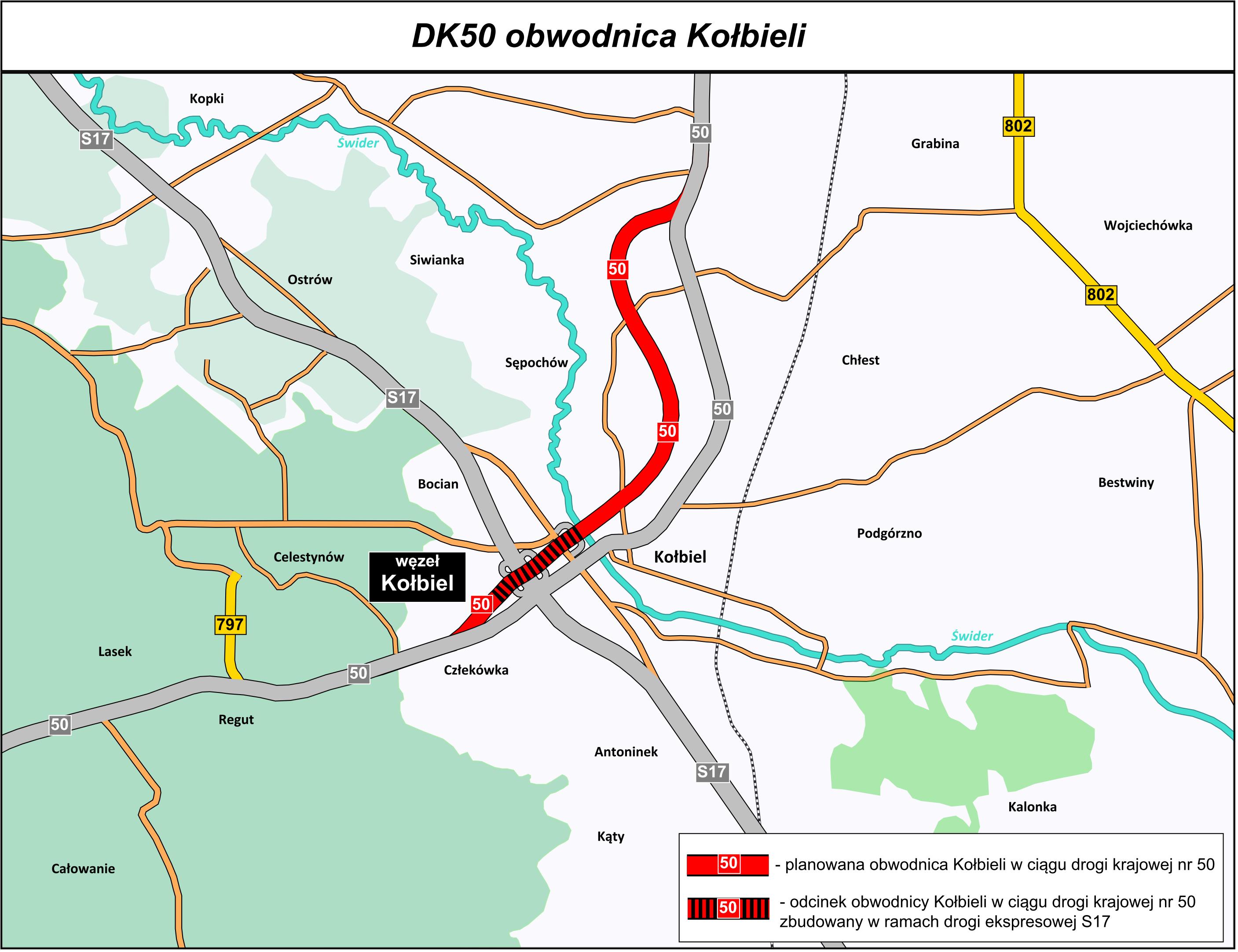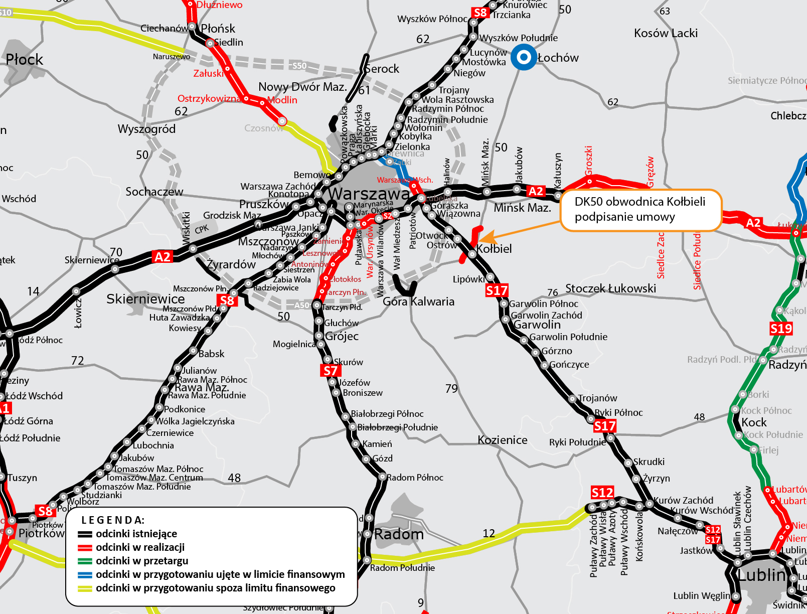 Podpisaliśmy umowę na zaprojektowanie i budowę obwodnicy Kołbieli w ciągu DK50. Ponad 11-kilometrowy odcinek nowej trasy powstanie w parametrach drogi klasy GP (drogi głównej ruchu przyspieszonego).