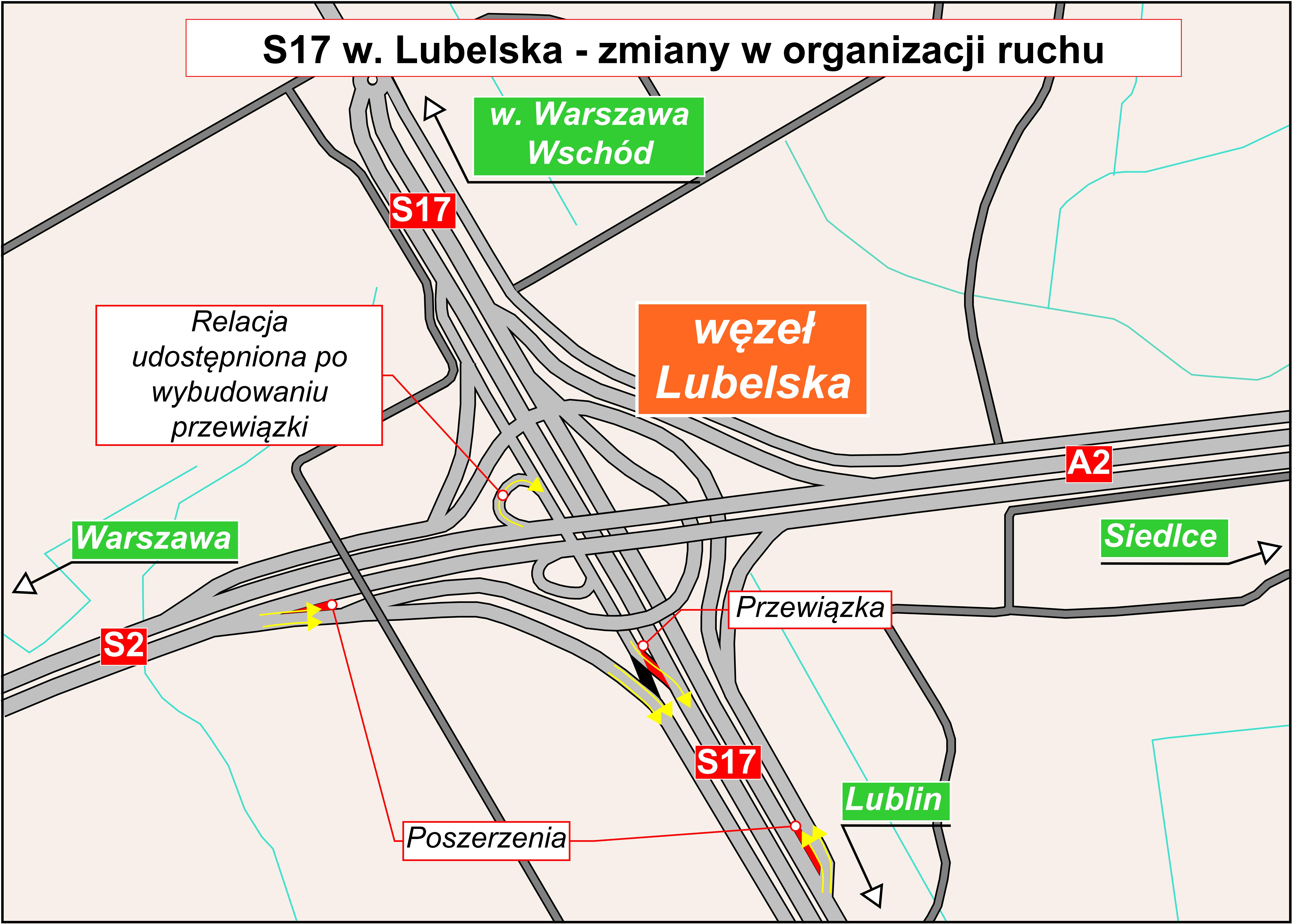 Przypomnijmy, że w październiku 2022 r., w ramach czasowej organizacji ruchu, na łącznicy węzła prowadzącej z S17 od strony Lublina na S2 POW do Warszawy udostępniliśmy dwa pasy ruchu. Od grudnia 2022 r., po oddaniu do użytkowania odcinka S17 Lubelska - Warszawa Wschód (Zakręt), kierowcy mają do dyspozycji dwa pasy ruchu na łącznicy z S2 POW od strony Warszawy w kierunku Lublina (S17). Ta zmiana spowodowała czasowo zamknięcie łącznicy z A2 od strony Terespola na S17 w kierunku Lublina. Dla pojazdów jadących w tym kierunku obowiązuje objazd przez węzeł Warszawa Wschód (Zakręt). Takie rozwiązanie umożliwiło bezpieczne poprowadzenie dwóch pasów na łącznicy z S2 w kierunku Lublina.