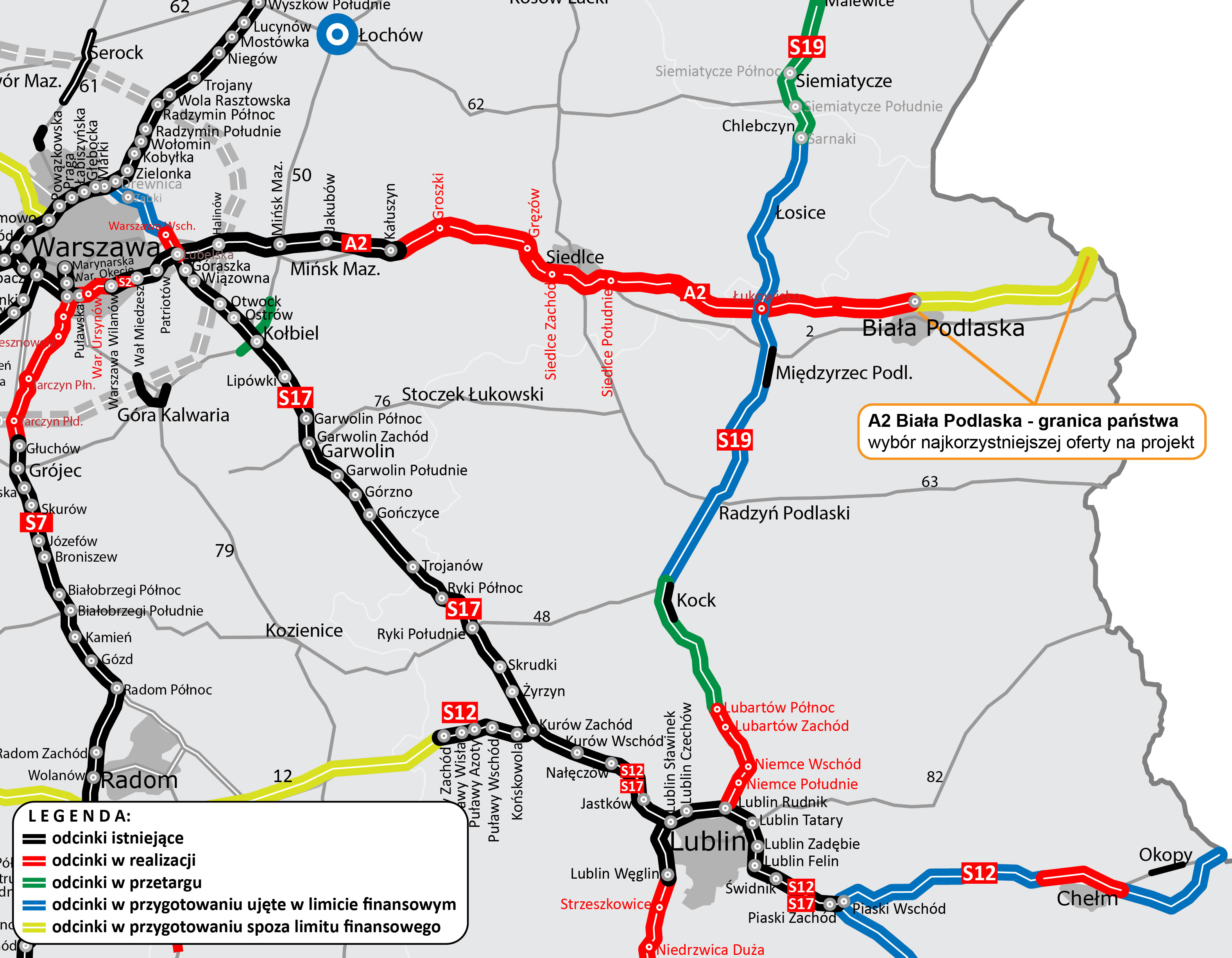 W kwietniu br. podpisaliśmy umowy na cztery kolejne fragmenty A2 od Siedlec do Białej Podlaskiej, o łącznej długości ponad 63 km. 1 kwietnia dla odcinków Malinowiec – Łukowisko oraz Swory – Biała Podlaska, 14 kwietnia dla Siedlce Zachód - Malinowiec oraz Łukowisko - Swory. Na każdym zadaniu trwa opracowywanie dokumentacji niezbędnej do złożenia wniosku o wydanie decyzji ZRID. Planowany termin złożenia wniosków to grudzień 2021 r.