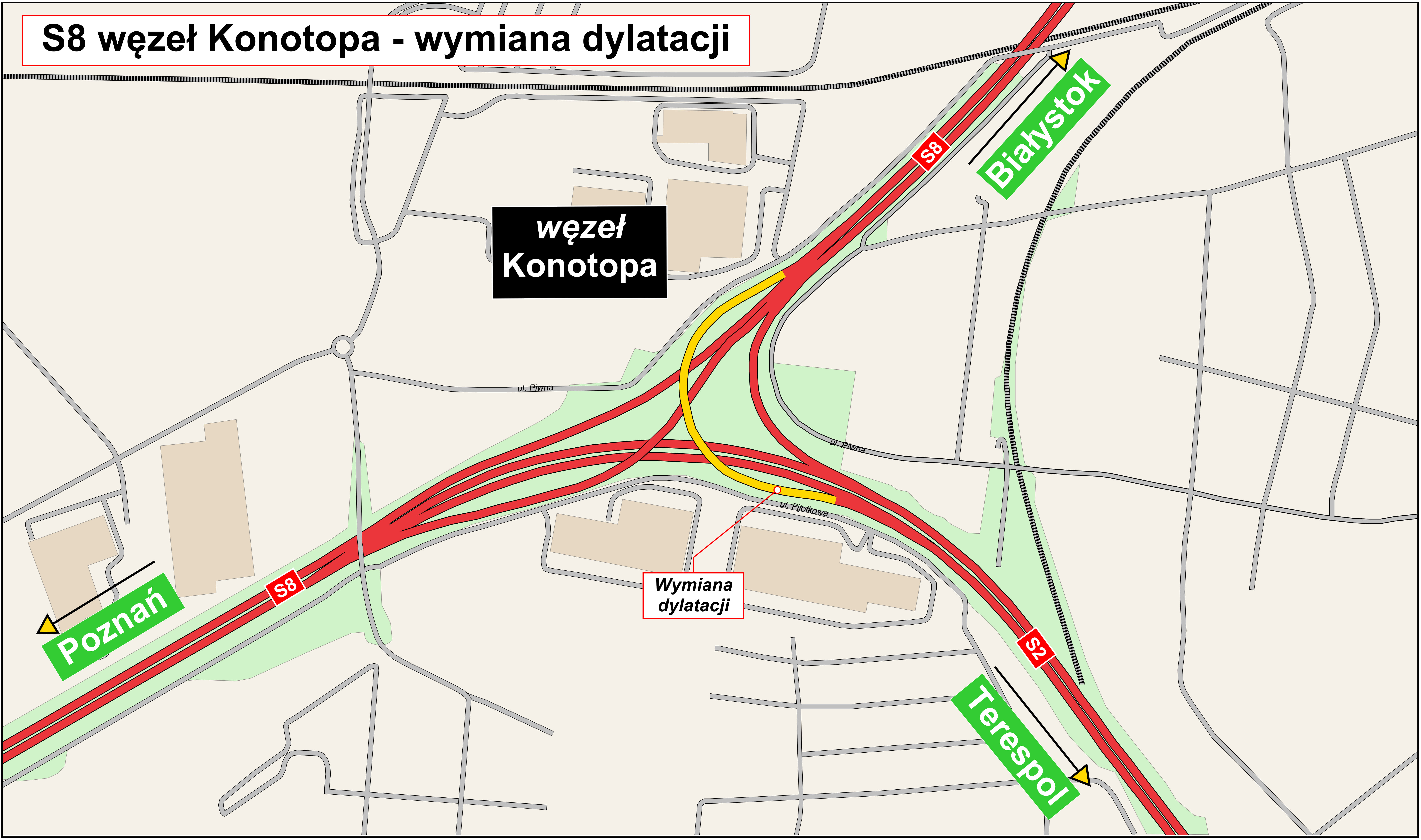 W poniedziałek, 9 czerwca (g. 10:00) na węźle Konotopa, rozpocznie się wprowadzanie zmiany w organizacji ruchu. Powodem jest wymiana dylatacji na łącznicy prowadzącej ruch z S8 (od Białegostoku) na S2 (kier. Terespol). Roboty będą prowadzone przy zajętości połowy jezdni.