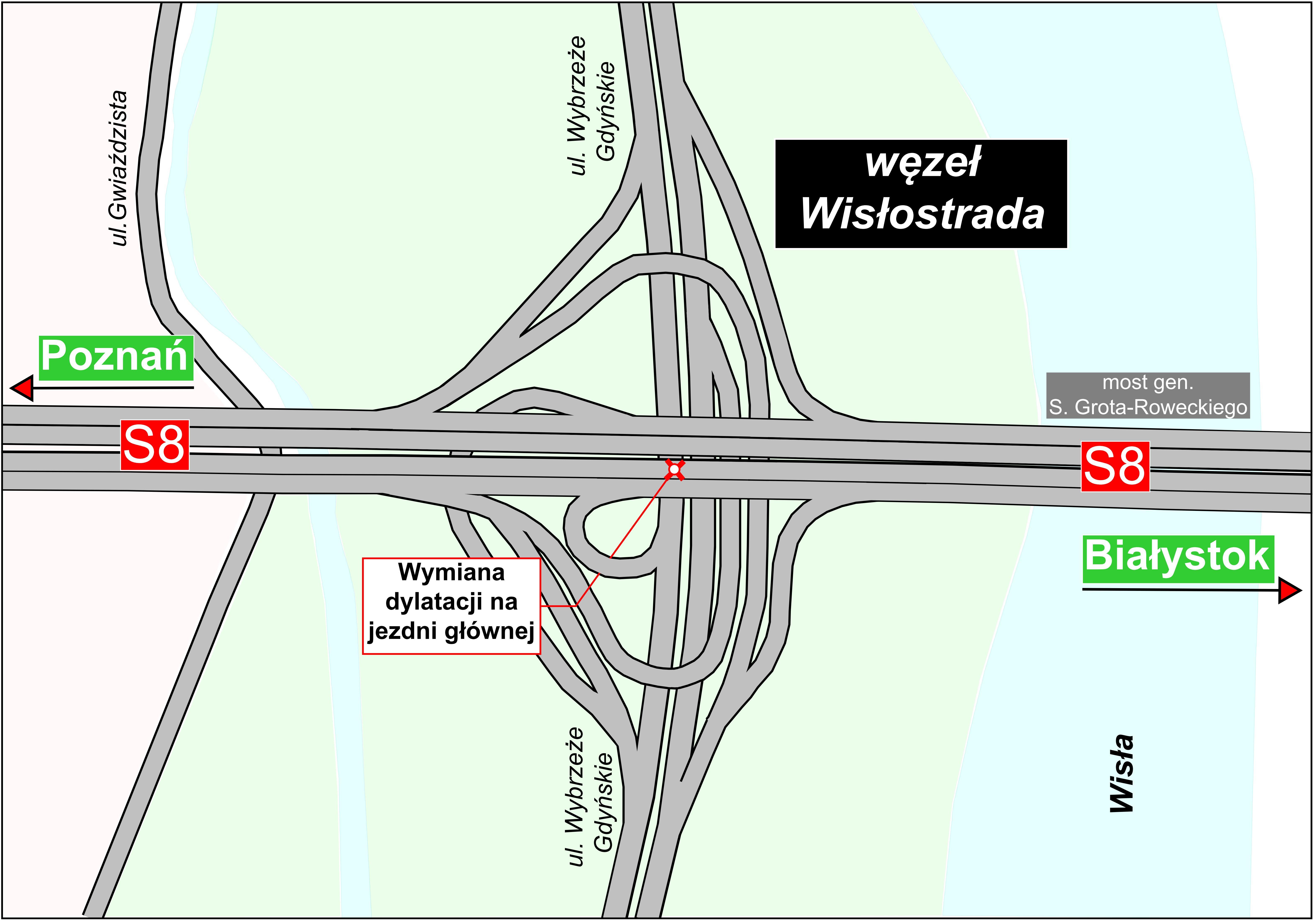 AKTUALIZACJA: Z przyczyn technicznych leżących po stronie Wykonawcy termin rozpoczęcia prac został przesunięty na połowę września br. W poniedziałek, 26 sierpnia 2024 r. na ciągu głównym Trasy AK, węźle Modlińska nad Wisłostradą w ciągu S8 w kierunku Białegostoku rozpoczynają się prace związane z wymianą dylatacji. Roboty będą prowadzone przy zajętości jednego pasa ruchu.