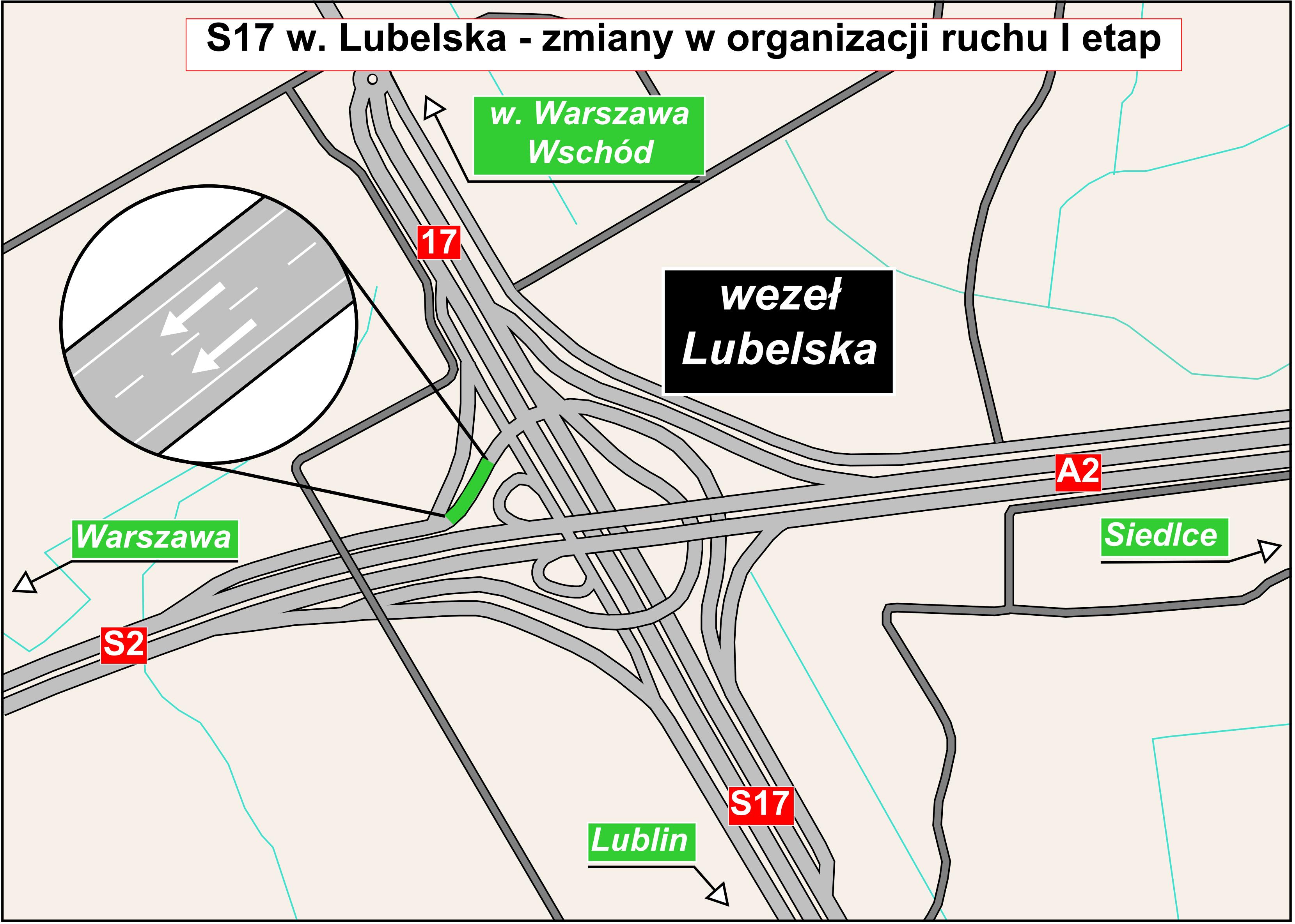 Powyższe zmiany wprowadzimy w ramach czasowej organizacji ruchu, a jeszcze w listopadzie ogłosimy przetarg na opracowanie docelowego projektu stałej organizacji ruchu. Zadaniem przyszłego wykonawcy będzie opracowanie analiz i prognoz ruchu, a także budowa przewiązki, która umożliwi przywrócenie ruchu na łącznicy relacji A2 Terespol - S17 Lublin. Powstanie ona pomiędzy jezdnią zbiorczo rozprowadzającą a jezdnią główną S17 w kierunku Lublina, na wysokości łącznicy zjazdowej z S2 na S17.