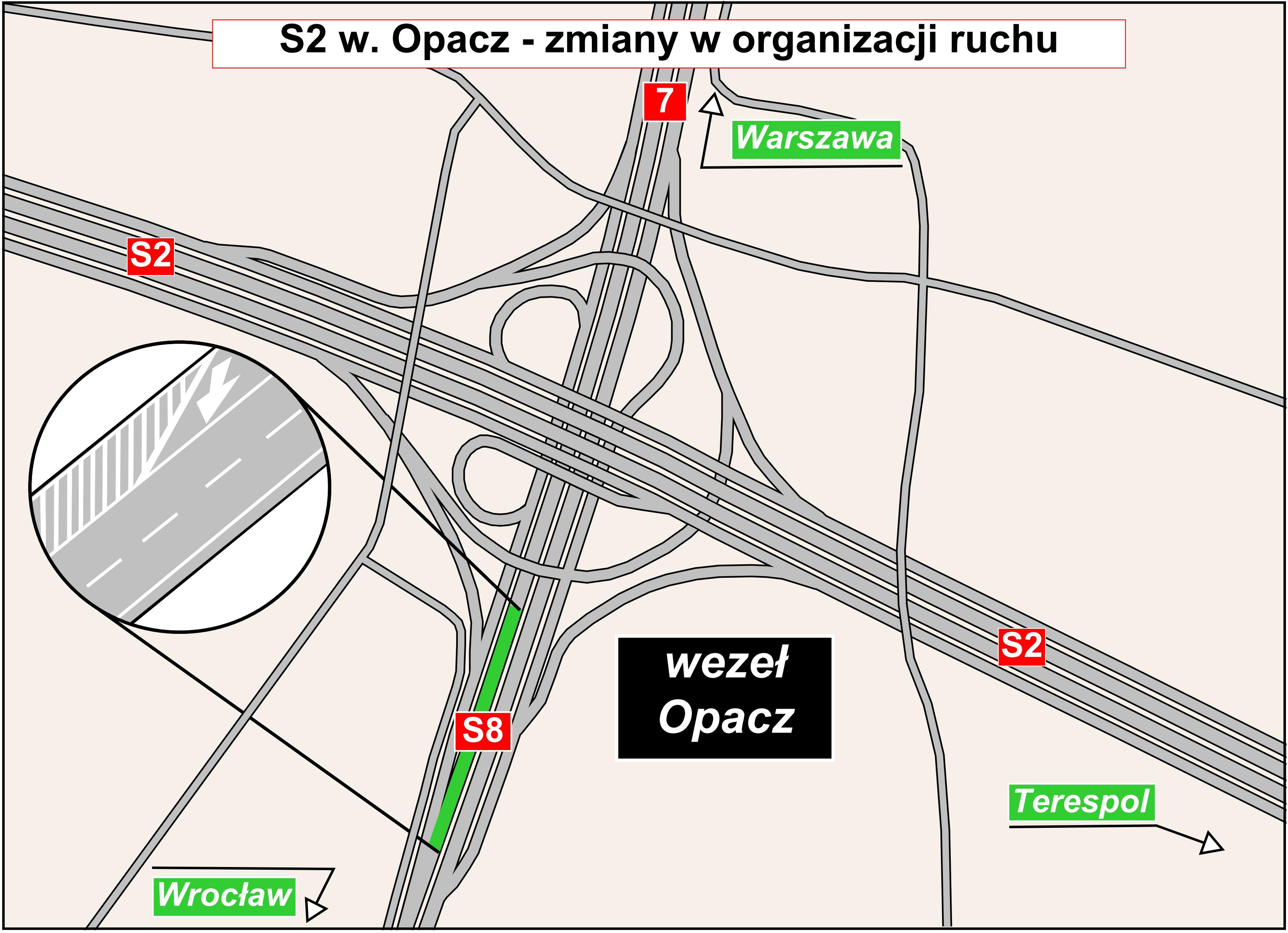 Na początku listopada zawężony zostanie prawy pas drogi ekspresowej S8 w obrębie węzła Opacz na jezdni w kierunku Wrocławia. To rozwiązanie poprawi płynność ruchu dla pojazdów włączających się do ruchu z S2 z węzła Konotopa.