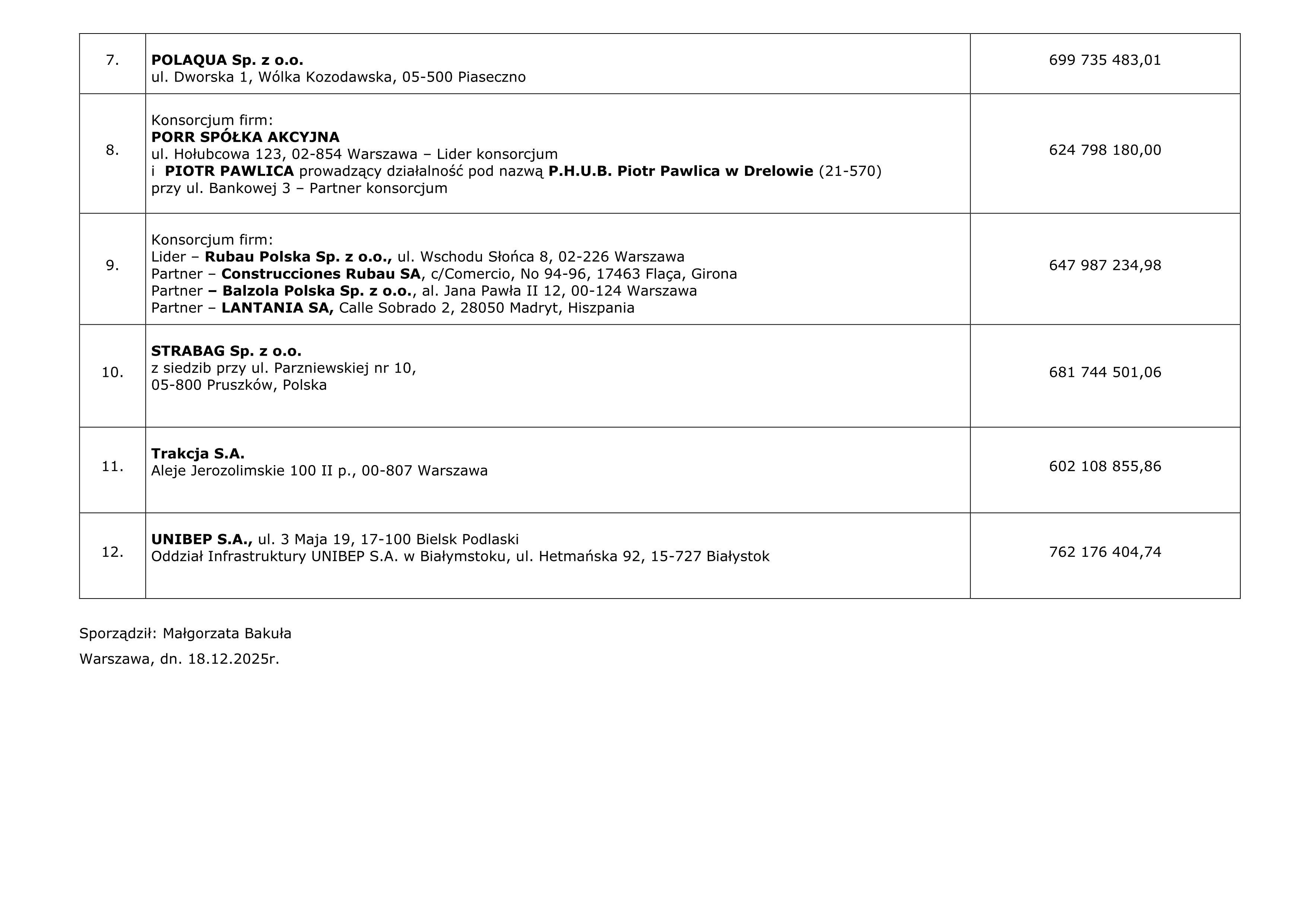 624 798 180,00 zł – konsorcjum firm: PORR (lider) i P.H.U.B. Piotr Pawlica,