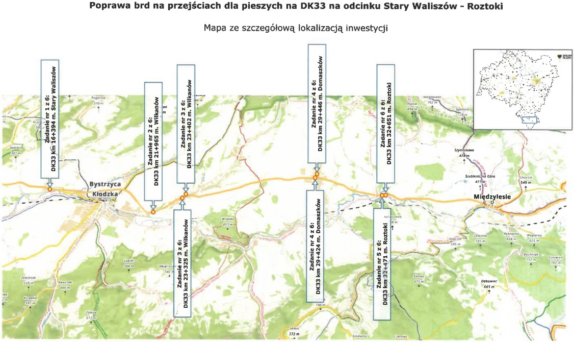 Dodatkowe oświetlenie oraz specjalne płytki dla osób niedowidzących i niewidomych wybudowane zostaną na ośmiu przejściach dla pieszych w ciągu drogi krajowej nr 33, tj. na sześciu przejściach w ciągu głównym DK33 oraz na dwóch wlotach podporządkowanych.