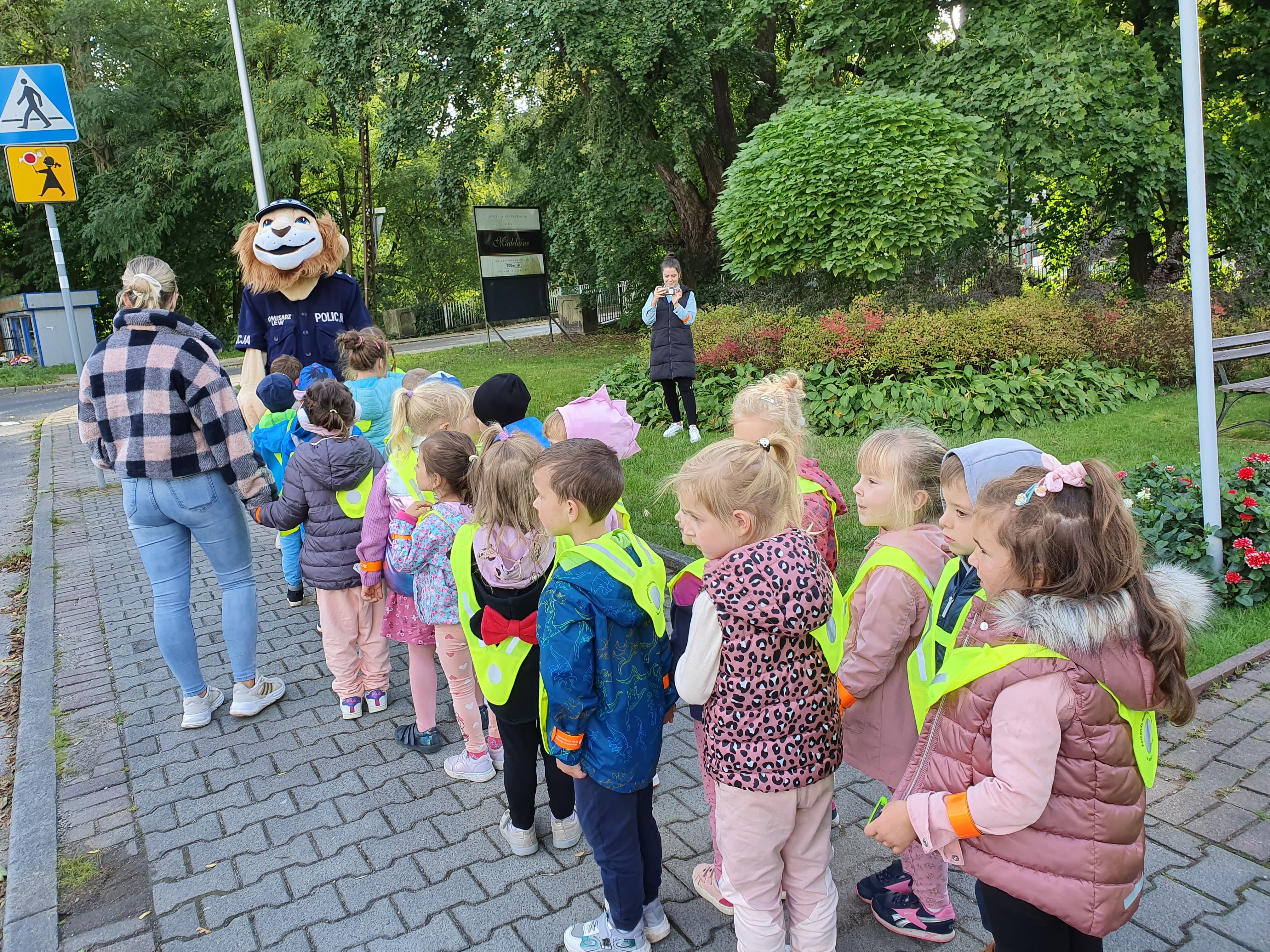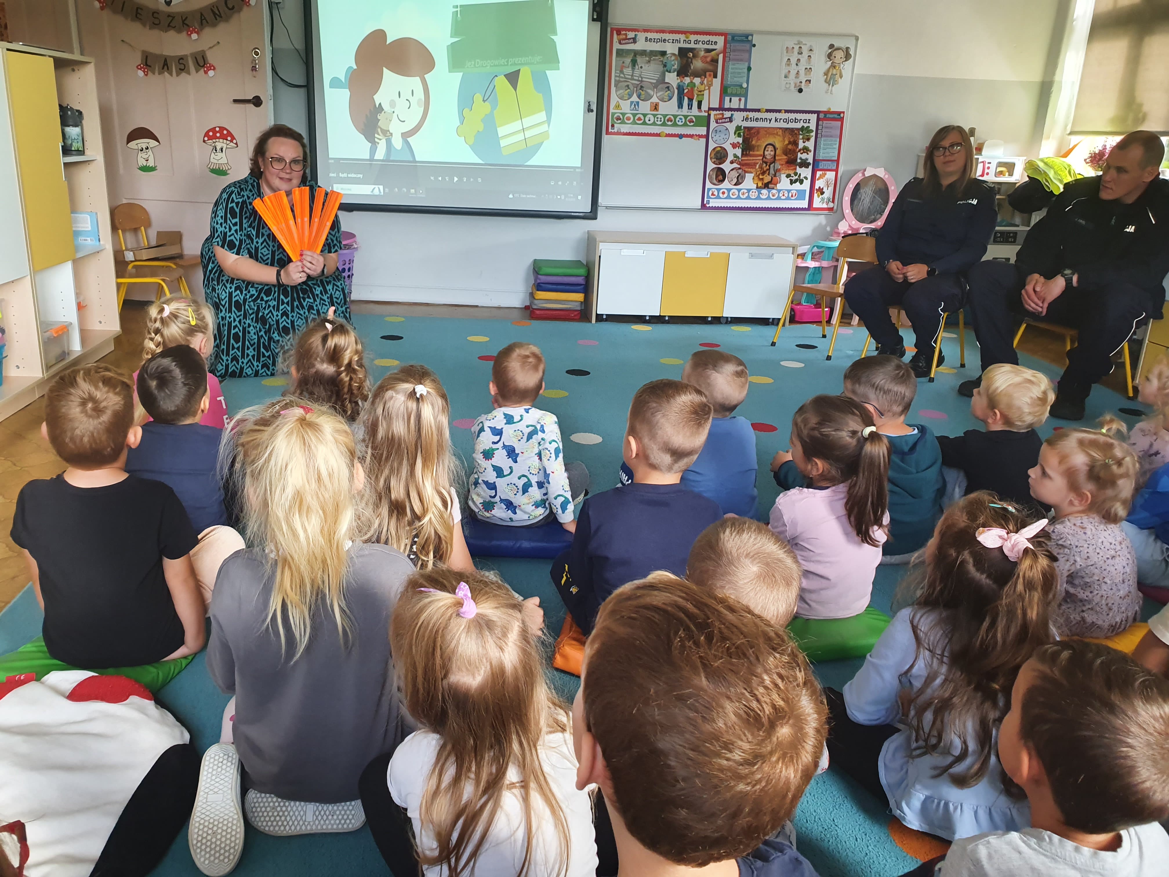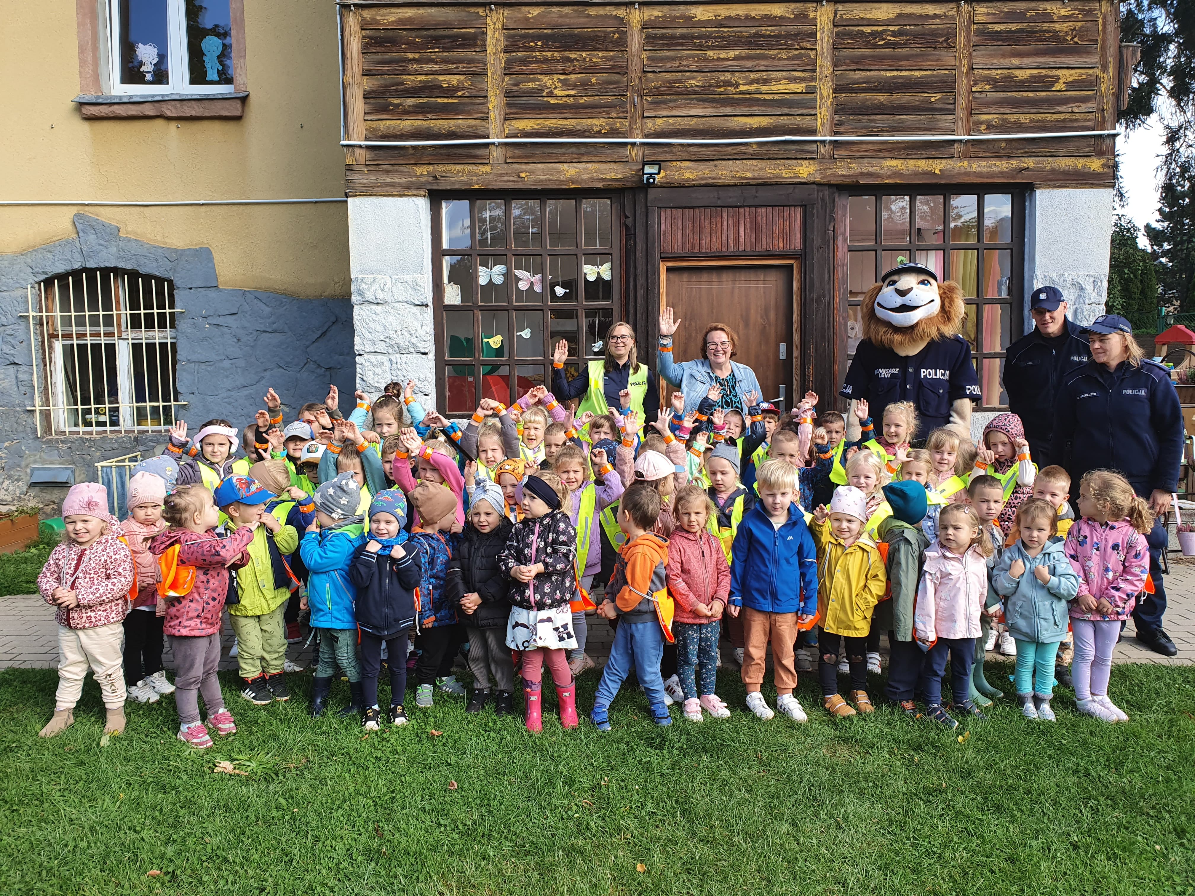 O tych bardzo ważnych tematach opowiadał Jeż Drogowiec na animowanych filmach GDDKiA oraz policjantka z Komendy Powiatowej Policji w Lwówku Śląskiej. Dzieci bardzo aktywnie uczestniczyły w zajęciach chętnie przytaczając własne przykłady dotyczące bezpieczeństwa w życiu codziennym. Otrzymały odblaski, które jak obiecały, będą używać codziennie. Na koniec, przedszkolaki w towarzystwie policjantów i Komisarza Lwa mogły sprawdzić swoją wiedzę w terenie, ćwicząc bezpieczne przechodzenie przez jednię.