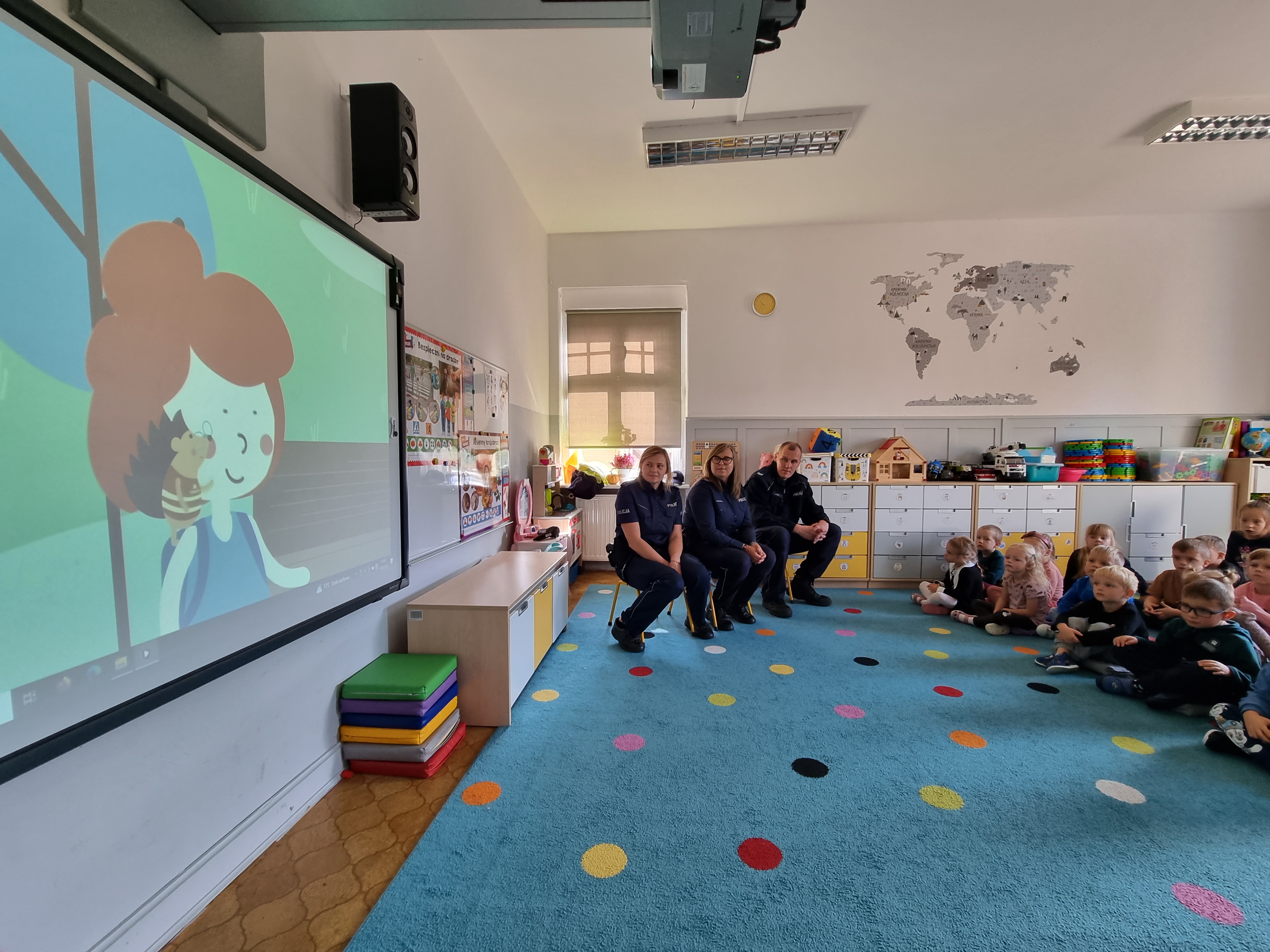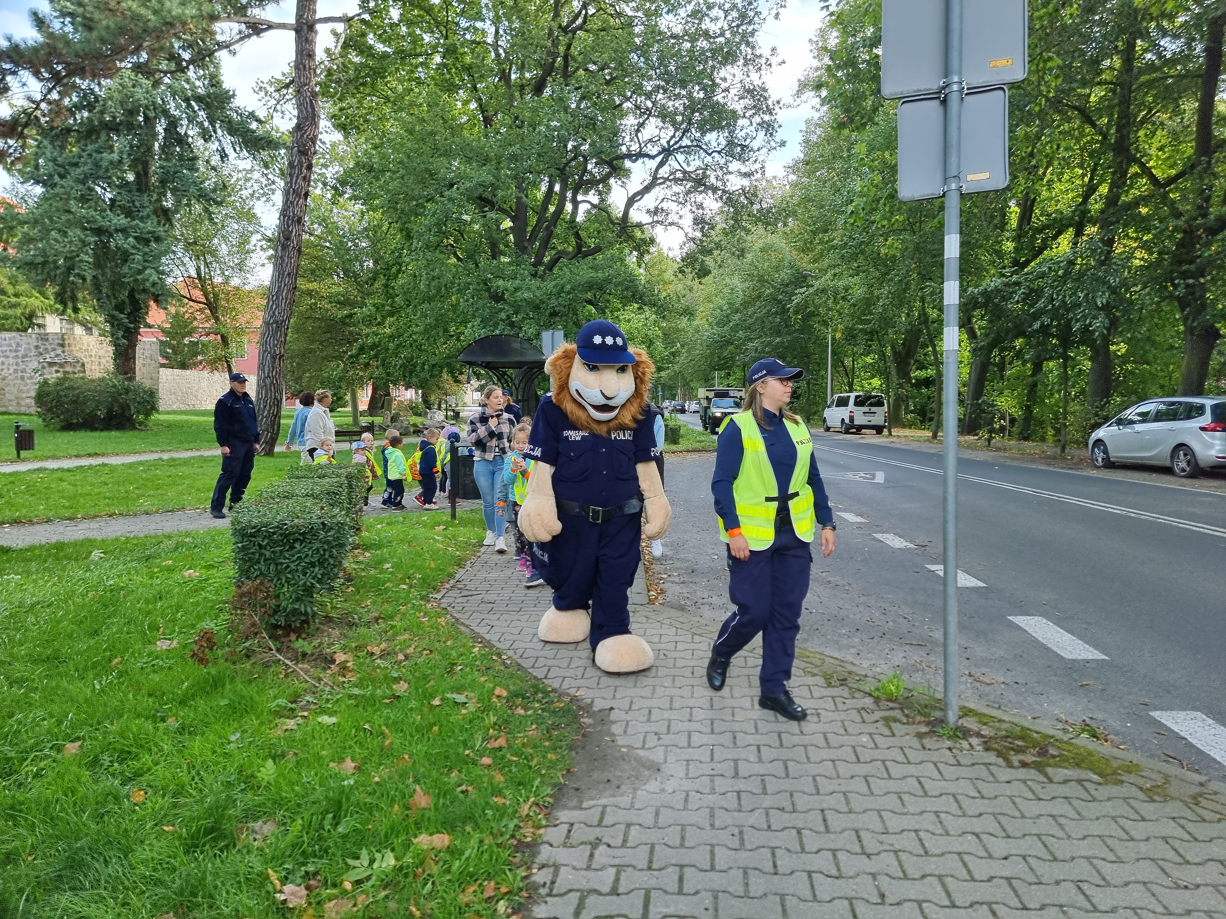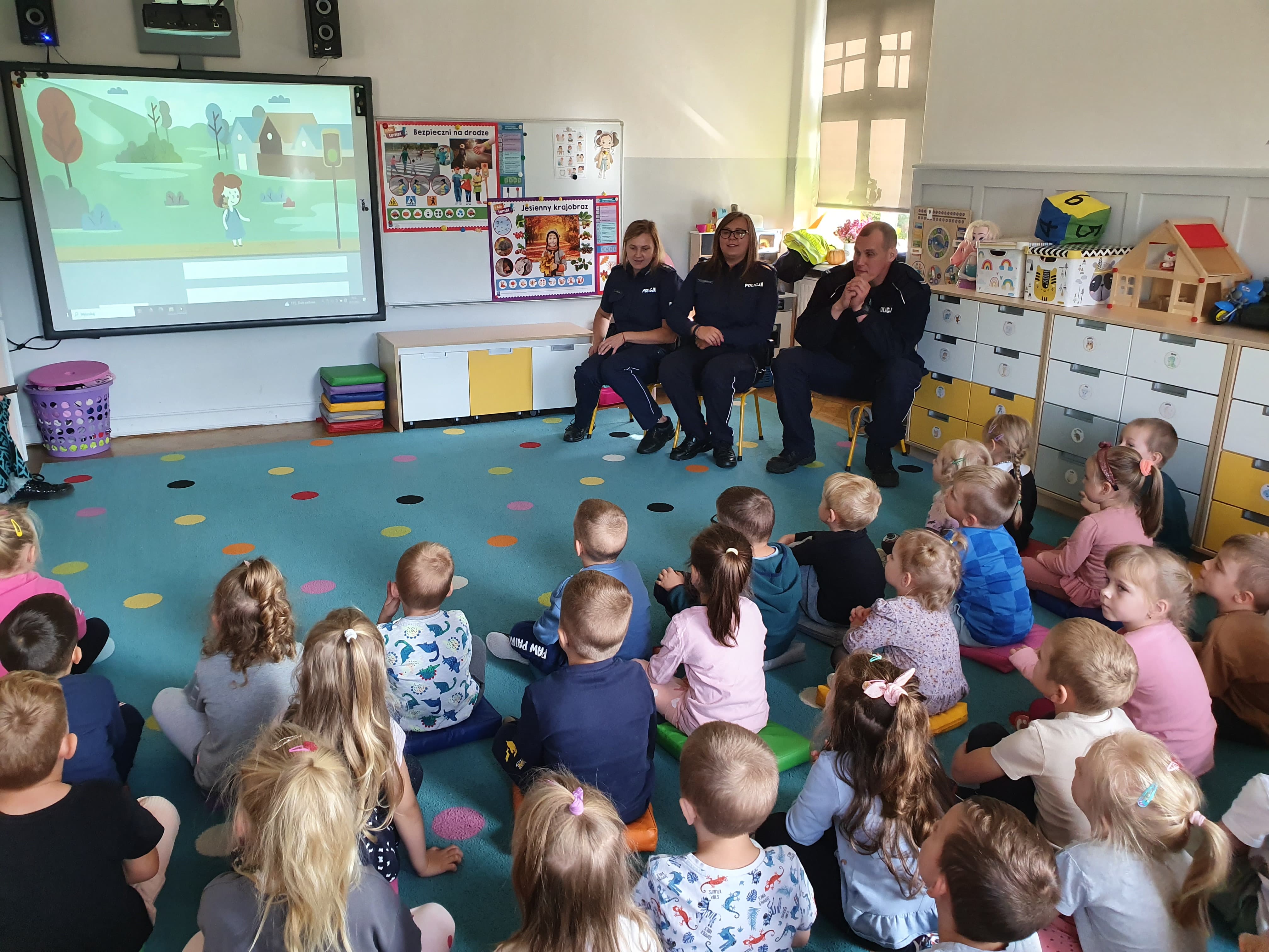 O tych bardzo ważnych tematach opowiadał Jeż Drogowiec na animowanych filmach GDDKiA oraz policjantka z Komendy Powiatowej Policji w Lwówku Śląskiej. Dzieci bardzo aktywnie uczestniczyły w zajęciach chętnie przytaczając własne przykłady dotyczące bezpieczeństwa w życiu codziennym. Otrzymały odblaski, które jak obiecały, będą używać codziennie. Na koniec, przedszkolaki w towarzystwie policjantów i Komisarza Lwa mogły sprawdzić swoją wiedzę w terenie, ćwicząc bezpieczne przechodzenie przez jednię.