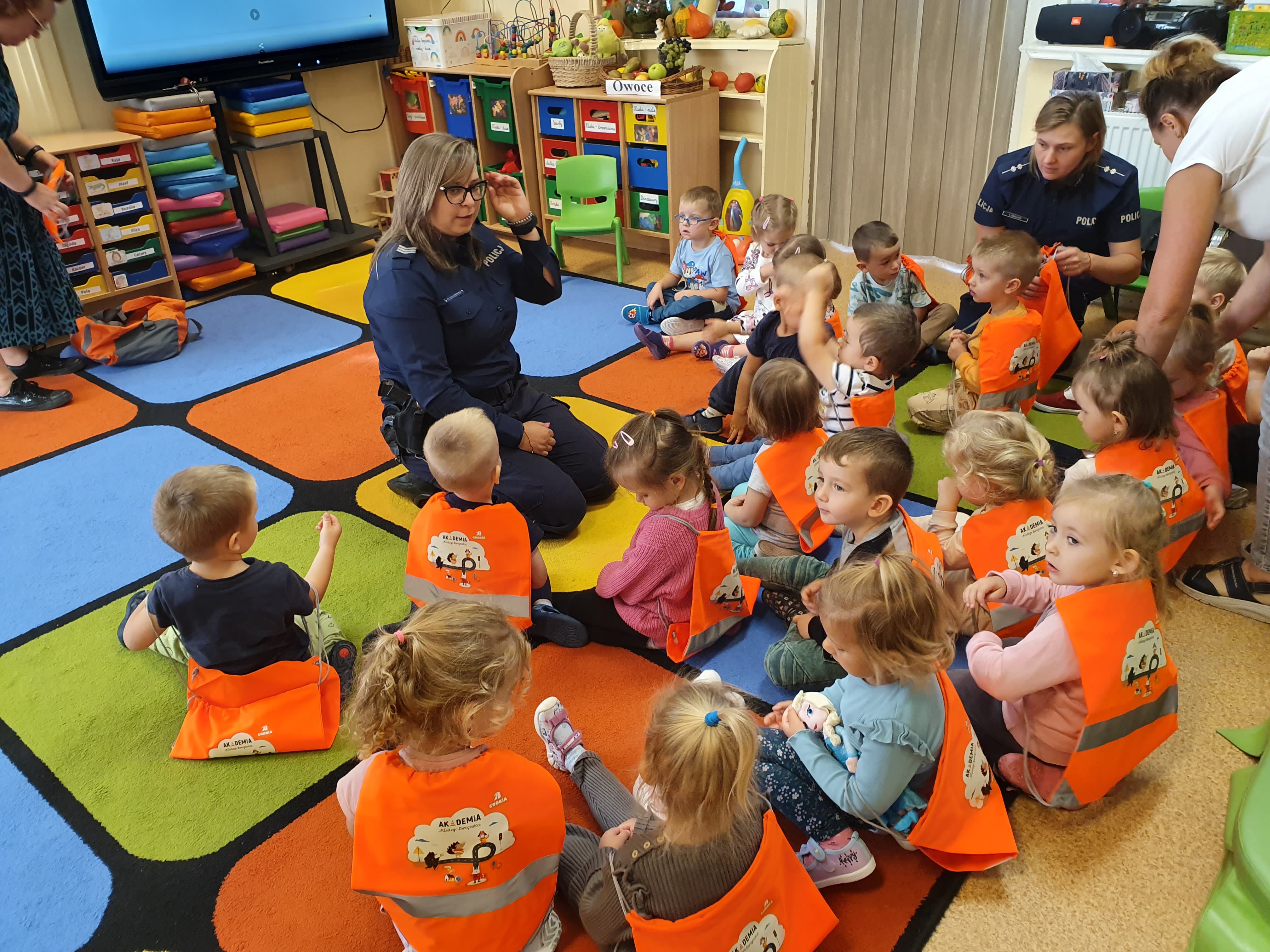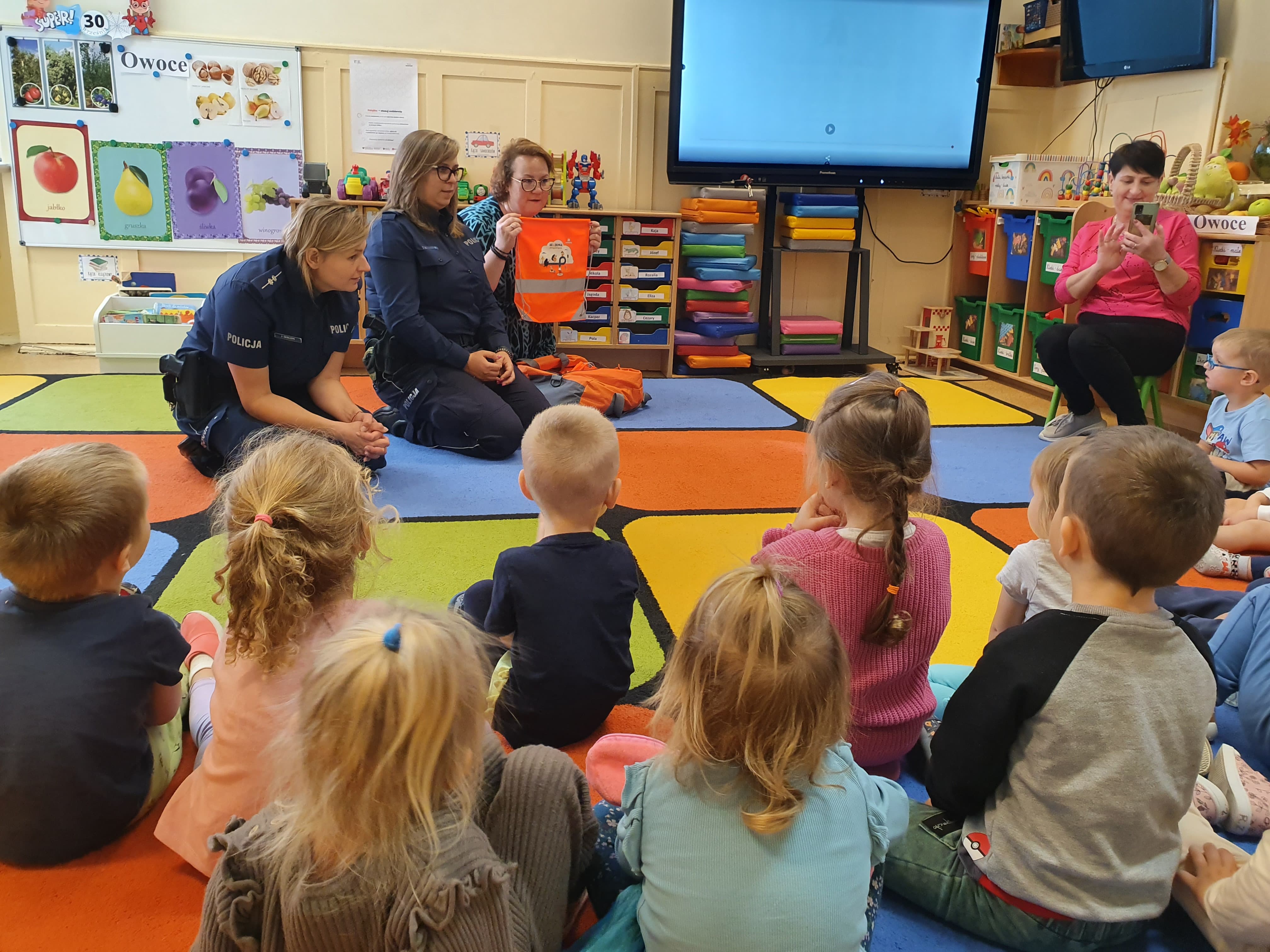 Przedszkolaki miały okazję zapoznać się z zasadami prawidłowego przechodzenia przez ulicę, stosowania odblasków oraz przypomniały sobie numer alarmowy, pod który należy dzwonić w razie niebezpieczeństwa.