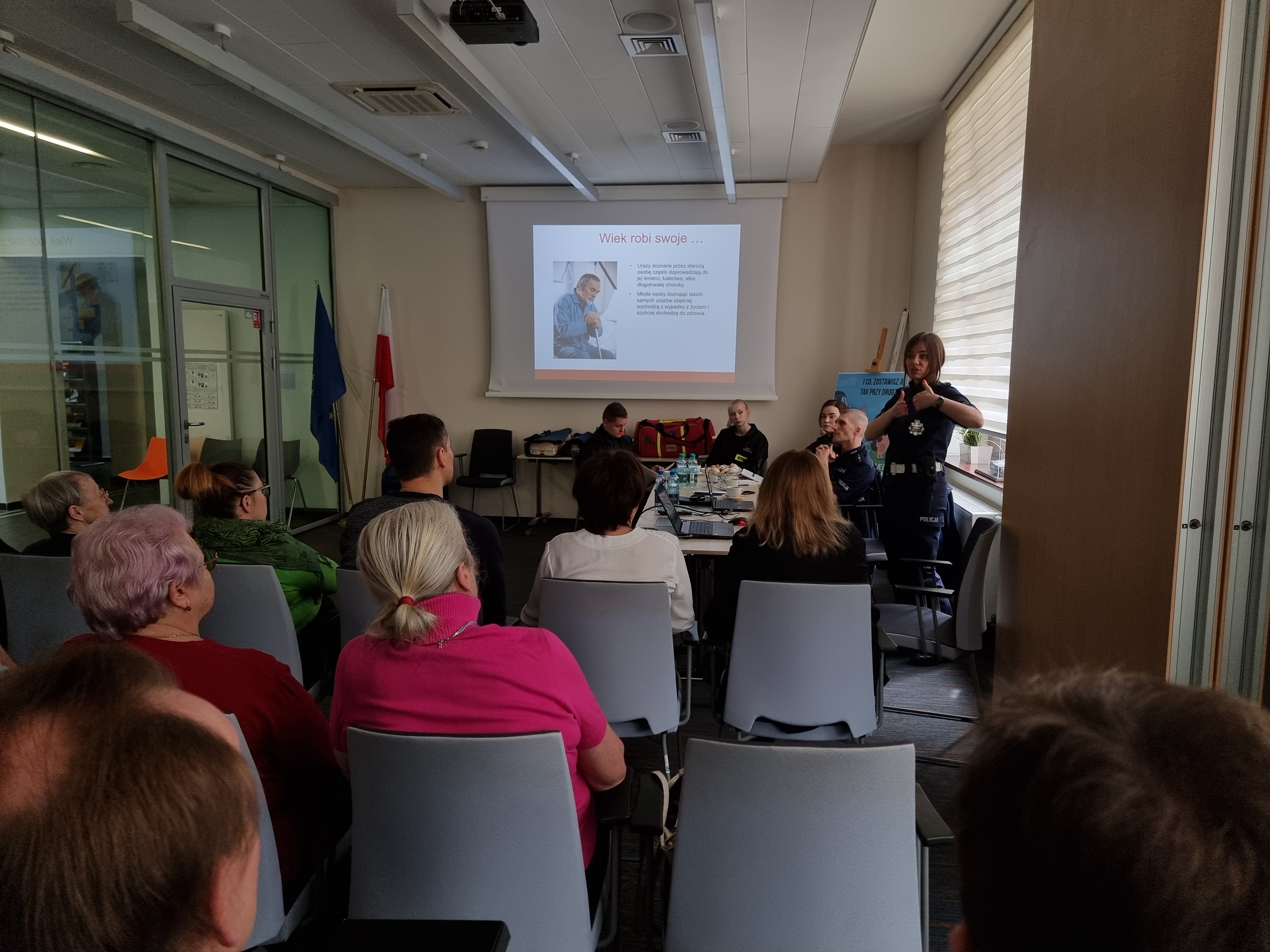 Uczestnicy spotkania otrzymali od nas upominki m.in. książeczki z zasadami pierwszej pomocy oraz elementy odblaskowe.