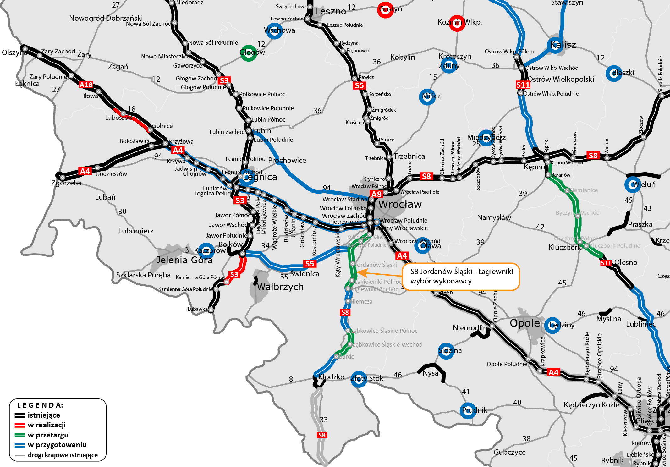 Wyłoniliśmy najkorzystniejszą ofertę w przetargu na zaprojektowanie i budowę drogi ekspresowej S8 od Jordanowa Śląskiego do Łagiewnik. Tym samym poznaliśmy wyniki pierwszych trzech postępowań przetargowych na realizację 33-kilometrowego fragmentu dolnośląskiej S8 od Kobierzyc do Łagiewnik.