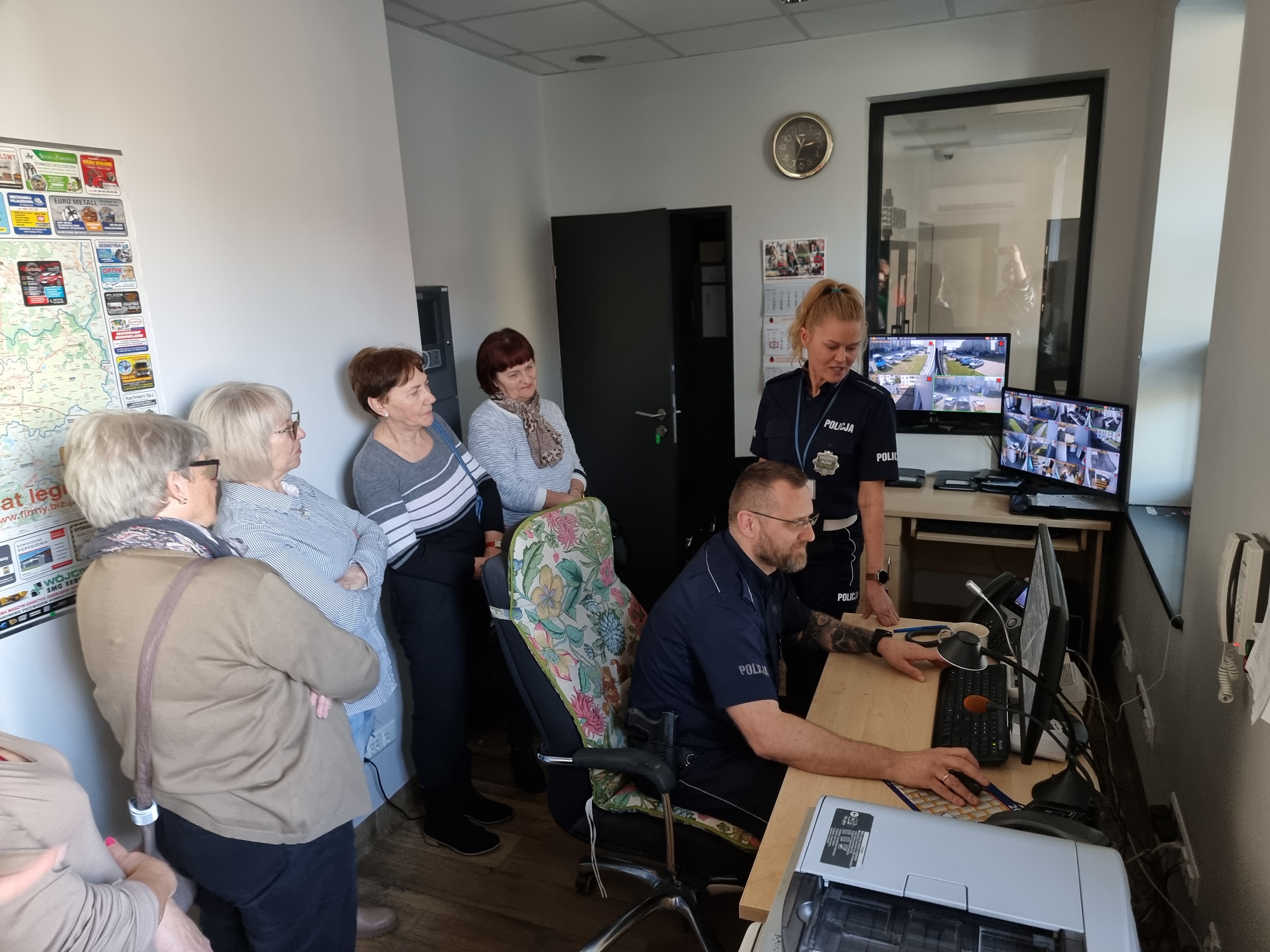 Policjanci pokazali Gościom budynek komendy, gdzie można było zajrzeć na stanowisko dyżurnego i zobaczyć jak wygląda codzienna praca policjantów z Wydziału Ruchu Drogowego. Zaprezentowany został także sprzęt wykorzystywany do pracy w terenie. Dużym zainteresowaniem cieszył się pokaz udzielania pierwszej pomocy przedmedycznej. Policjant opowiadając szczegółowo o zasadach pierwszej pomocy zwrócił uwagę, co jest najważniejsze w pierwszych chwilach, gdy mamy do czynienia z dorosłą osobą poszkodowaną oraz z dzieckiem. Przypomniał o najistotniejszych sprawach podczas łączenia z numerem alarmowym 112 oraz o roli jaką spełniają w życiu codziennym urządzenia AED.