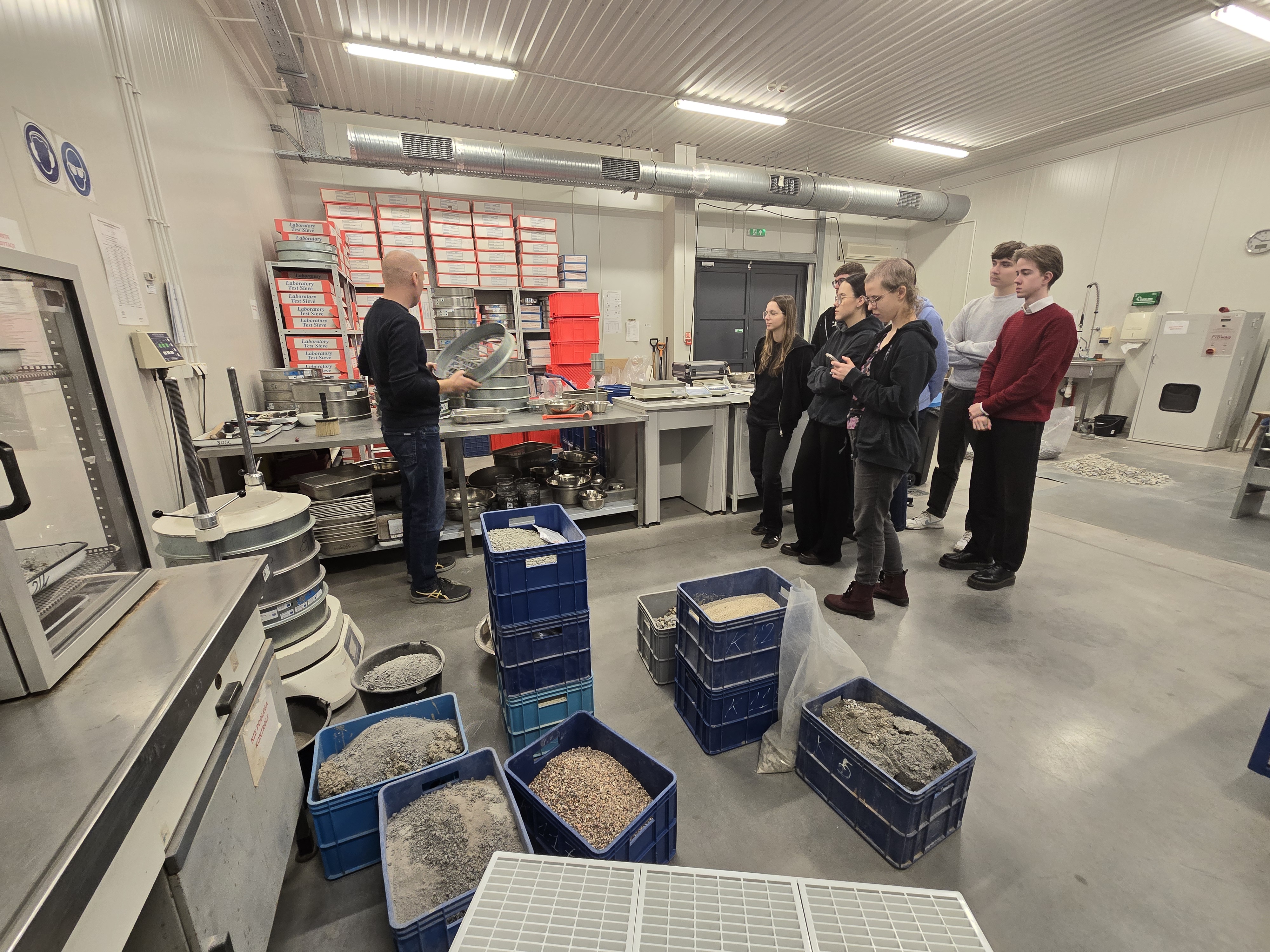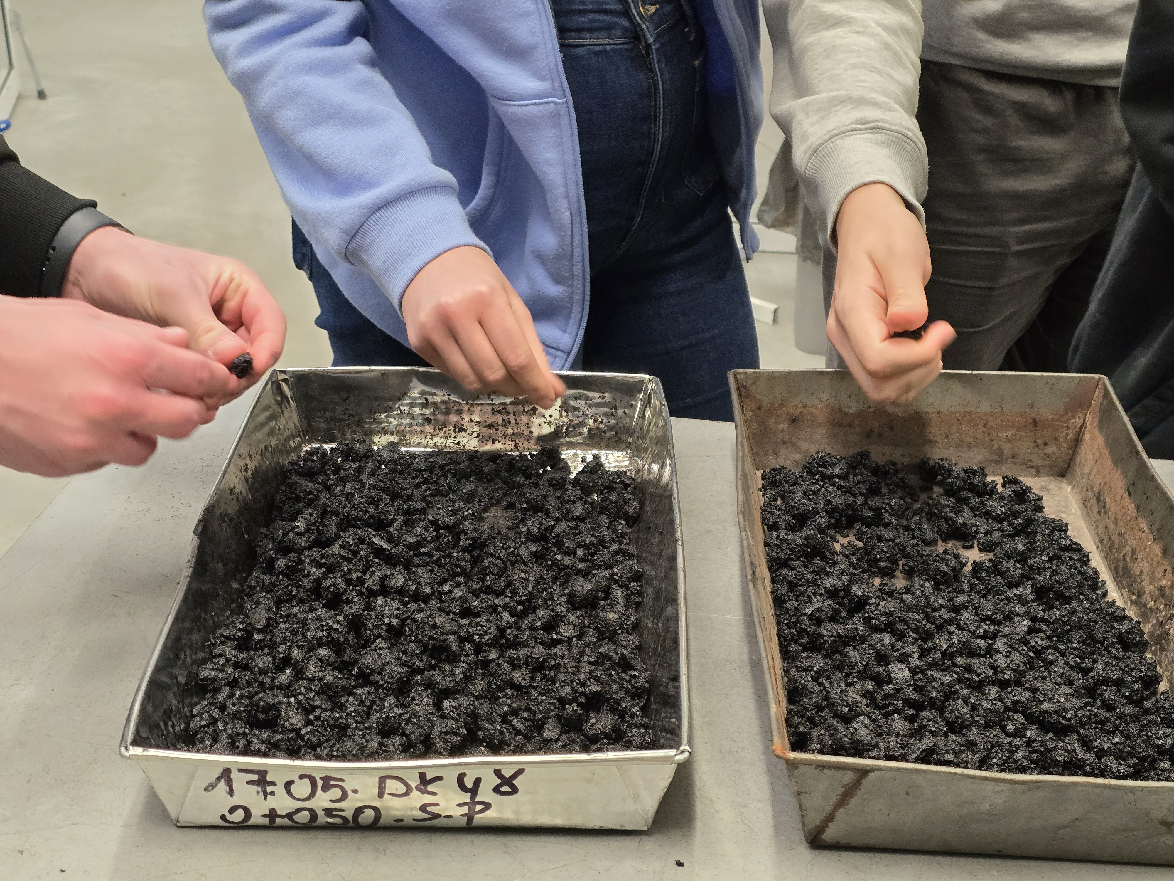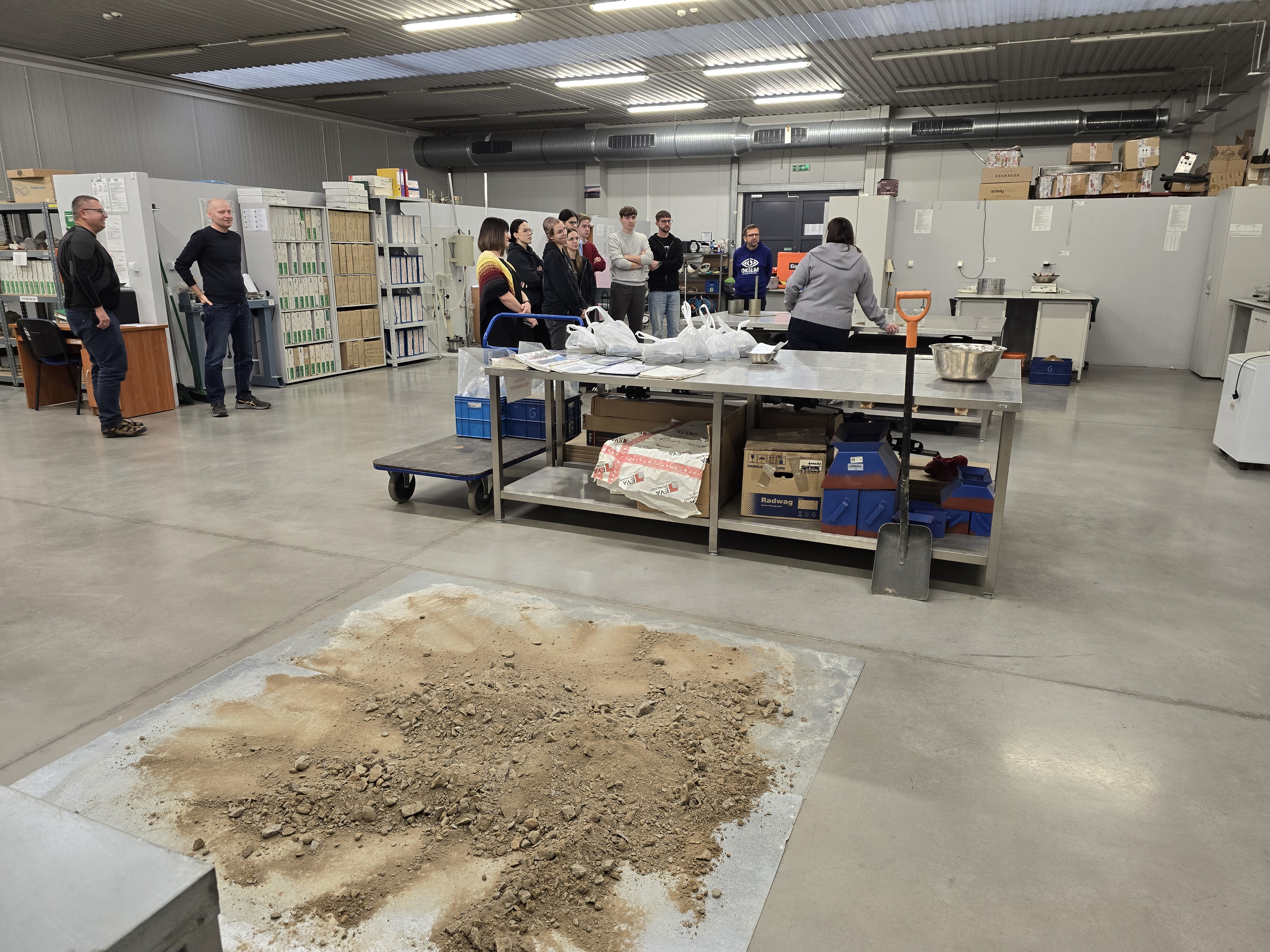 W ramach przedmiotu Geologia Inżynierska, studenci III roku, pod przewodnictwem dr Krzysztofa Chudego, przez ponad cztery godziny obserwowali pracę w laboratorium drogowym. Goście zobaczyli, jak wykonuje się terenowe badania VSS i sondą dynamiczną, a także jakie badania gruntu przeprowadza się w samym laboratorium – m.in. zawartość części organicznych, wskaźnik piaskowy czy badanie Proctora. Dowiedzieli się, dlaczego kształt kruszywa ma znaczenie, po co wykonuje się badanie jego odporności na rozdrabnianie i ścieralność, a także zgłębili tajniki petrografii (nauki o skałach). Adepci poznali właściwości betonu, cementu i galanterii betonowej, m.in. ich wytrzymałość na ściskanie, rozłupywanie i mrozoodporność. Zobaczyli, jak wygląda mieszanka mineralno-asfaltowa pozbawiona, po procesie ekstrakcji, asfaltu. Dowiedzieli się, dlaczego na drodze powstaje koleina, jak się ją bada, jaka jest wolna przestrzeń w nawierzchni i dlaczego sczepność międzywarstwowa jest tak ważna. Studenci poznali również badania, które obrazują czy wykonana nawierzchnia będzie komfortowa i bezpieczna w użytkowaniu, tj. badanie współczynnika tarcia, równości podłużnej i poprzecznej, oznakowania pionowego i poziomego oraz nośności nawierzchni.