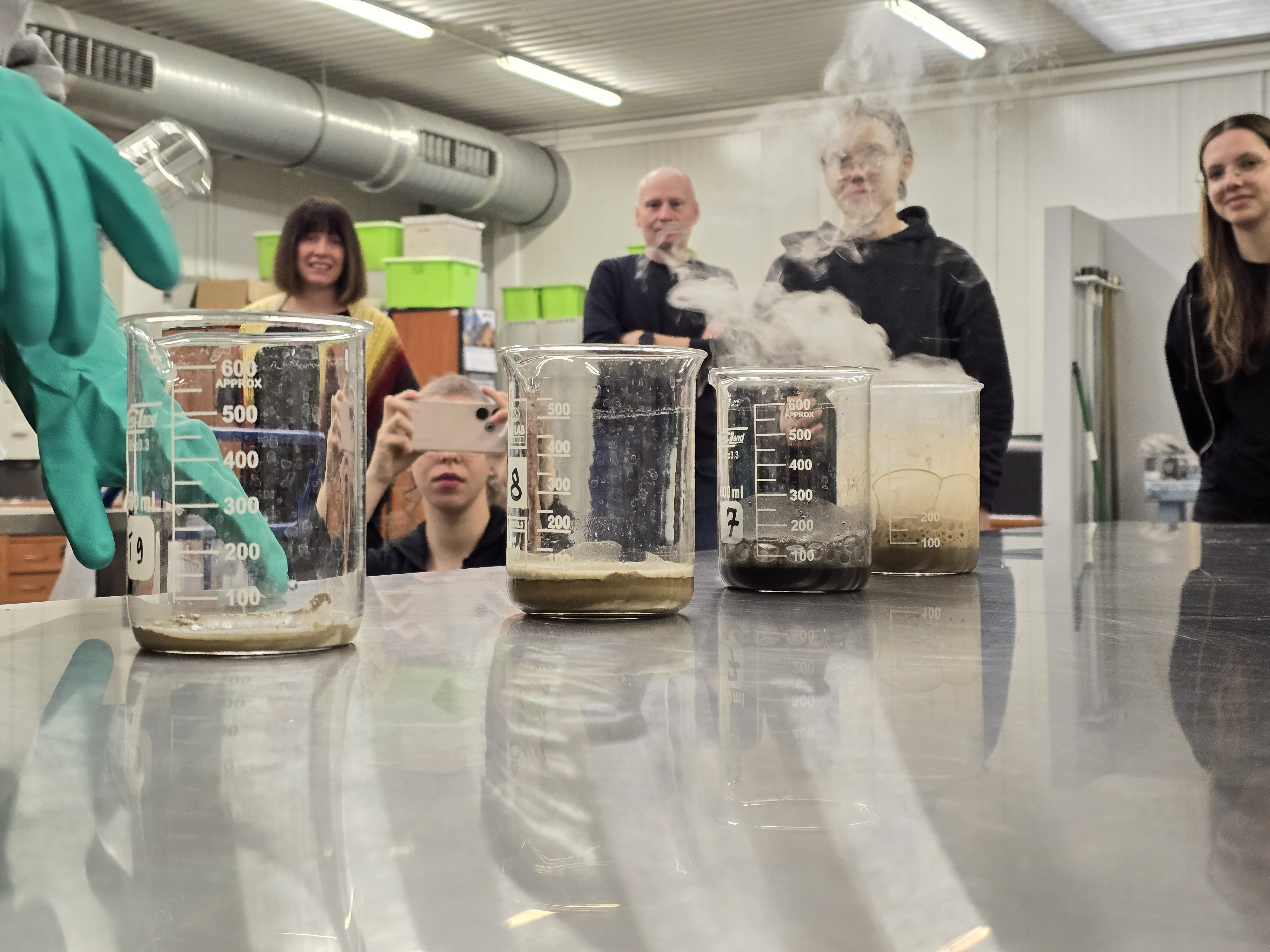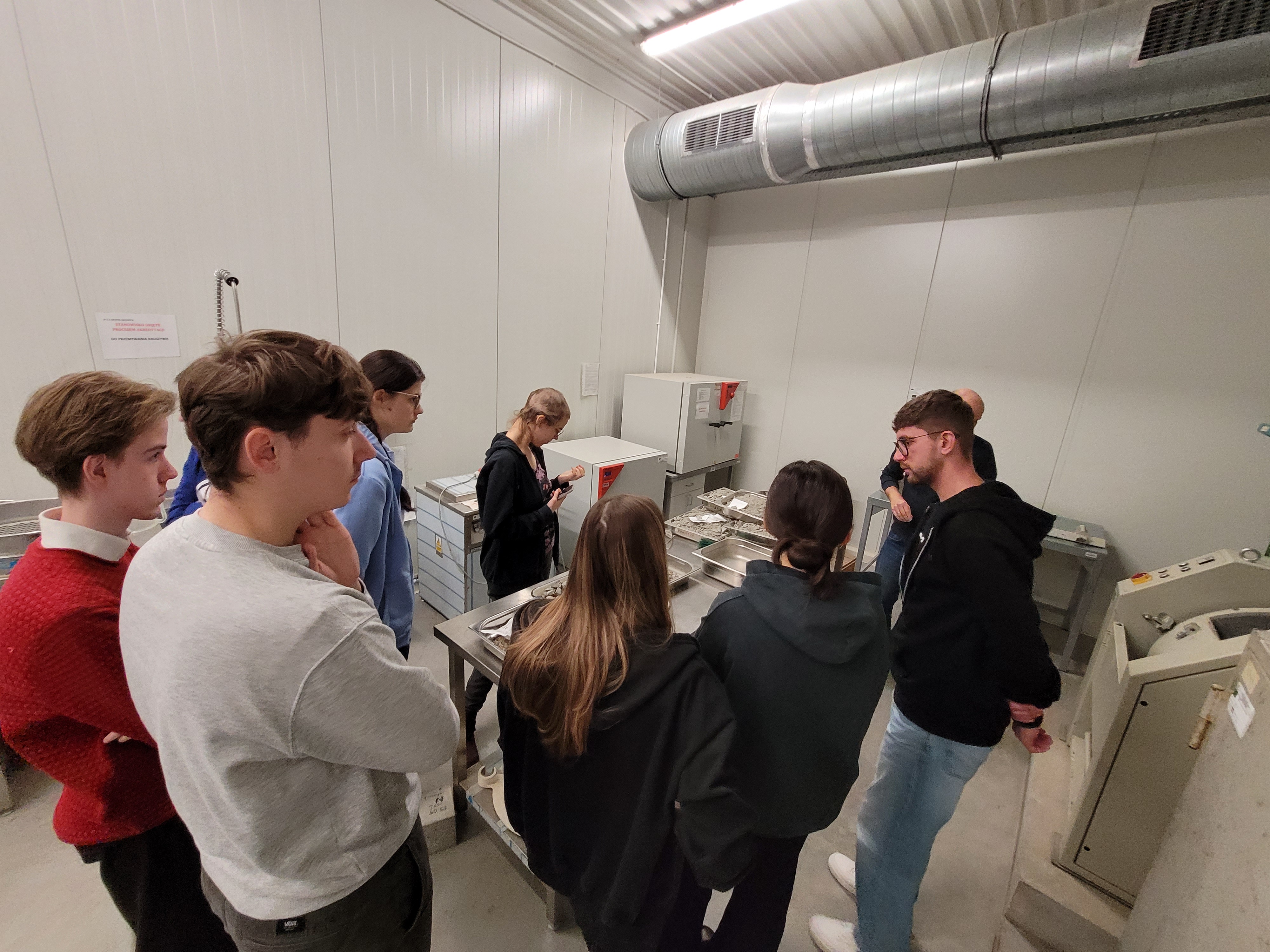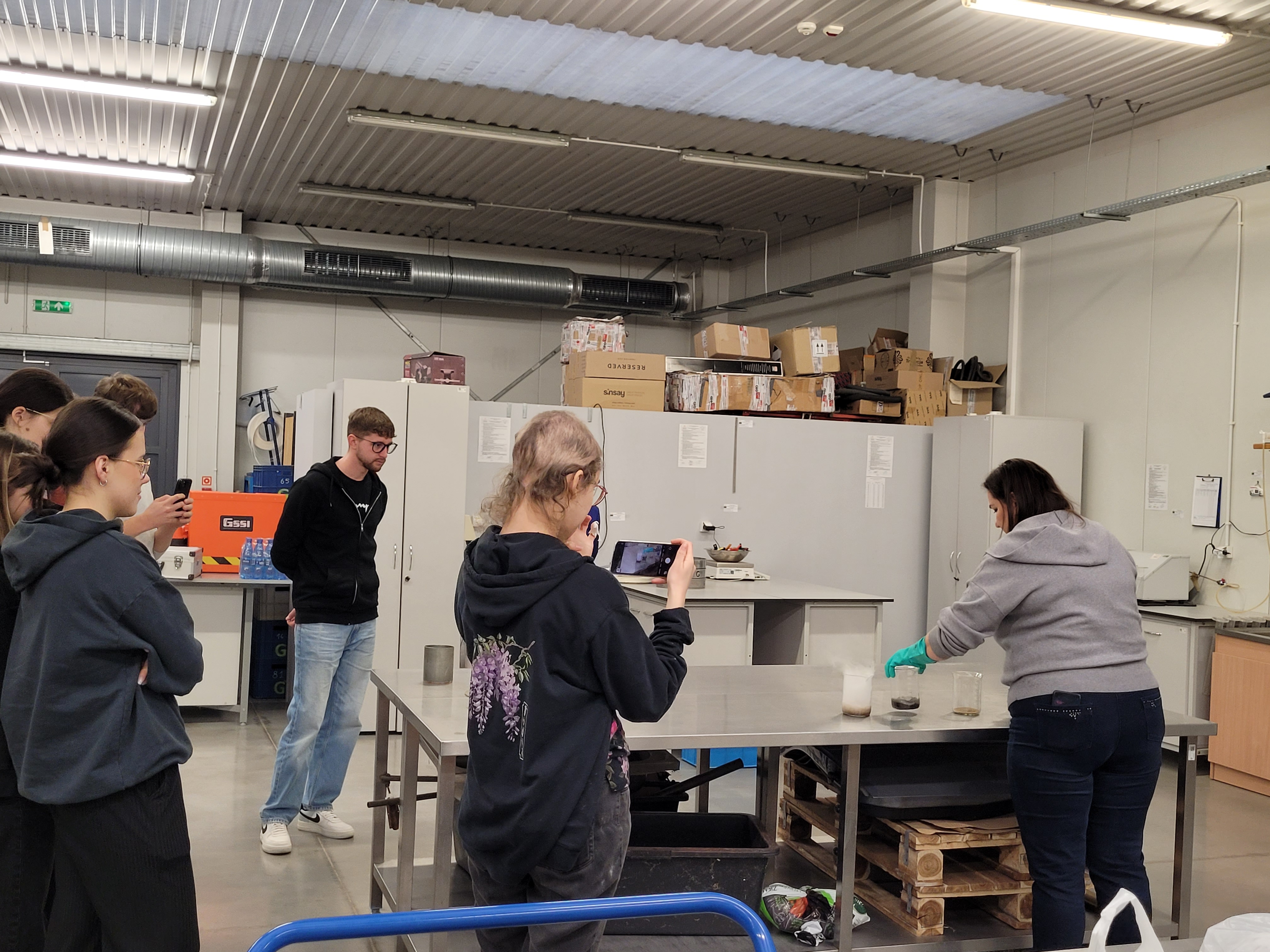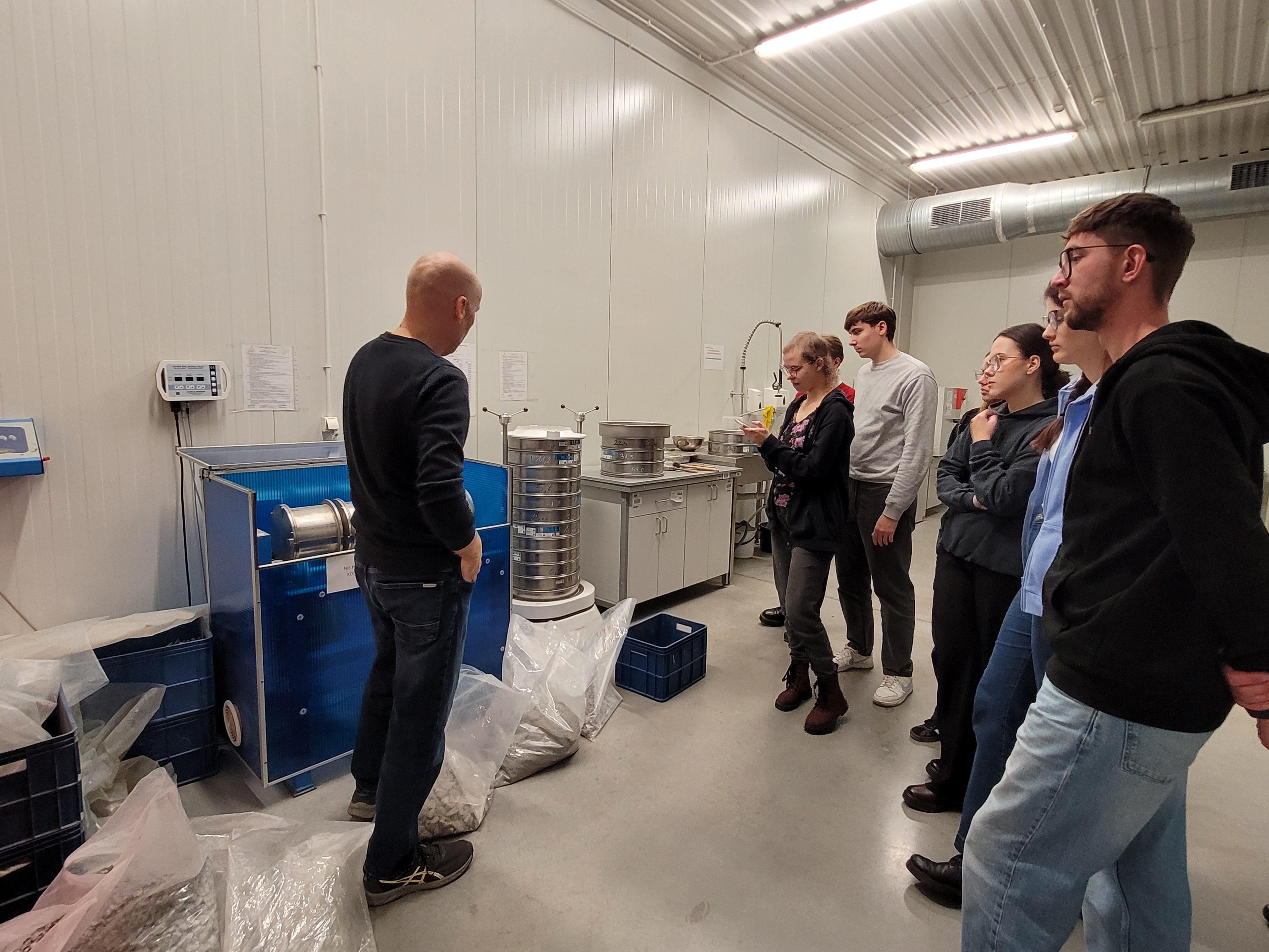 W ramach przedmiotu Geologia Inżynierska, studenci III roku, pod przewodnictwem dr Krzysztofa Chudego, przez ponad cztery godziny obserwowali pracę w laboratorium drogowym. Goście zobaczyli, jak wykonuje się terenowe badania VSS i sondą dynamiczną, a także jakie badania gruntu przeprowadza się w samym laboratorium – m.in. zawartość części organicznych, wskaźnik piaskowy czy badanie Proctora. Dowiedzieli się, dlaczego kształt kruszywa ma znaczenie, po co wykonuje się badanie jego odporności na rozdrabnianie i ścieralność, a także zgłębili tajniki petrografii (nauki o skałach). Adepci poznali właściwości betonu, cementu i galanterii betonowej, m.in. ich wytrzymałość na ściskanie, rozłupywanie i mrozoodporność. Zobaczyli, jak wygląda mieszanka mineralno-asfaltowa pozbawiona, po procesie ekstrakcji, asfaltu. Dowiedzieli się, dlaczego na drodze powstaje koleina, jak się ją bada, jaka jest wolna przestrzeń w nawierzchni i dlaczego sczepność międzywarstwowa jest tak ważna. Studenci poznali również badania, które obrazują czy wykonana nawierzchnia będzie komfortowa i bezpieczna w użytkowaniu, tj. badanie współczynnika tarcia, równości podłużnej i poprzecznej, oznakowania pionowego i poziomego oraz nośności nawierzchni.
