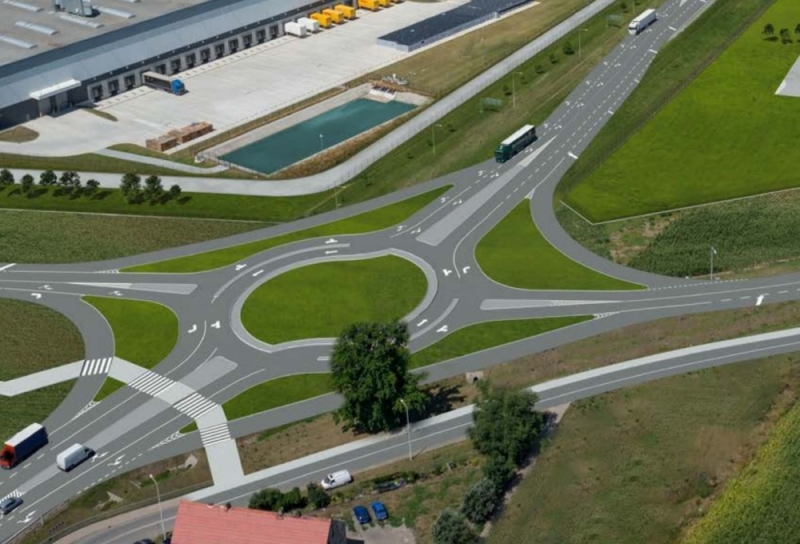 Trwa przebudowa skrzyżowania drogi krajowej nr 8 z ulicą Jesionową w Magnicach na rondo turbinowe. Inwestycja realizowana przez Gminę Kobierzyce.