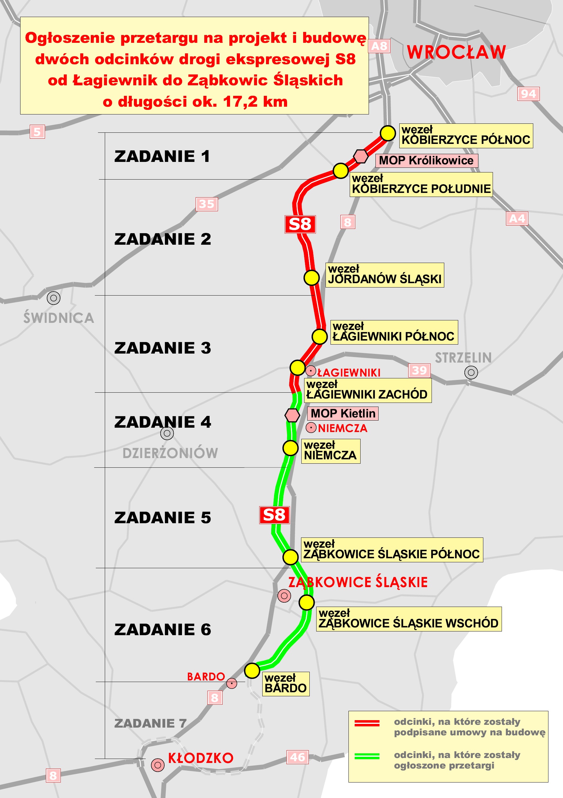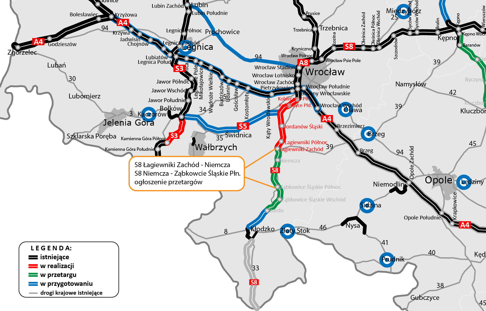 Dziś ogłosiliśmy przetarg dla odcinka pomiędzy Łagiewnikami a Ząbkowicami Śląskimi. Dla odcinka Bardo – Kłodzko jesteśmy w trakcie prac przygotowawczych, których efekt jest uzależniony od wyniku analiz połączenia go z planowaną obwodnicą Złotego Stoku. Po zakończonych analizach wskażemy wariant preferowany, dla którego złożymy wniosek o wydanie decyzji o środowiskowych uwarunkowaniach.