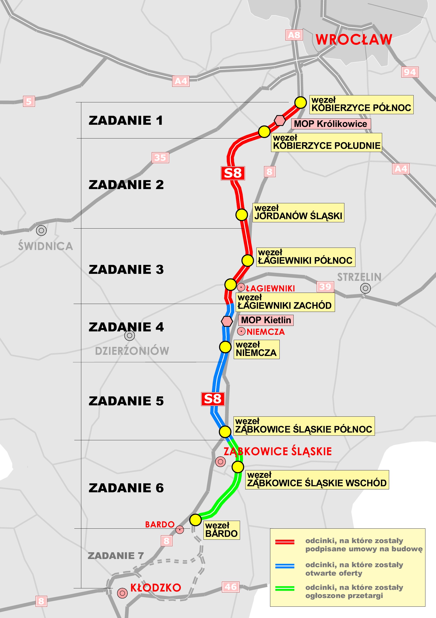 Realizację 87 km drogi ekspresowej pomiędzy Wrocławiem a Kłodzkiem podzieliliśmy na sześć krótszych odcinków. Będzie przedłużeniem kończącego się na wysokości Magnic koło Kobierzyc odcinka S8. Trasa będzie miała dwie jezdnie, z dwoma pasami ruchu w obu kierunkach i pasami awaryjnymi. W przyszłości odcinek pomiędzy węzłami Kobierzyce i Łagiewniki Zachód będzie można rozbudować o trzeci pas ruchu, wykorzystując w tym celu rezerwę w pasie dzielącym. W maju br. Minister Infrastruktury zatwierdził Program inwestycji, który umożliwił nam rozpoczęcie procedury przetargowej na zaprojektowanie i budowę S8.