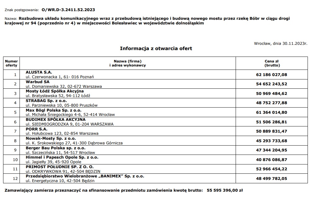 Najniższa, złożona przez firmę Himmel i Papesh Opole Sp. z o.o. oferta ma wartość 40 876 086,87 zł. Najwyższą, na kwotę 62 186 027,08 zł, złożyła firma Alusta S.A. Budżet GDDKiA na realizację tego zadania wynosi o 55 595 396,00 zł.