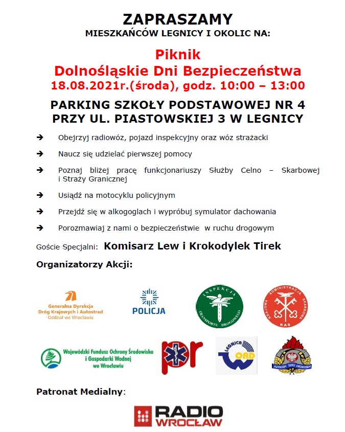 18 sierpnia 2021r., na parkingu Szkoły Podstawowej nr 4 w Legnicy przy ul. Piastowskiej 3 odbędzie się kolejny już Piknik Dolnośląskie Dni Bezpieczeństwa.