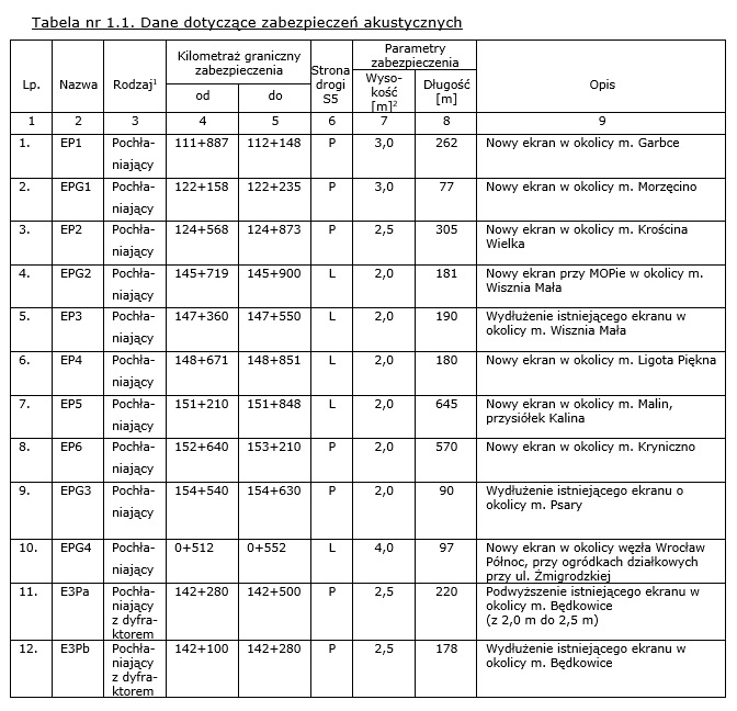 Ochrona akustyczna pojawi się w miejscowościach: Garbce, Morzęcino, Krościna Wielka, Będkowo, Wisznia Mała, Ligota Piękna, Kalina, Kryniczno, Psary oraz Wrocław w obrębie Widawy. Zakłada się, że nowe ekrany akustyczne w pojawią się w kilku lokalizacjach, a w innych dobudujemy lub podwyższymy już istniejące. Aby jak najlepiej określić parametry i lokalizację ekranów, wykonawca zrobi analizę akustyczną, która wskaże aktualne natężenie ruchu na S5. Kolejnym etapem będzie ich realizacja zgodna z obowiązującymi przepisami, najnowszą wiedzą techniczną oraz najlepszą praktyką.