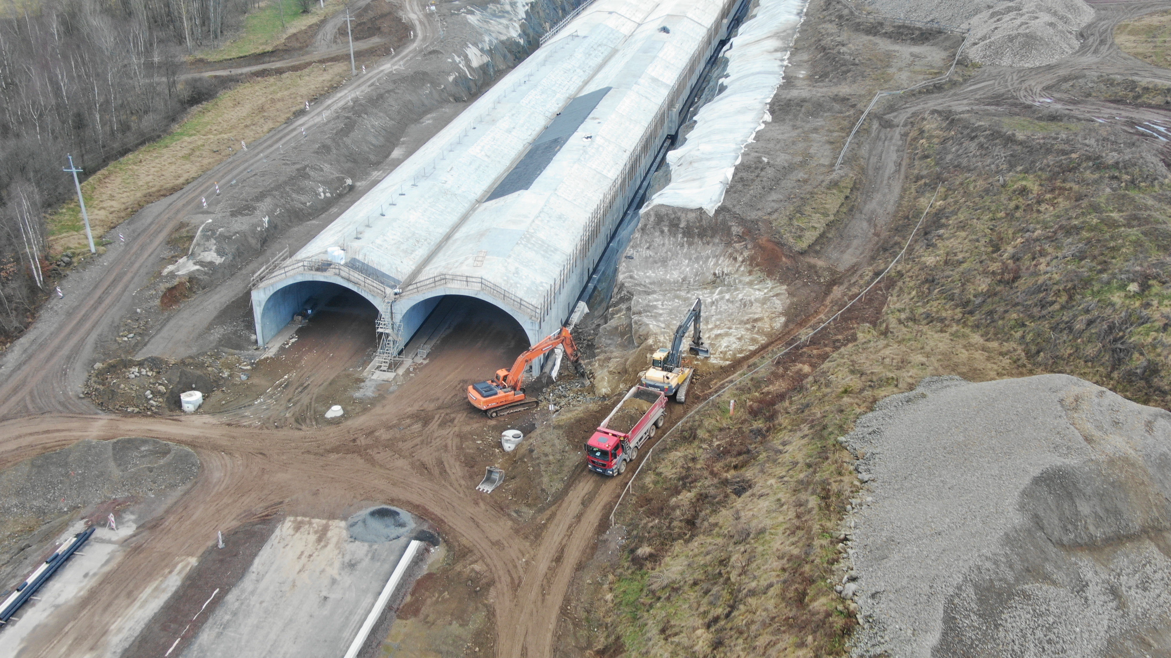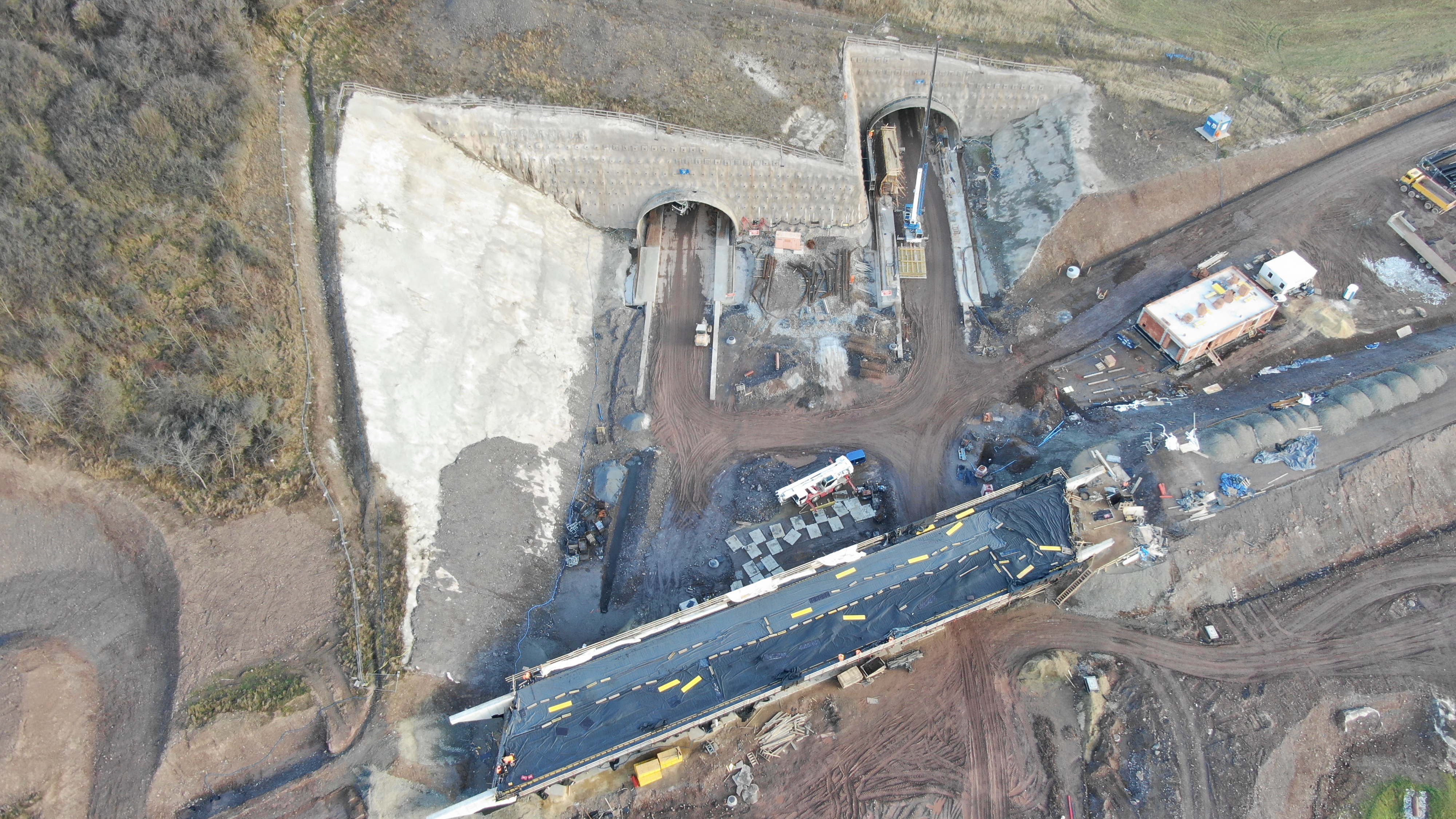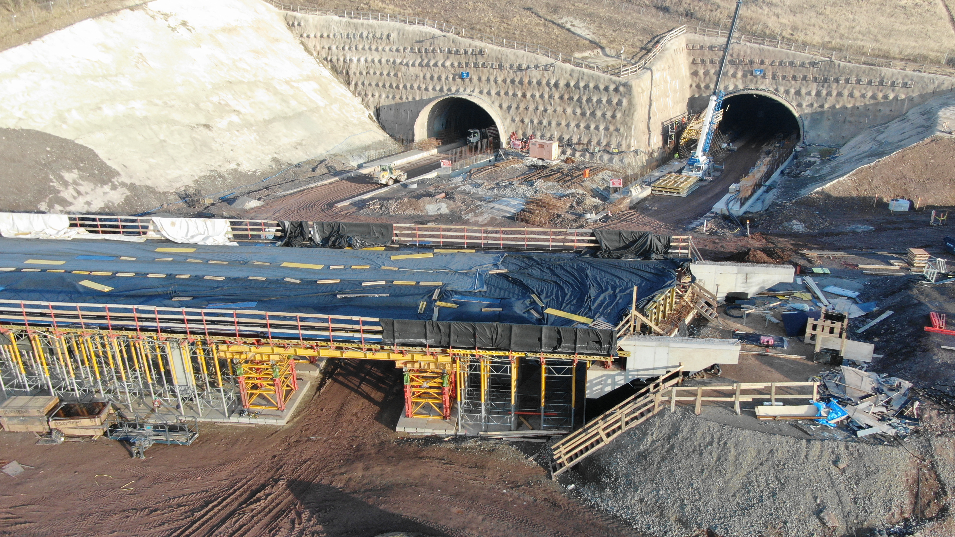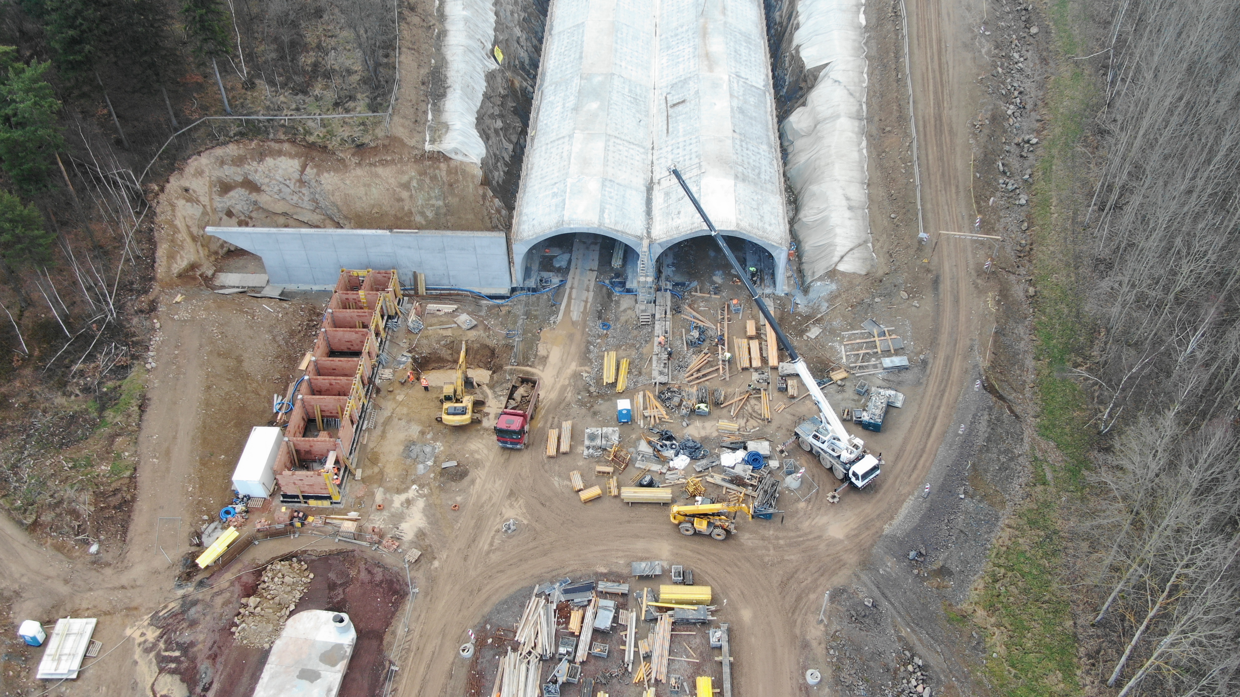 W dłuższym tunelu TS-26 wykonawca kontynuuje prace związane z betonowaniem przyczółków, izolacją, drenażem ściany bocznej oraz innych prac związanych ze strukturą i stabilizacją tunelu. Ukończyliśmy 79% obudowy ostatecznej nawy wschodniej i 61% nawy zachodniej tunelu. Jeszcze w tym półroczu planowane jest zakończenie prac nad obudową ostateczną tunelu. W tunelu TS-32 na ten moment zakończono prace wykopowe i konstrukcyjne związane z zabezpieczaniem skarp oraz betonowaniem ścian. Następne roboty realizowane będą wraz z nadejściem dodatnich temperatur i dotyczyć będą izolacji zewnętrznej tunelu oraz jego zasypki. W kolejnym etapie powstawać będzie nawierzchnia w nawach tunelu.