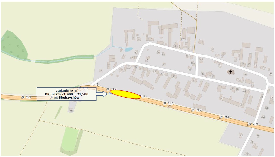 W Biedrzychowie wybudujemy m. in. zatokę autobusową w ciągu głównym DK39 oraz chodnik o długości ok. 76 m. Przebudujemy istniejące odwodnienie i przebudujemy istniejącą sieć wodociągową. Ułożymy płytki dla osób niewidomych i niedowidzących w obrębie ww. przejścia dla pieszych. Przebudujemy niektóre zjazdy indywidualne. NA oferty czekamy do 21 listopada br. Szczegóły przetargu znajdują się na PLATFORMIE ZAKUPOWEJ.