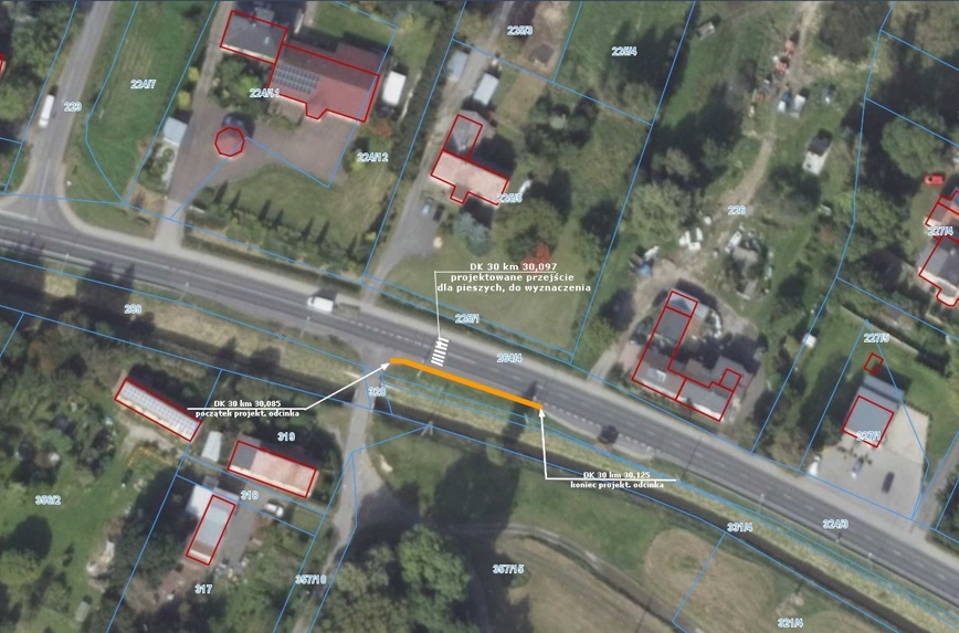 Zadanie zostanie zrealizowane w systemie Projektuj i buduj. W zakresie robót do wykonywania będzie budowa przejścia dla pieszych na DK30 (w km 30), budowa oświetlenia dedykowanego na przejściu dla pieszych wraz z strefą przejściową. Po stronie prawej pomiędzy przejściem dla pieszych a istniejącym peronem zatoki autobusowej powstanie chodnik. Po obu stronach przejścia dla pieszych ułożone zostaną płytki fakturowane dla osób niewidomych i niedowidzących.