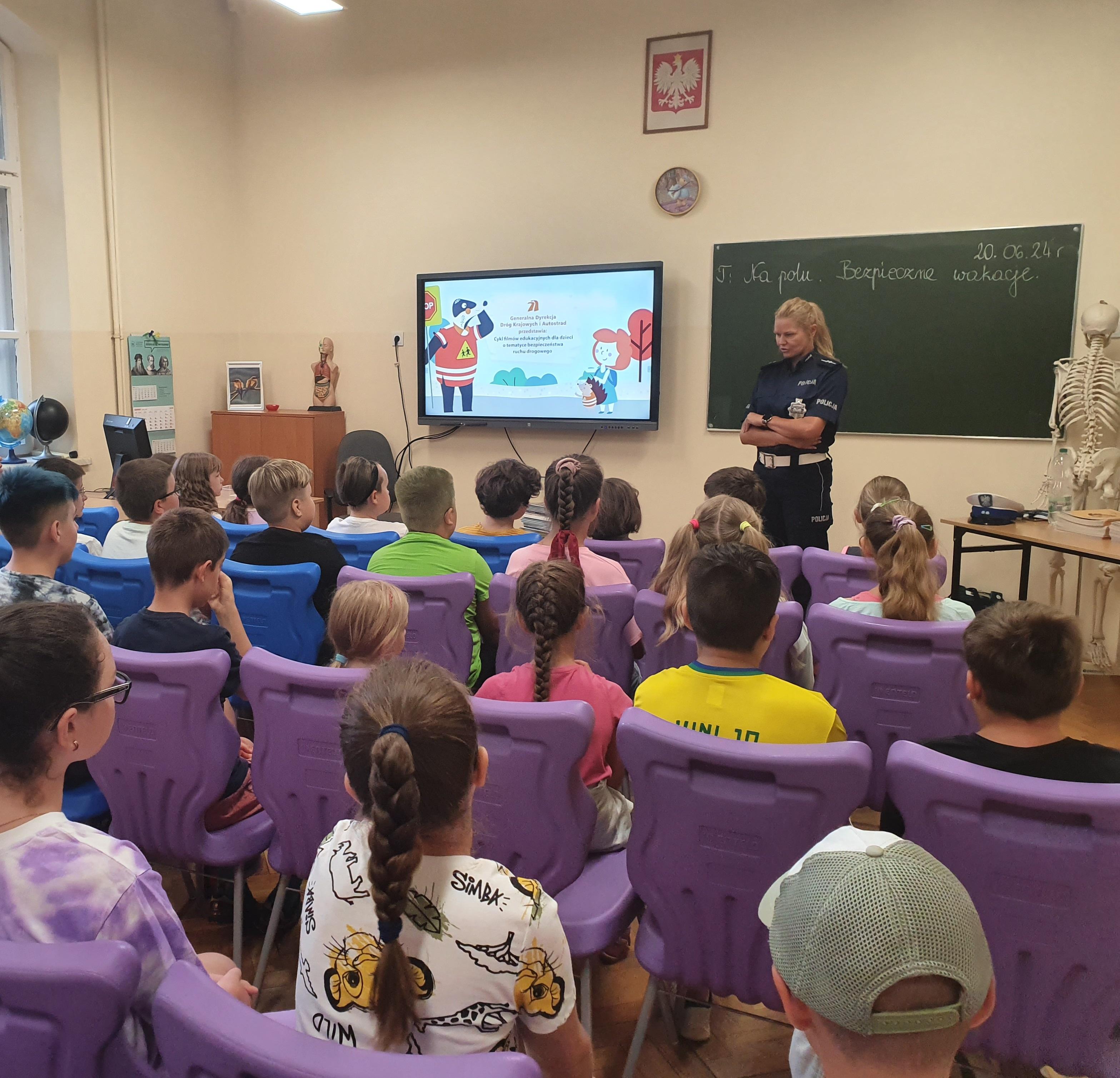 Wakacje w pełni, pogoda dopisuje, a policjanci z drogowcami dbają o bezpieczeństwo najmłodszych. Wspólnie z Komendą Miejską Policji z Legnicy zorganizowaliśmy pogadankę o bezpieczeństwie na półkoloniach w Szkole Podstawowej nr 4 w Legnicy. Spotkanie miało na celu zapoznanie dzieci z zasadami bezpieczeństwa, a przede wszystkim prawidłowego poruszania się po drogach, ze szczególnym uwzględnieniem przechodzenia przez jezdnię. Policjantka przybliżyła najmłodszym tajniki policyjnej służby oraz promowała zasady bezpiecznego wypoczynku letniego. Za aktywny udział wręczaliśmy dzieciom książeczki oraz mapy edukacyjne.