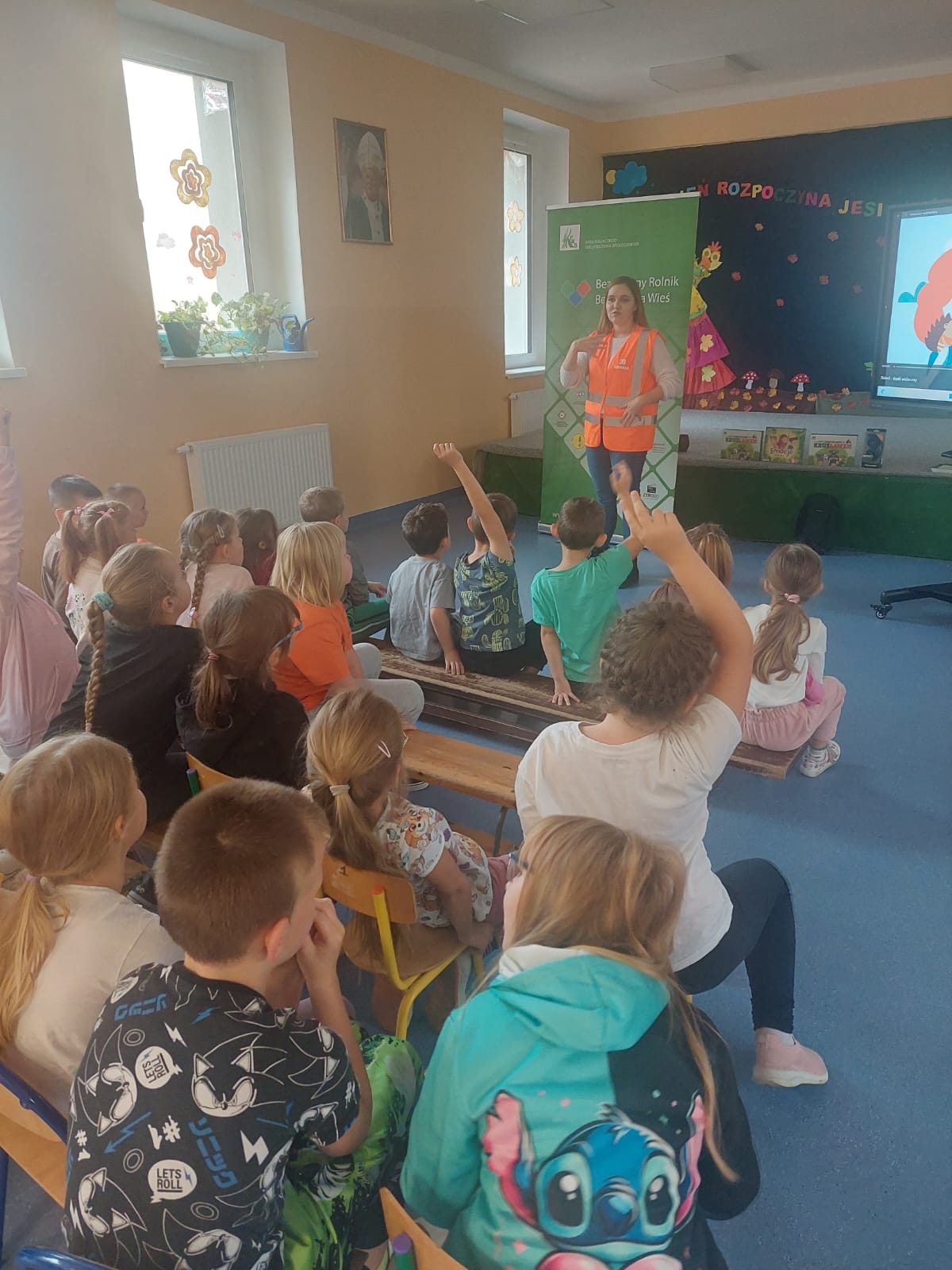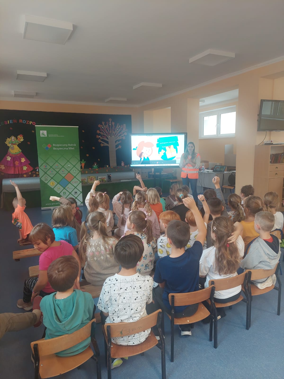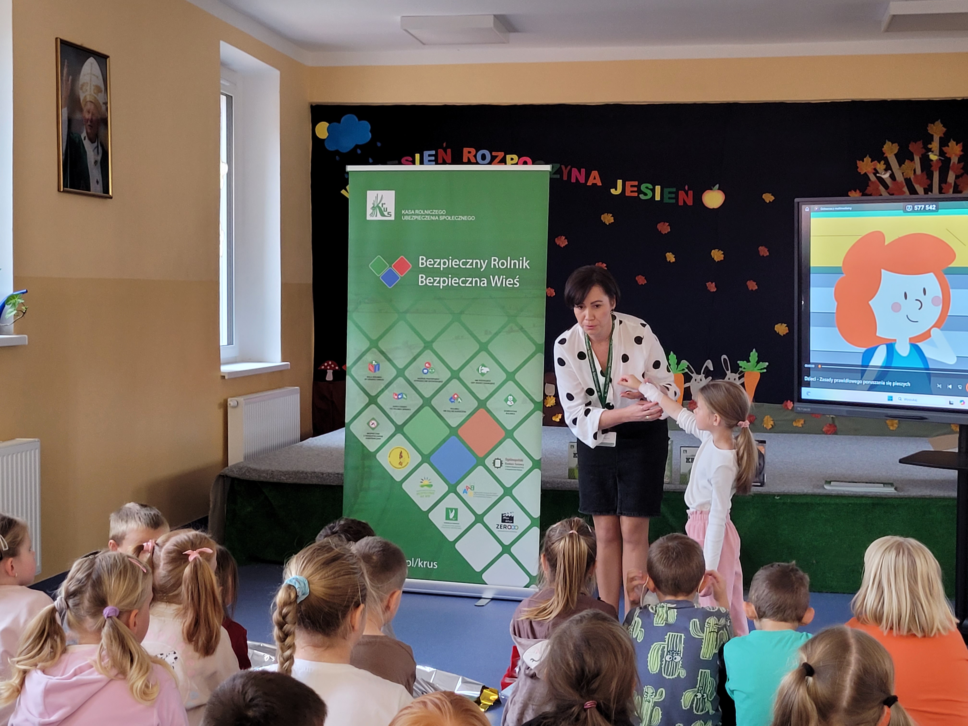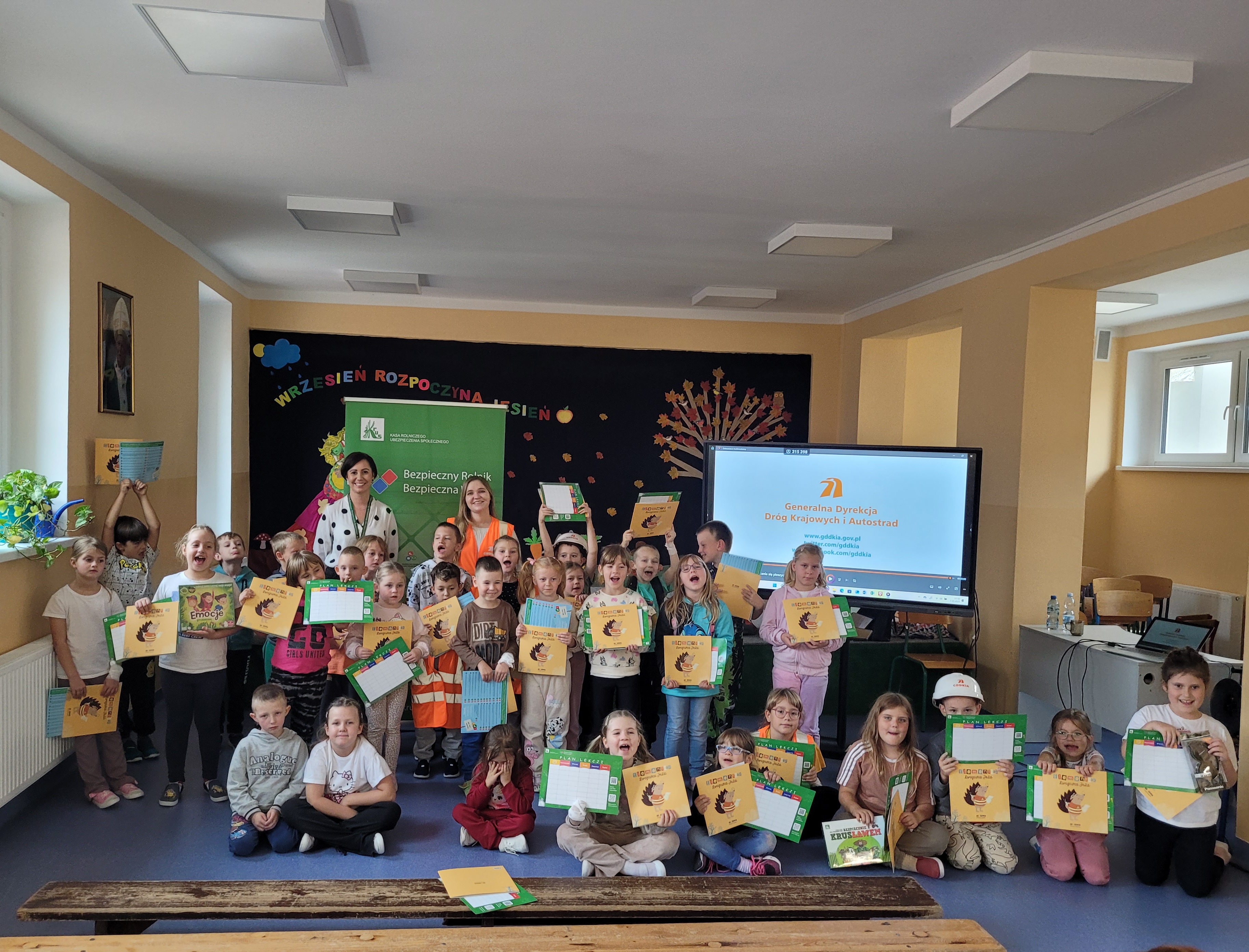 Wraz przedstawicielami Kasy Rolniczego Ubezpieczenia Społecznego z Legnicy rozmawialiśmy o bezpieczeństwie na wsi. Opowiedzieliśmy dzieciom m.in. o tym jak bezpiecznie bawić się na podwórku w otoczeniu pojazdów rolnych i jak bezpieczenie przechodzić przez pasy. Dzieci zapoznały się również z pracą drogowców i brały udział w krótkim pokazie pierwszej pomocy. Za aktywny udział każdy otrzymał od nas drobny upominek.