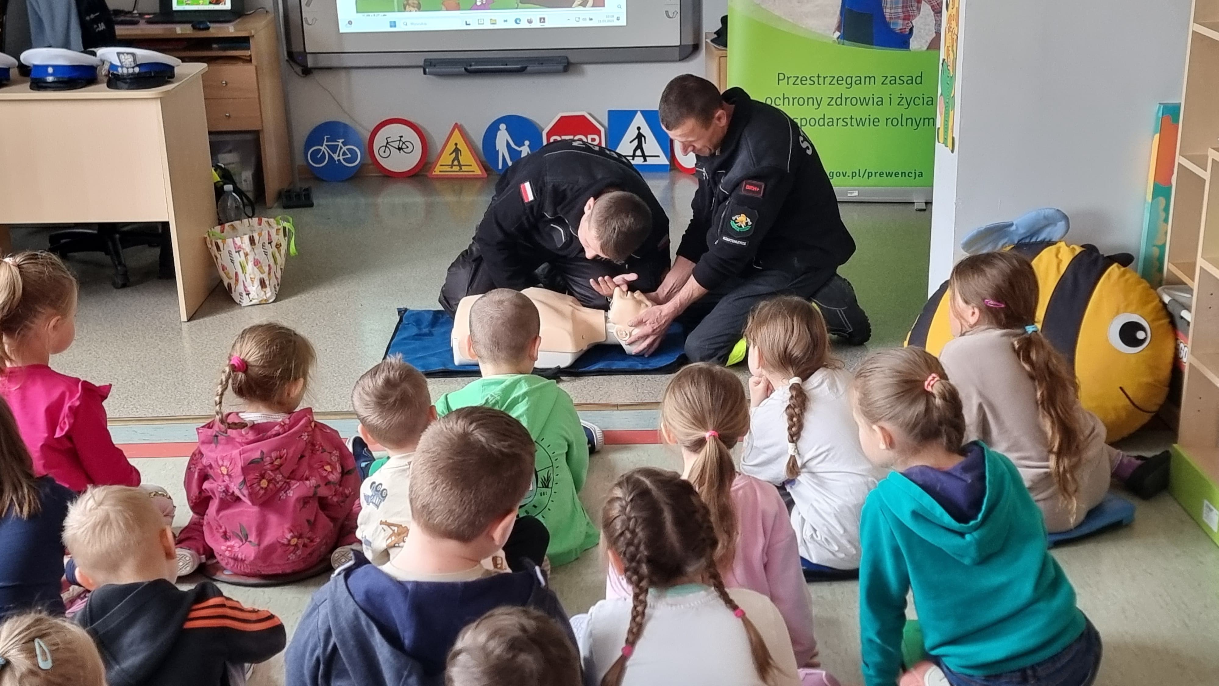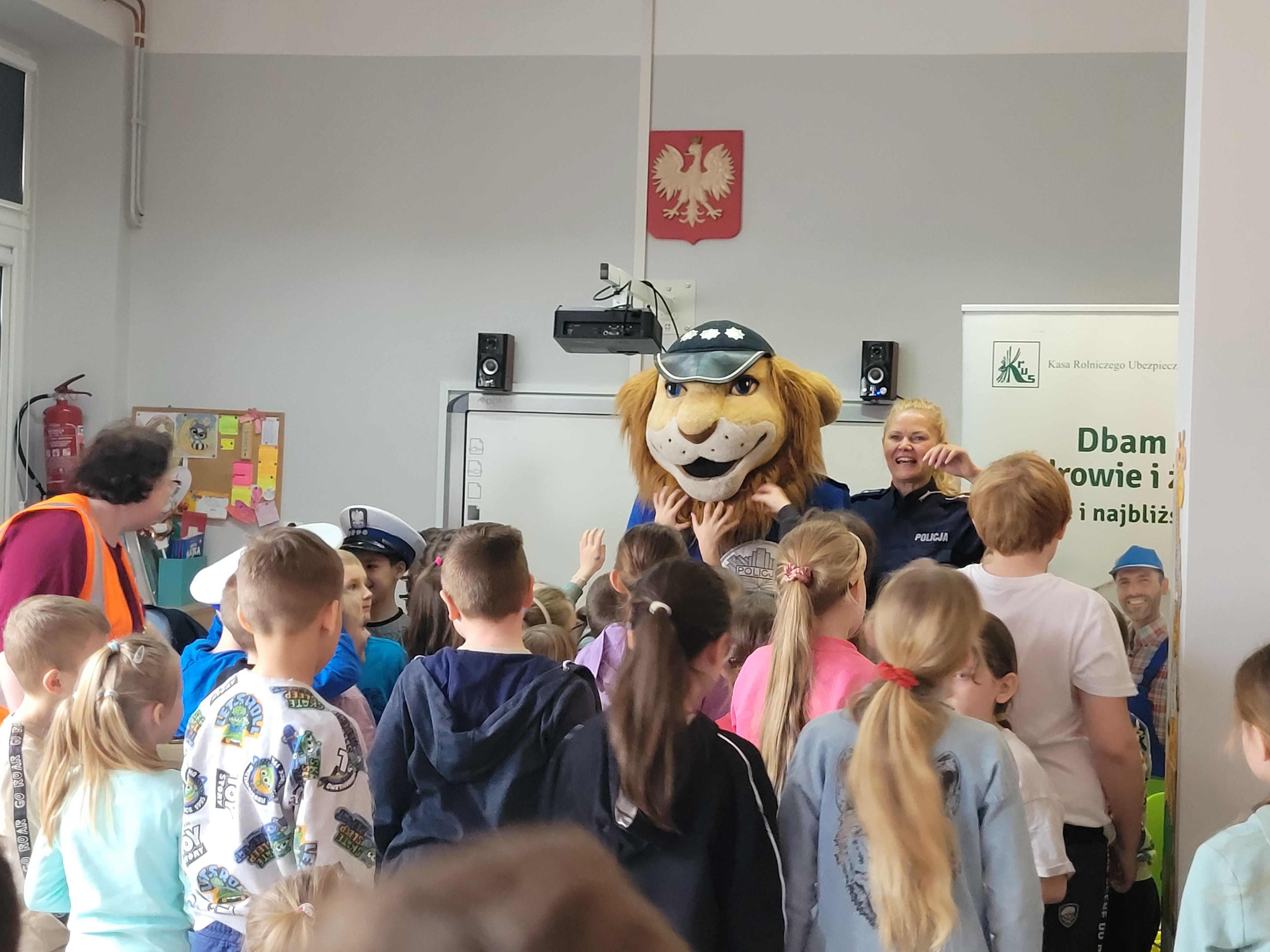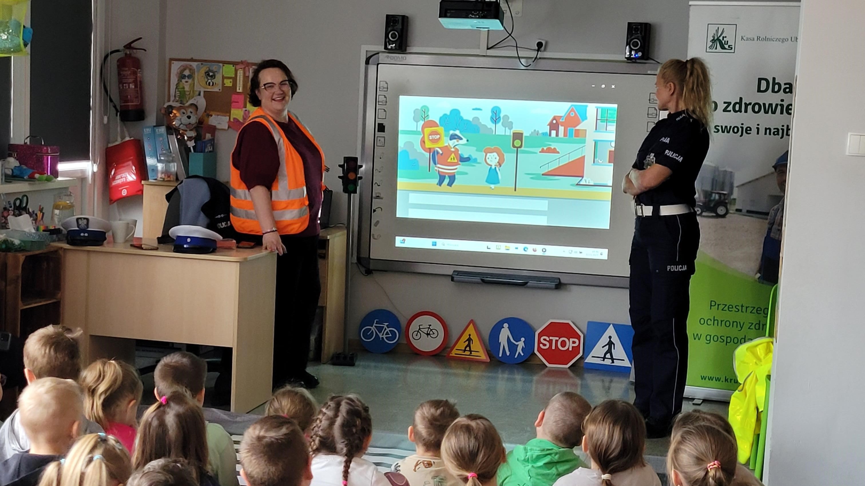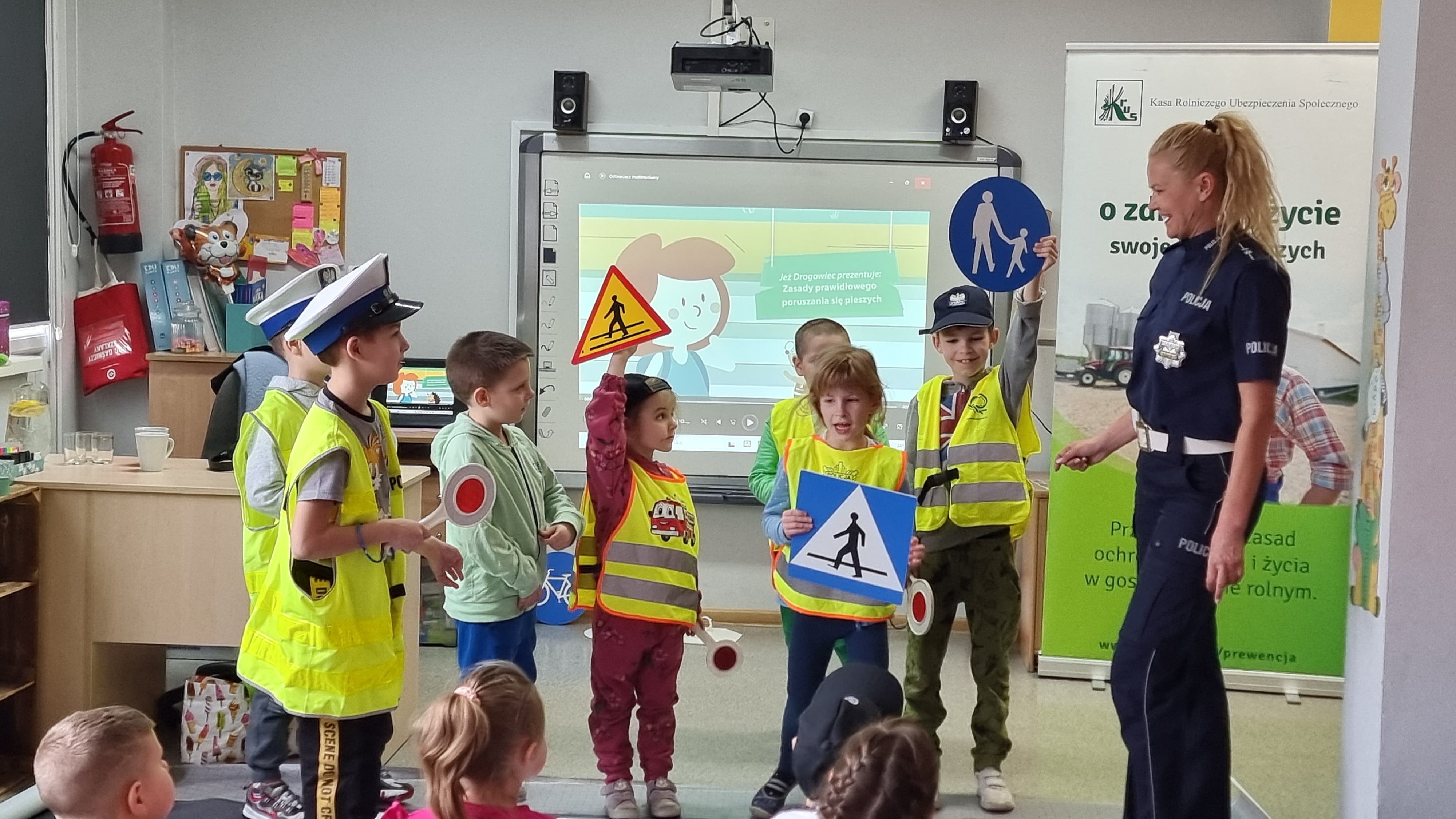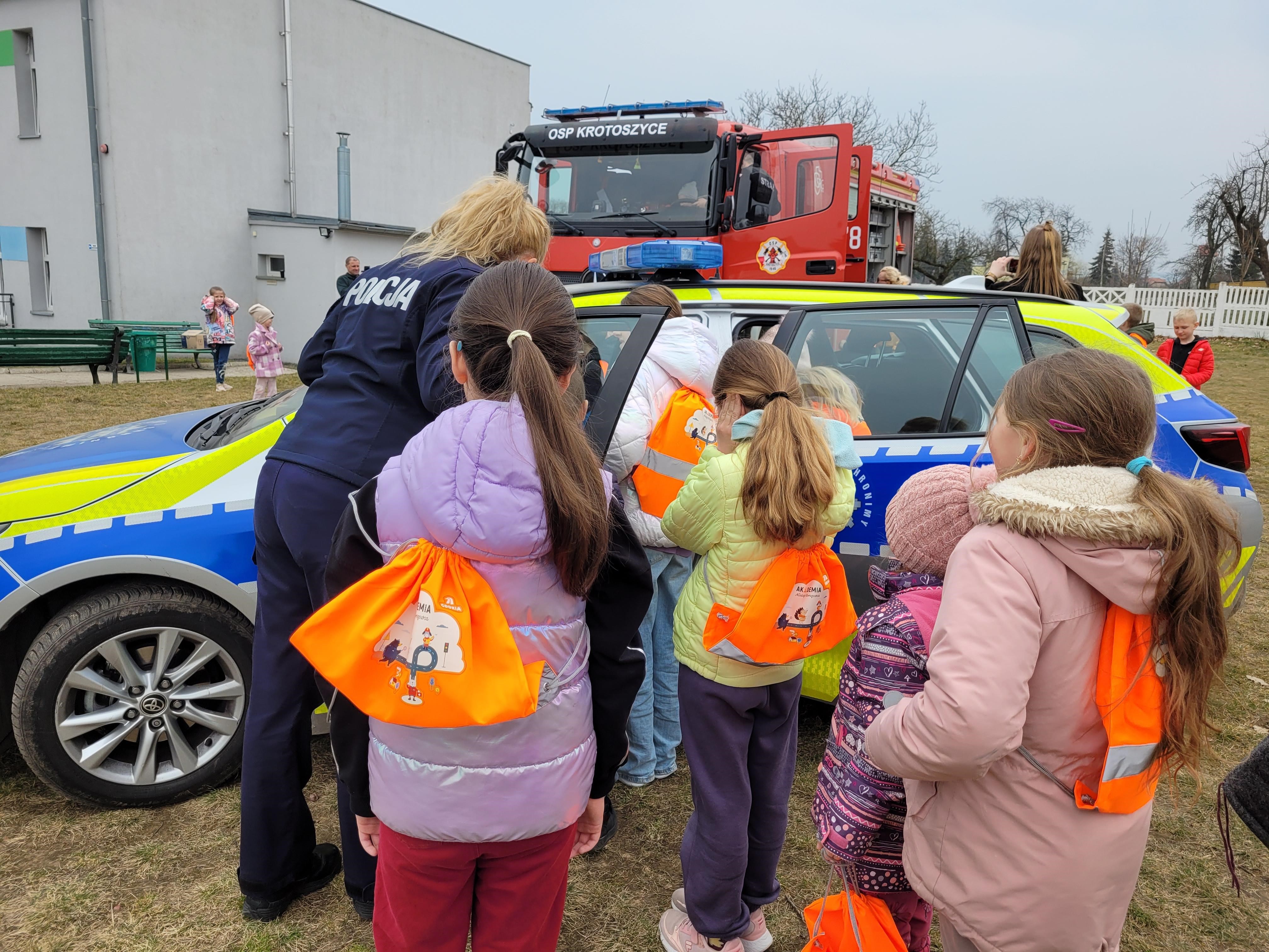 Wraz przedstawicielami Kasy Rolniczego Ubezpieczenia Społecznego z Legnicy, Komendy Miejskiej Policji z Legnicy oraz Ochotniczej Straży Pożarnej z Krotoszyc, rozmawialiśmy o bezpieczeństwie na wsi. Dzieci dowiedziały się m.in. jak bezpiecznie bawić się w otoczeniu pojazdów rolnych, jak bezpiecznie poruszać się po drodze i przechodzić przez pasy oraz jak udzielić komuś pierwszej pomocy. Oprócz tego poznały również zadania drogowców. Policjantka szczególną uwagę poświęciła tematowi braku uwagi na drodze. W akcji „Na drodze – patrz i słuchaj!” policjanci informują o niebezpieczeństwach, jakie niesie ze sobą np. głośne słuchanie muzyki na słuchawkach podczas przechodzenia przez przejście dla pieszych.
