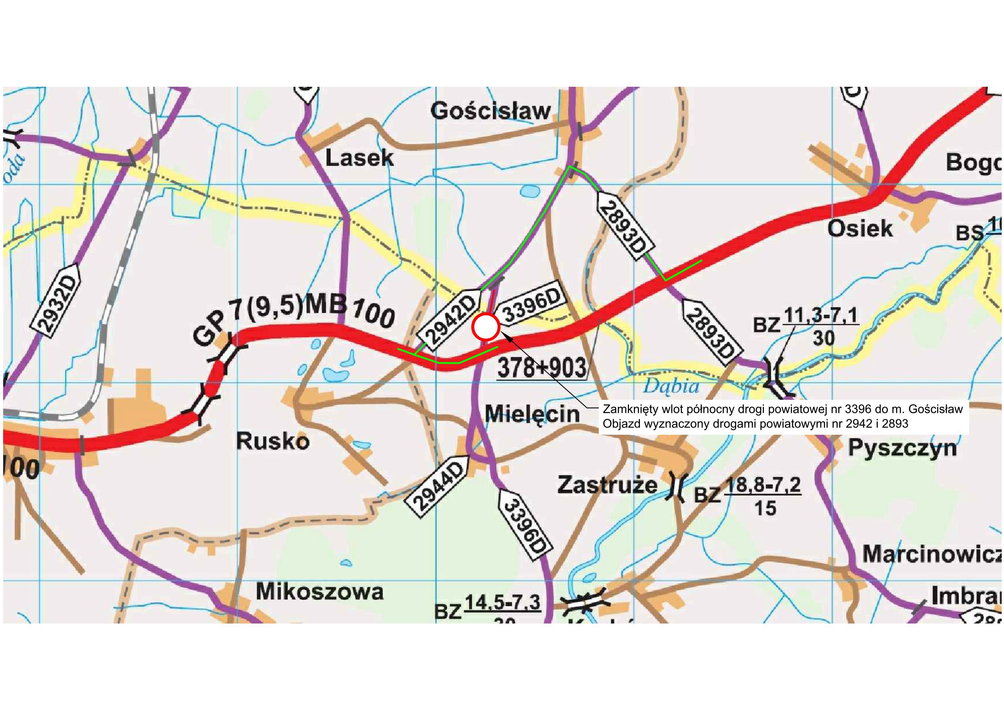 W najbliższych dniach Wykonawca rozpocznie prace związane z wycinką drzew, odhumusowaniem oraz wymianą konstrukcji jezdni na drodze powiatowej w kierunku Gościsławia. W związku z tym zamknięty zostanie jeden północny wlot drogi powiatowej nr 3396 do miejscowości Gościsław, a objazd zostanie poprowadzony drogami powiatowymi nr 2942 i 2893 relacji Rusko – DK5 – Gościsław i Pyszczyn – DK5 – Gościsław.