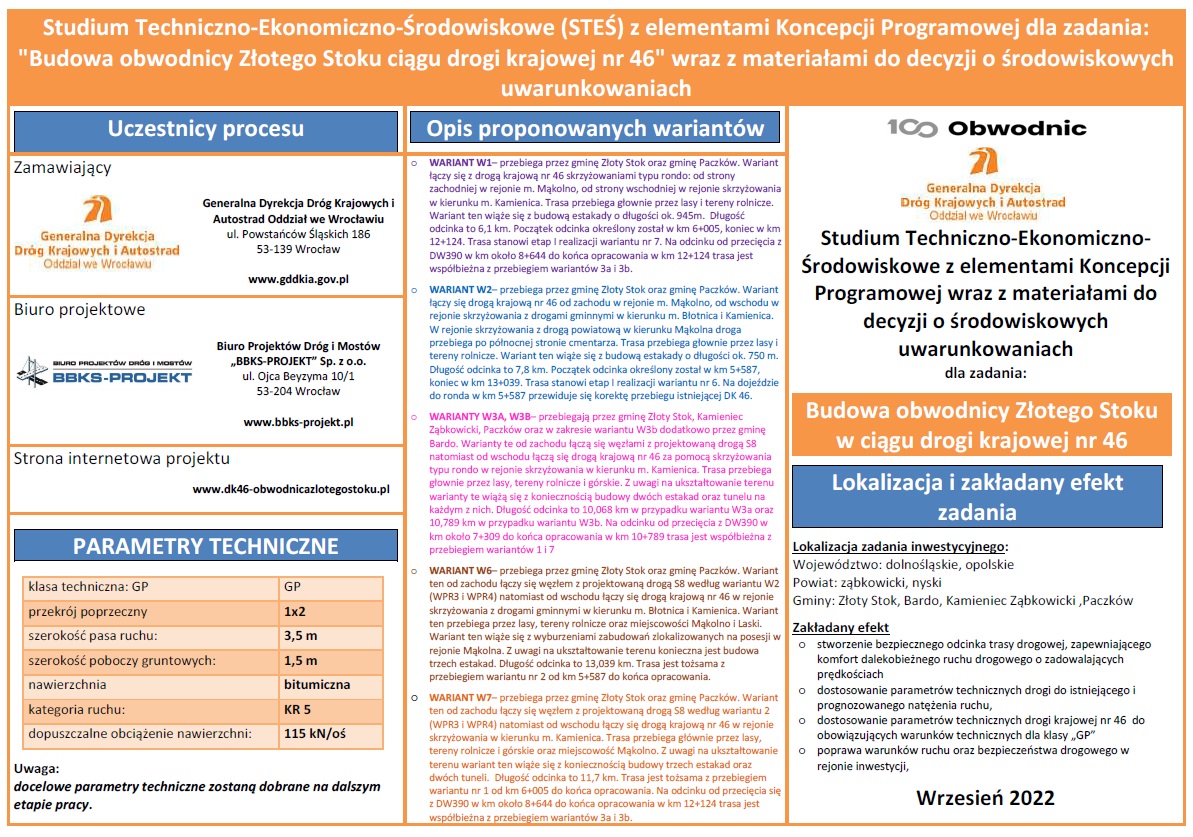 Na etapie Studium techniczno-ekonomiczno-środowiskowego z elementami koncepcji programowej (STEŚ-R) wyznaczone i poddane analizie wielokryterialnej zostaną przebiegi korytarzy obwodnicy Złotego Stoku w ciągu DK46. Trasa będzie miała długość ok. 8 km. Przeanalizowanych zostanie kilka jej wariantów. W ramach inwestycji wykonane zostaną roboty drogowe, odwodnienie, zieleń drogowa. Powstaną nowe obiekty inżynierskie, urządzenia bezpieczeństwa ruchu, kanały technologiczne oraz urządzenia ochrony środowiska.