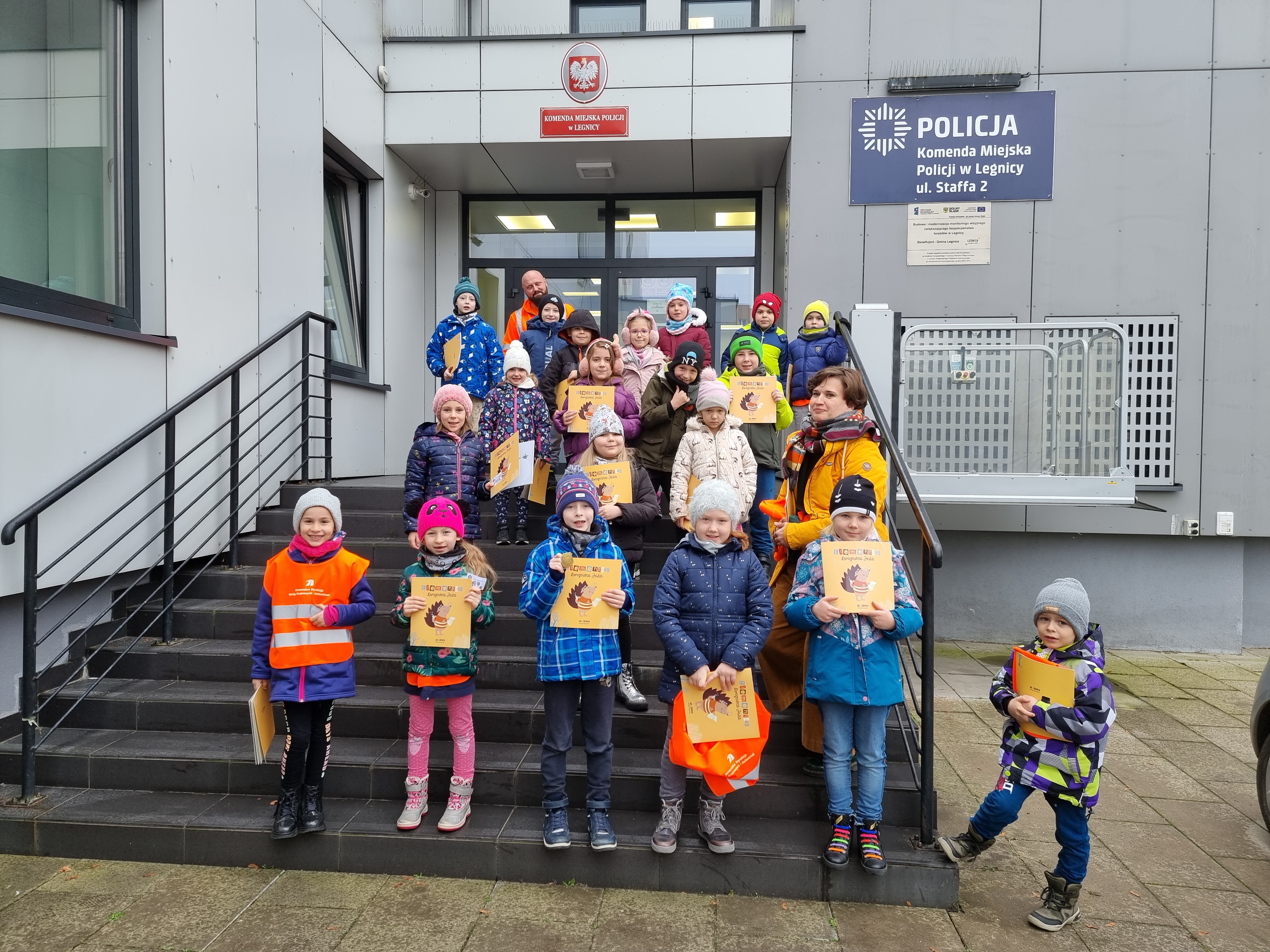 Maluszki odwiedziły policjantów w komendzie przy ul. Staffa w Legnicy. Funkcjonariusze przybliżyli uczestnikom zasady bezpieczeństwa w ruchu drogowym oraz przypomnieli o noszeniu odblasków. Po krótkiej teorii była praktyka, do której zaproszono Komisarza Lwa-maskotkę dolnośląskiej Policji, który zachęcał najmłodszych do noszenia odblasków. Każde dziecko zostało wyposażone w elementy odblaskowe GDDKiA oraz Elementarz Drogowca Jeża.