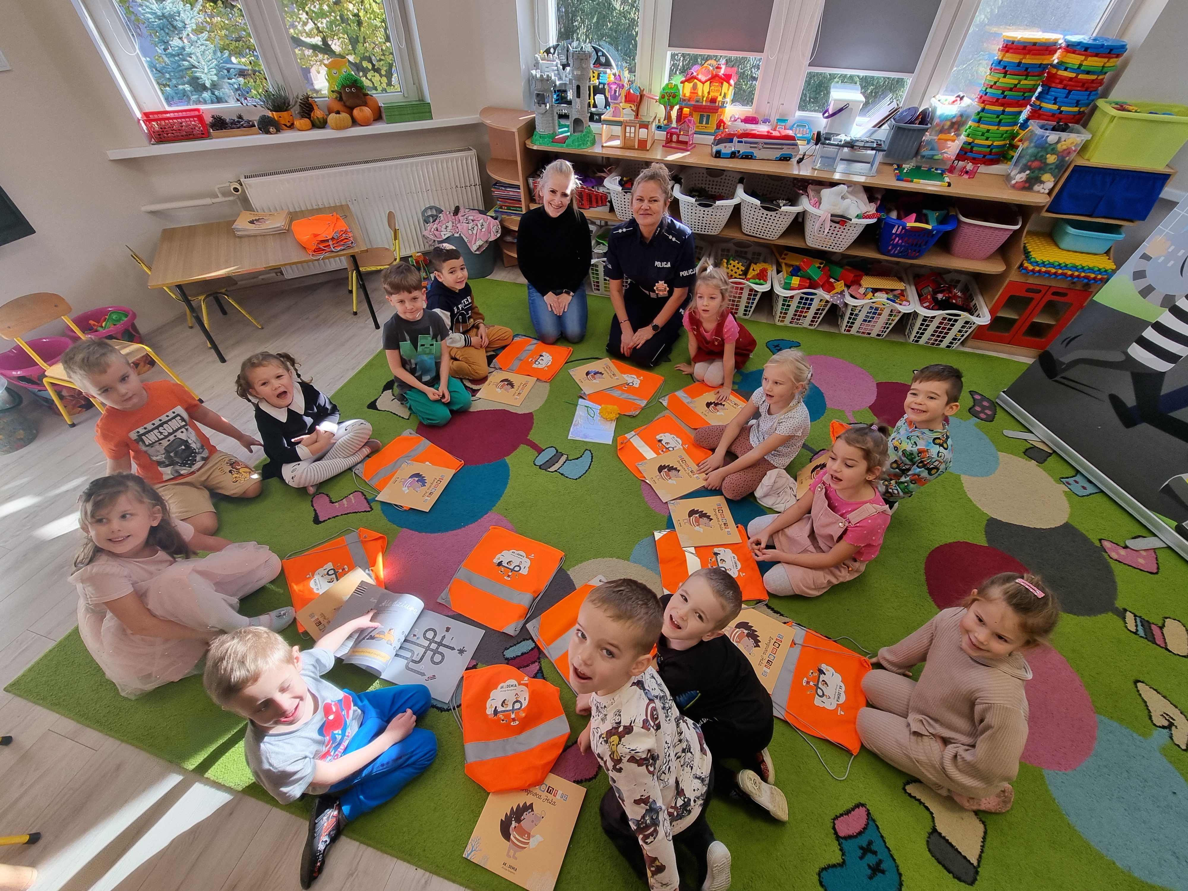 Na koniec spotkania przypomnieliśmy dzieciom o odblaskach, które bezwzględnie powinny znaleźć się na ich odzieży wierzchniej, gdyż dobra widoczność na drodze to gwarancja bezpieczeństwa uczestników ruchu drogowego. Przedszkolaki otrzymały na pamiątkę Elementarz Drogowca Jeża oraz worki odblaskowe.