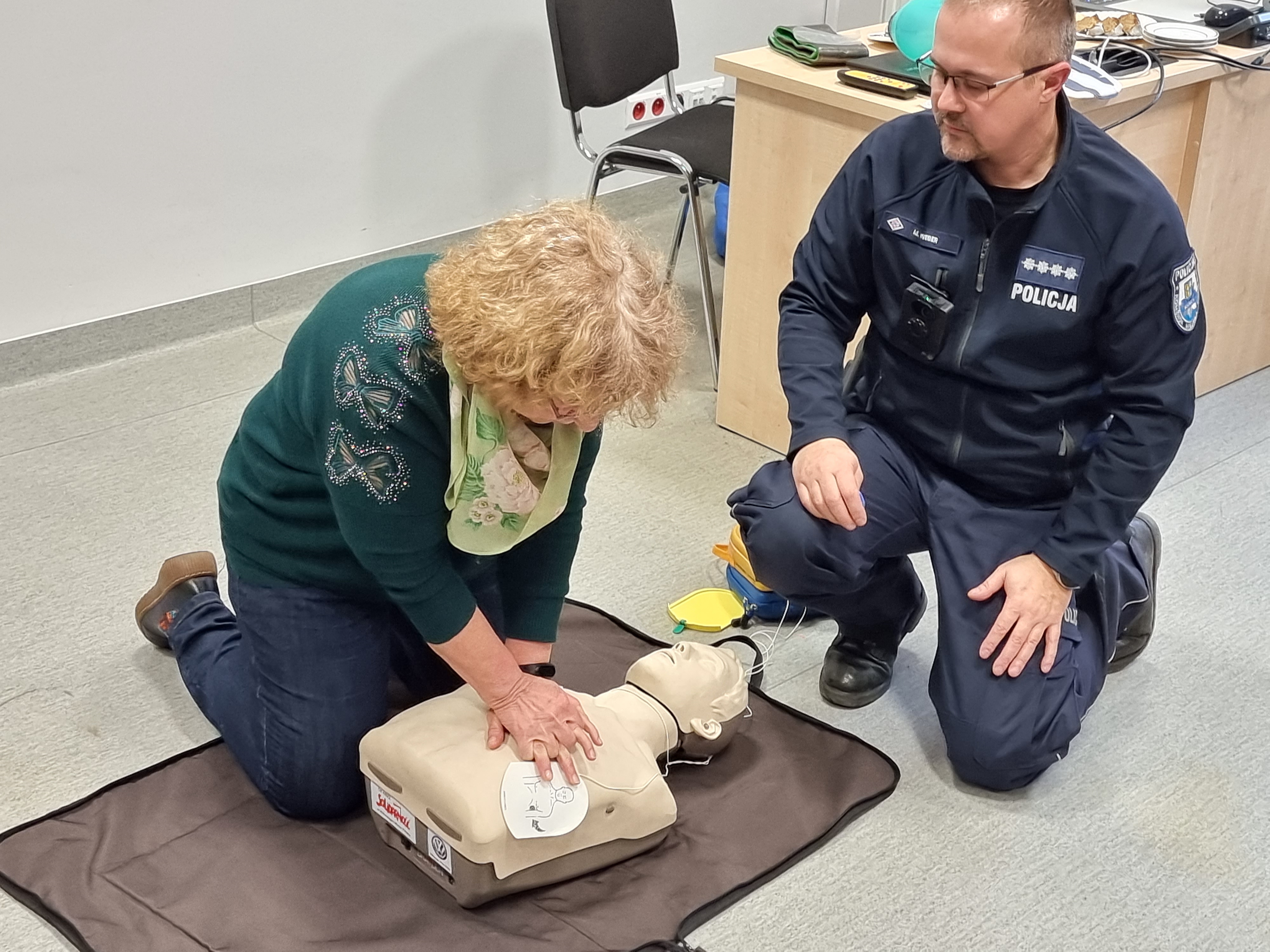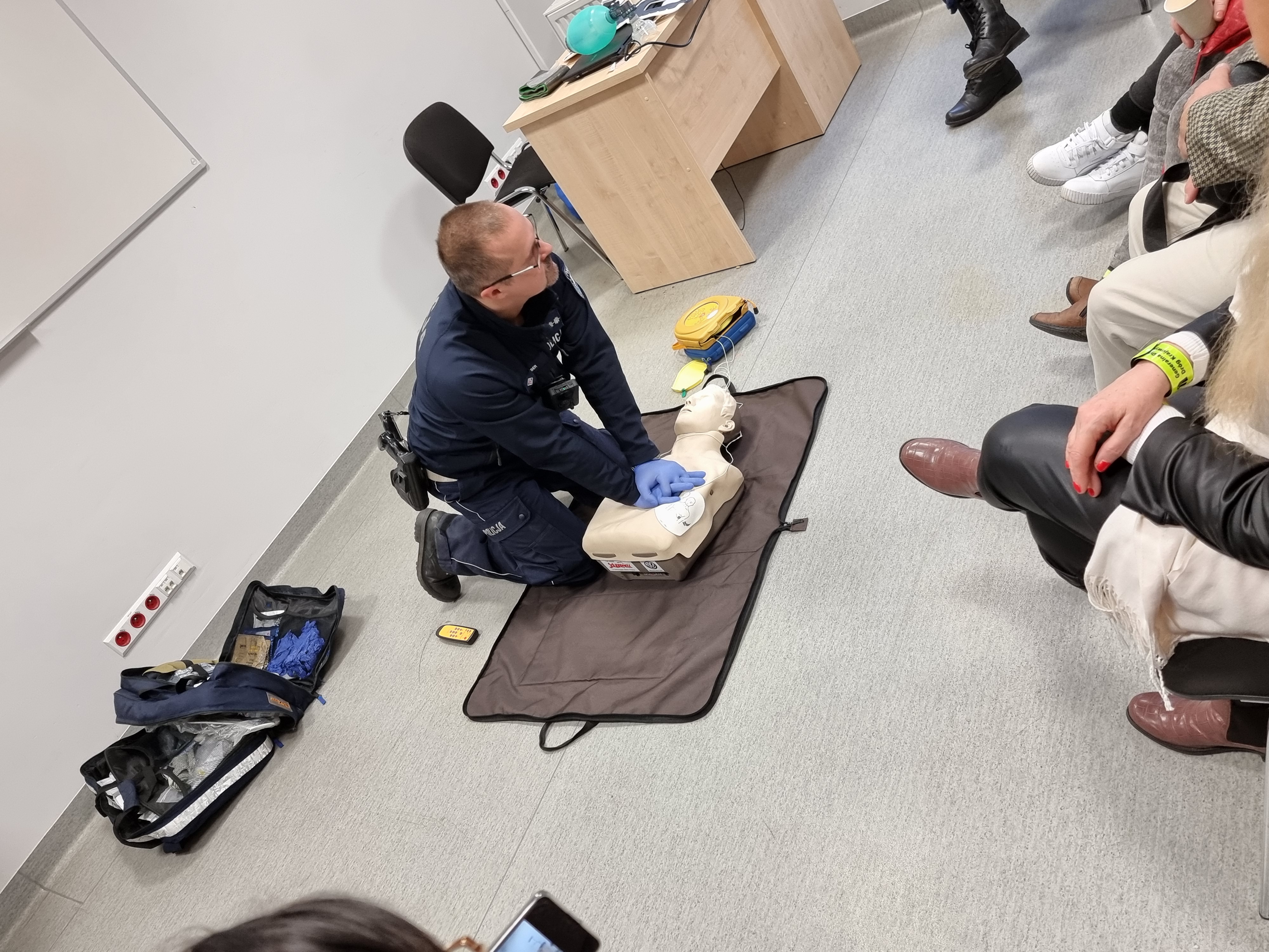 Policjanci oprowadzili gości po budynku komendy, gdzie można było zajrzeć na stanowisko dyżurnego i zobaczyć jak wygląda codzienna praca policjantów z Wydziału Ruchu Drogowego. Zaprezentowany został także sprzęt wykorzystywany do pracy w terenie. Dużym zainteresowaniem cieszył się pokaz udzielania pierwszej pomocy przedmedycznej. Policjant opowiadając szczegółowo o zasadach pierwszej pomocy zwrócił uwagę, co jest najważniejsze w pierwszych chwilach, gdy mamy do czynienia z osobą poszkodowaną. Przypomniał o najistotniejszych sprawach podczas łączenia z numerem alarmowym 112 oraz o roli jaką spełniają w życiu codziennym urządzenia AED.