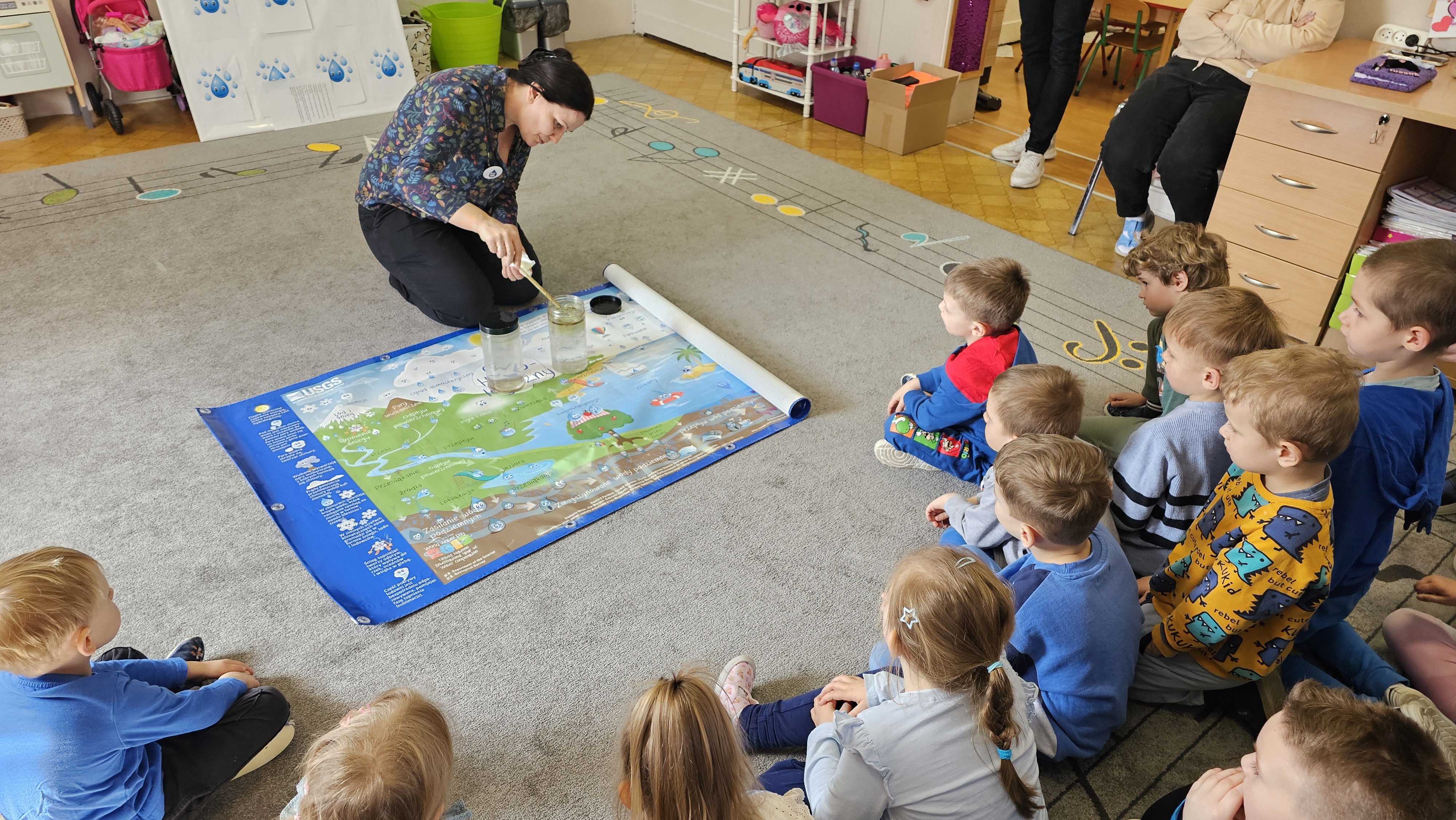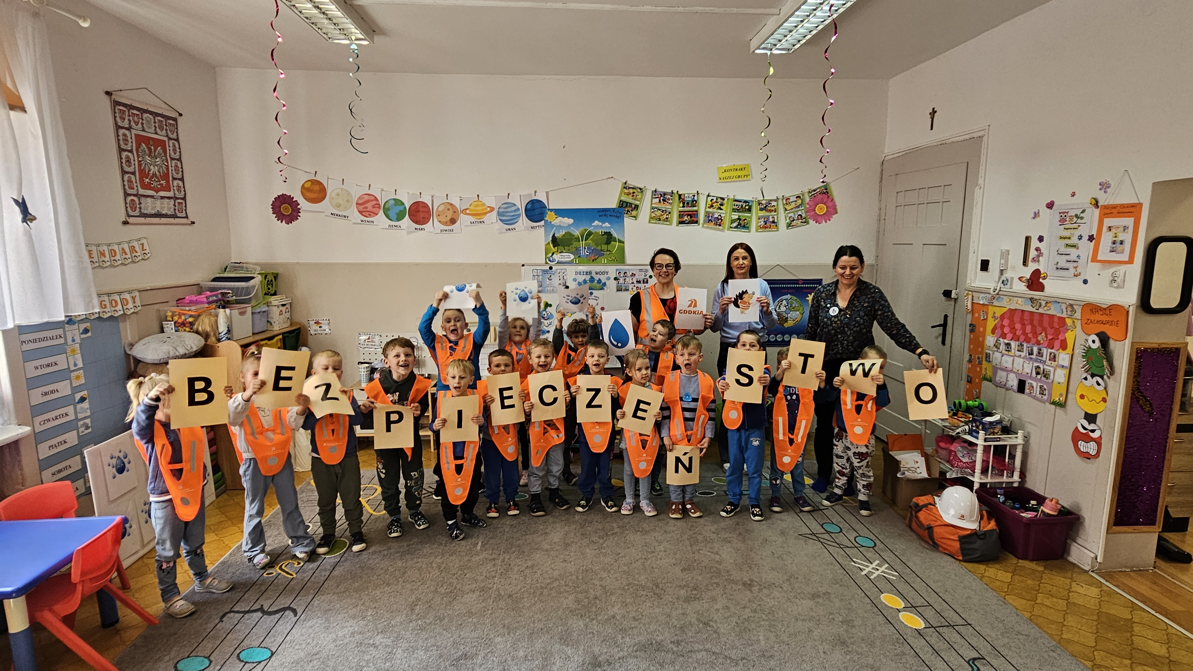 Dzieci wyruszyły w podróż do świata wody, odkrywając jej ukryte moce i znaczenie dla życia na Ziemi. Podczas zajęć pokazaliśmy, jak drogowcy troszczą się o czystość wód opadowych i chronią ich zasoby. Dużą frajdę dzieciom sprawiły eksperymenty oraz zabawa z wędrującą kroplą. Podczas naszego spotkania rozmawialiśmy też z najmłodszymi o bezpieczeństwie na drodze, ucząc, jak mądrze poruszać się w ruchu ulicznym i na co zwracać uwagę, by każda podróż – nawet ta najkrótsza – była bezpieczna.