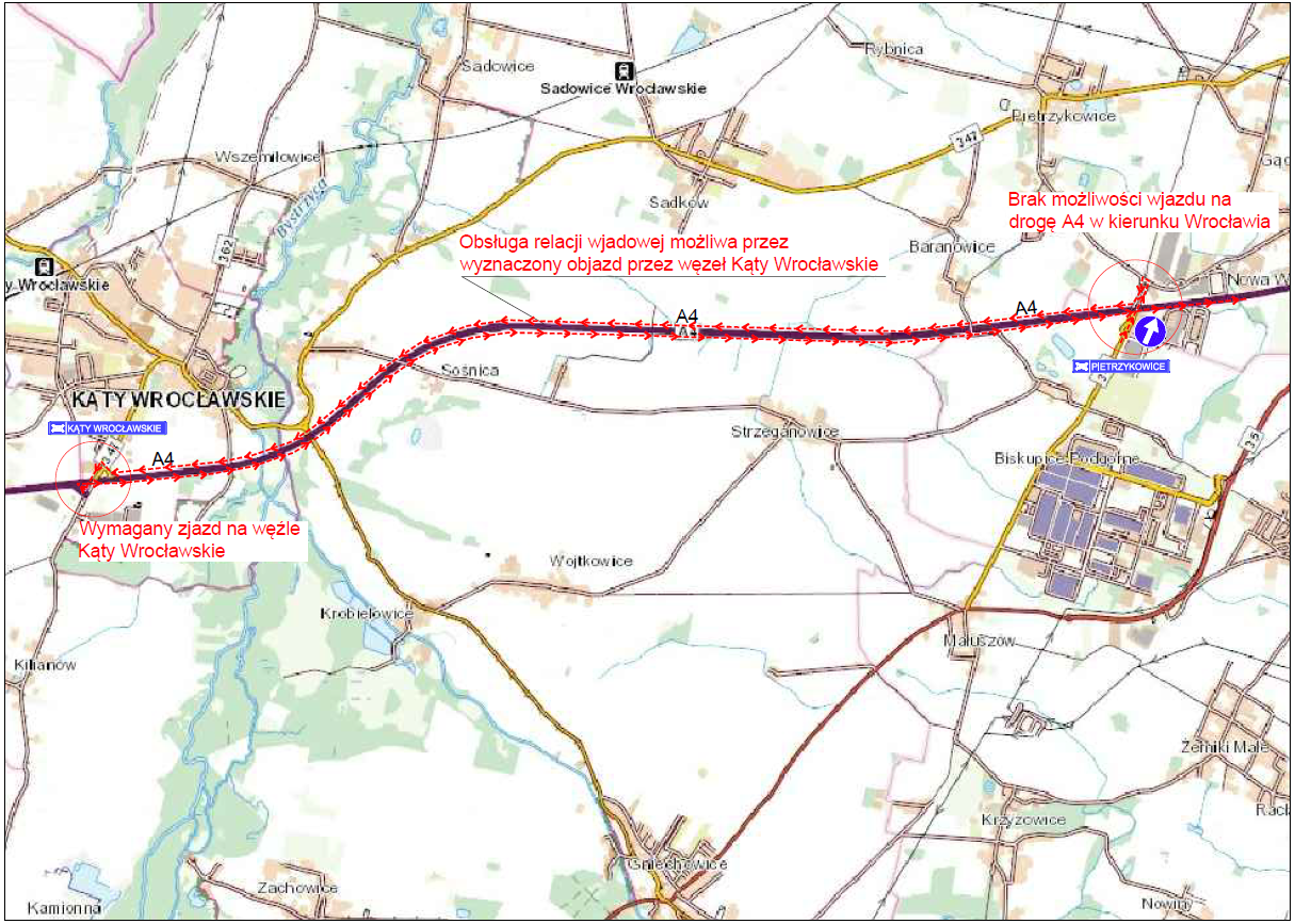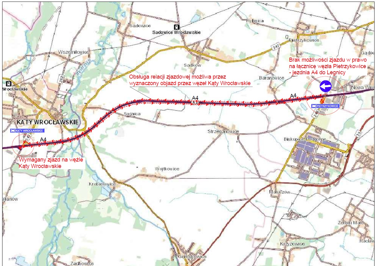Jadąc jezdnią w kierunku Zgorzelca, nie zjedziemy na węźle Pietrzykowice. Objazd będzie poprowadzony autostradą A4 do węzła Kąty Wrocławskie, na którym należy zawrócić na A4 w kierunku Wrocławia.