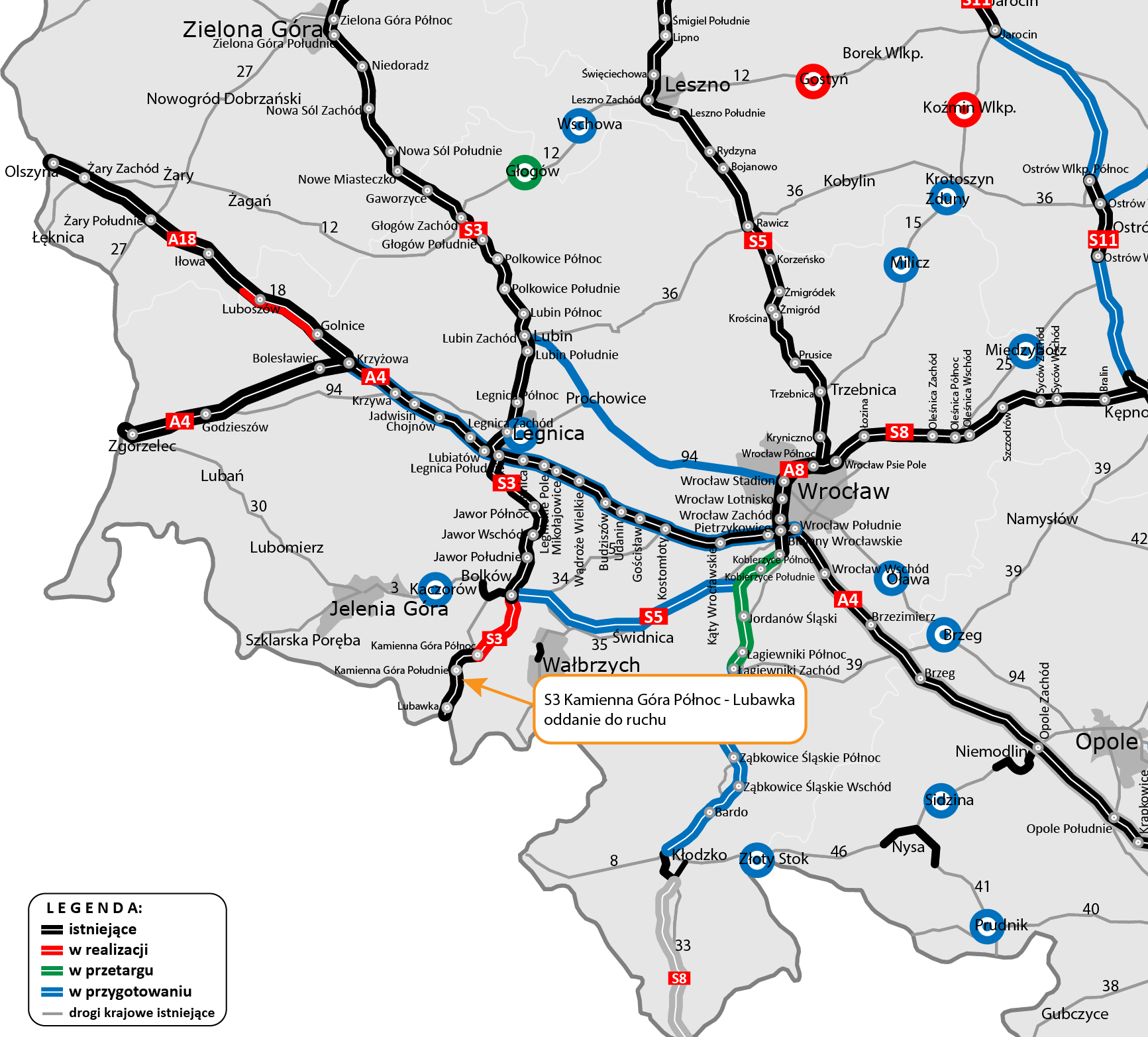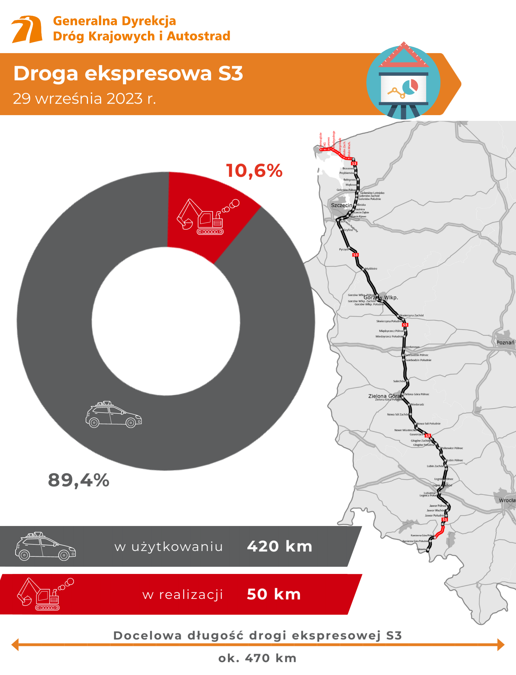 W realizacji pozostaje jeszcze łącznie 50 km drogi ekspresowej S3 pomiędzy Świnoujściem a Troszynem w woj. zachodniopomorskim oraz pomiędzy Bolkowem a Kamienną Górą na Dolnym Śląsku. Udostępnienie tych odcinków do ruchu planowane jest w przyszłym roku. Docelowo droga ekspresowa S3 na terenie naszego kraju będzie miała 470 km.