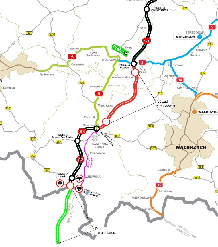 W przyszłym roku udostępniony do ruchu zostanie odcinek Bolków - Kamienna Góra. Do tego czasu wjazd od północy na oddany dziś odcinek będzie możliwy z DK5 na węźle Kamienna Góra Północ. Na kolejnym węźle tj. Kamienna Góra Południe dostępne będą wszystkie relacje dla kierujących. Na ostatnim węźle Lubawka, z uwagi na brak kontynuacji drogi szybkiego ruchu po stronie czeskiej, pojazdy zostaną przekierowane na drogę wojewódzką nr 369 (DW369).